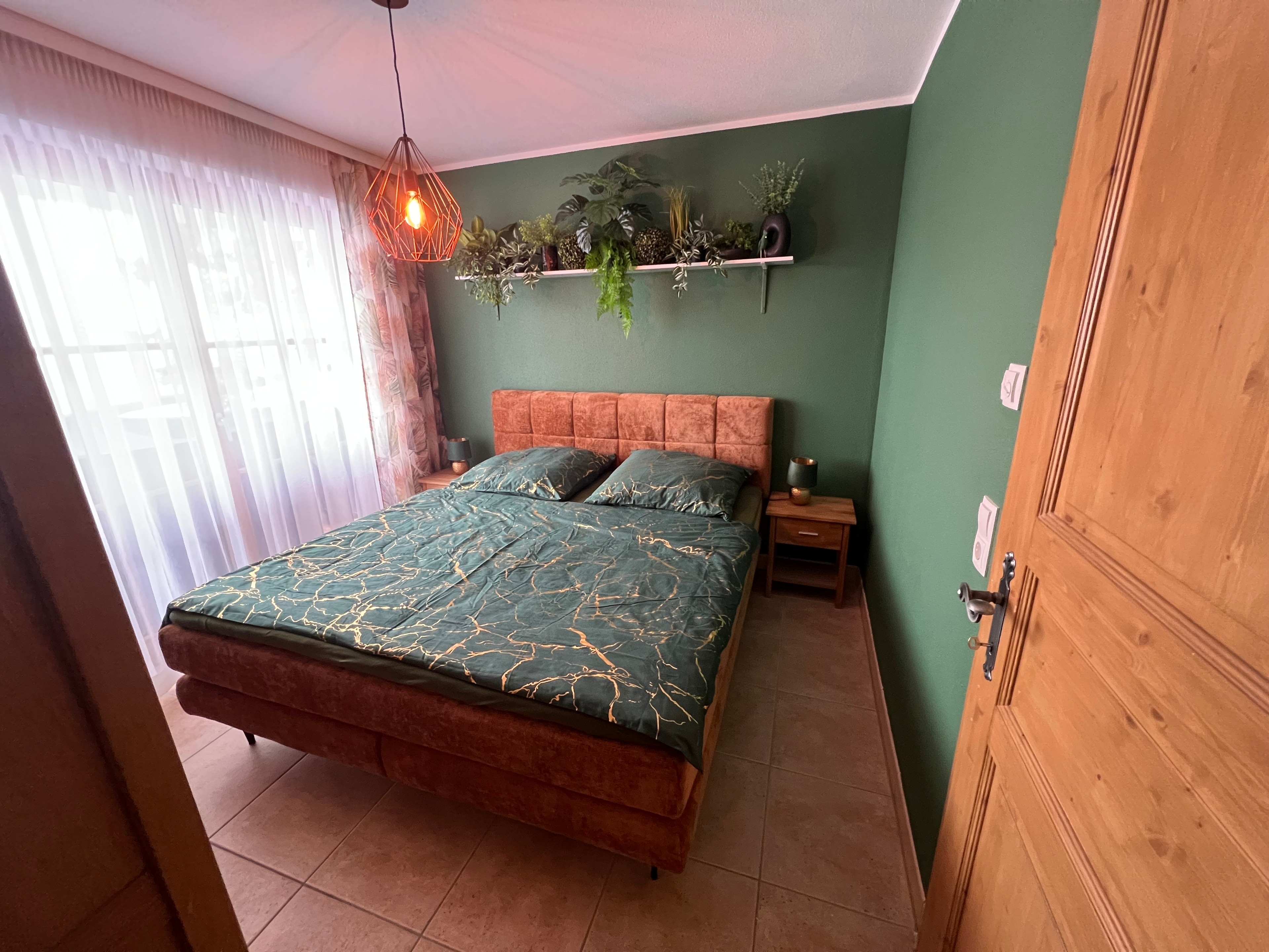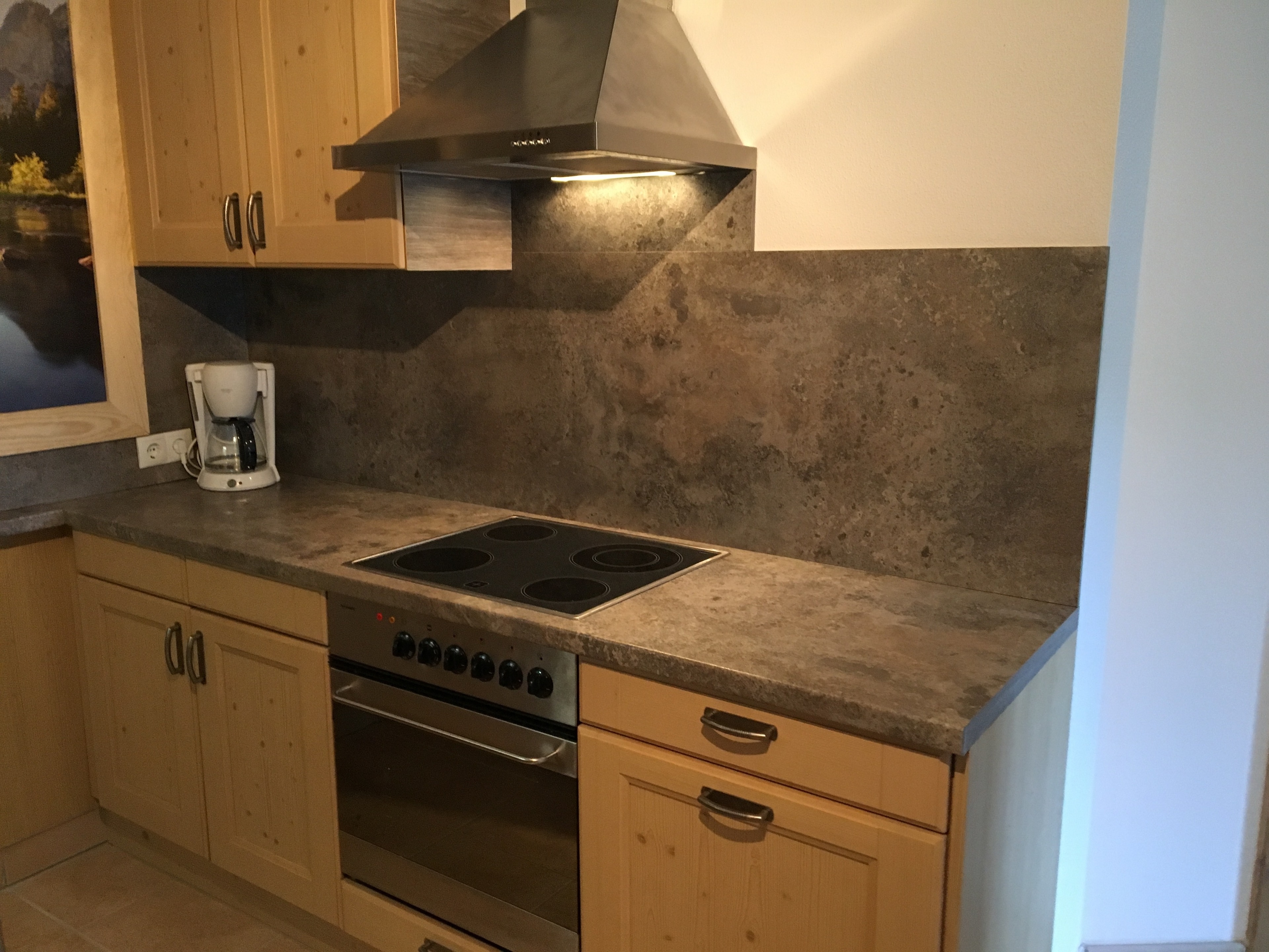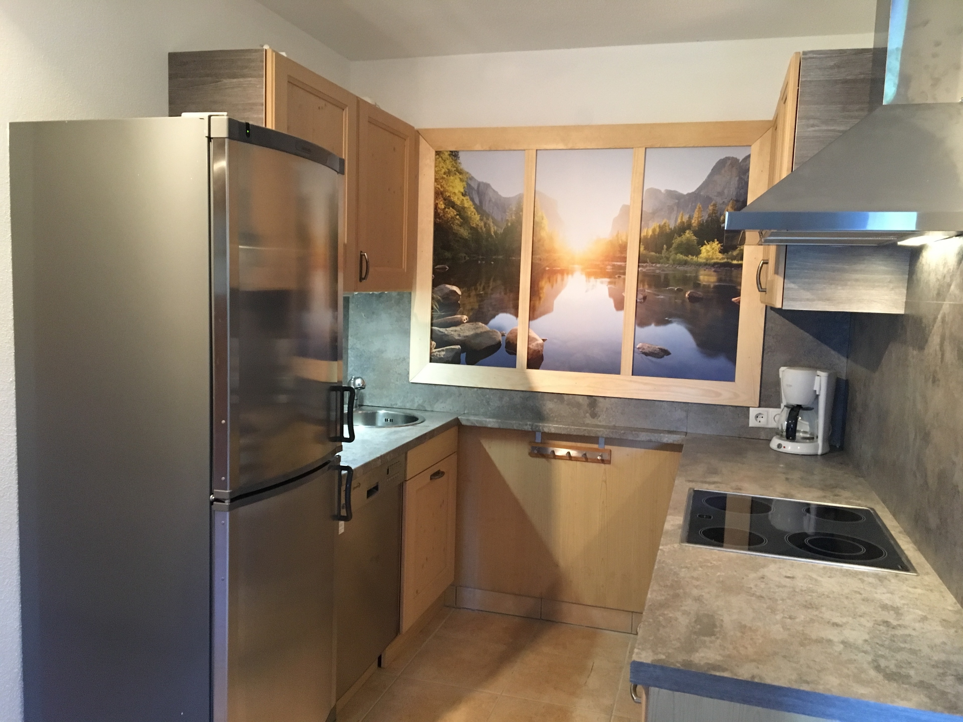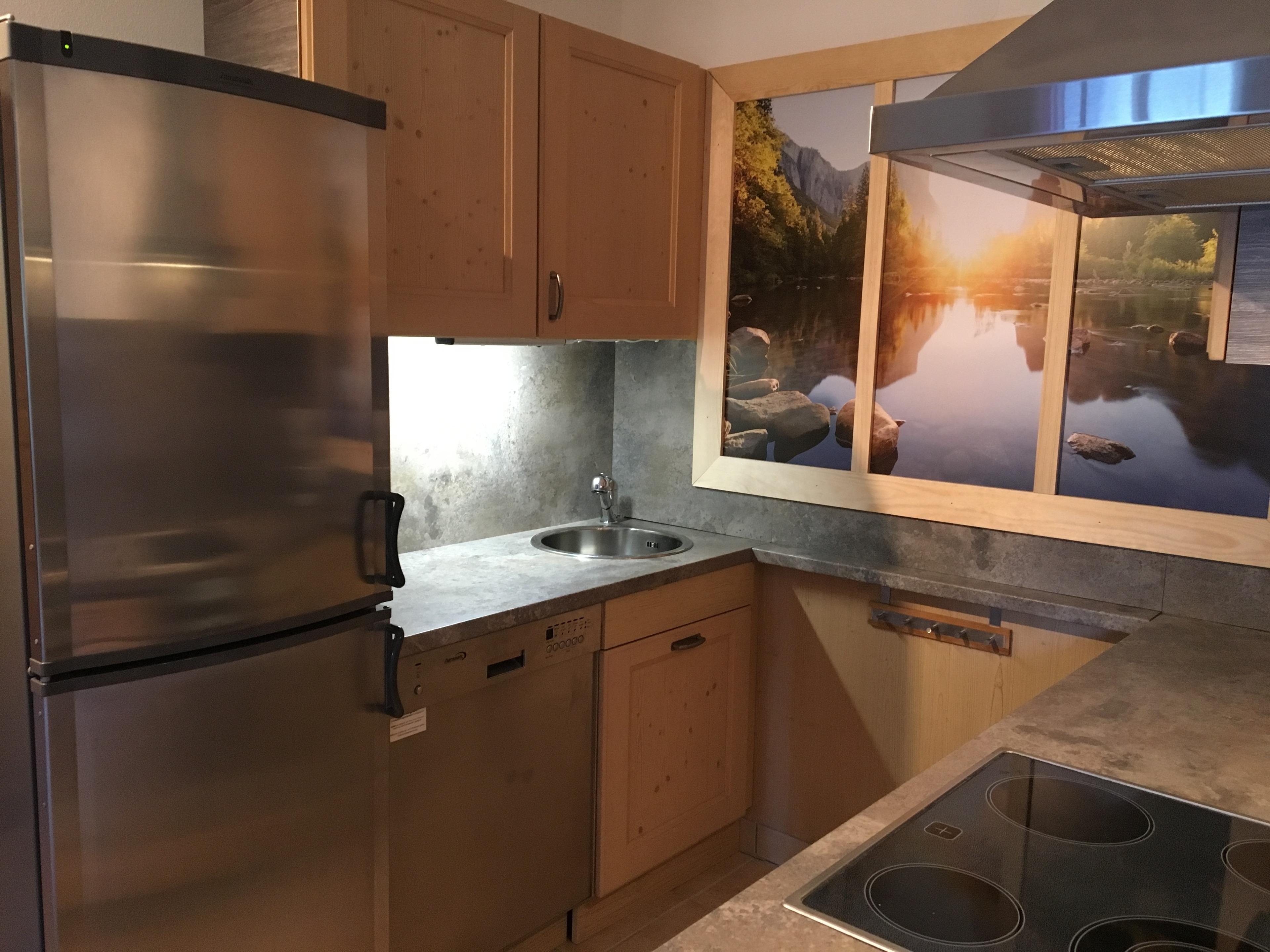 Die Küche ist voll ausgestattet mit Herd, Backofen, Mikrowelle, großen Kühlschrank, extra Gefrierschrank, Spüle und Geschirrspülmaschine. Natürlich ist alles notwendige Geschirr vorhanden.
