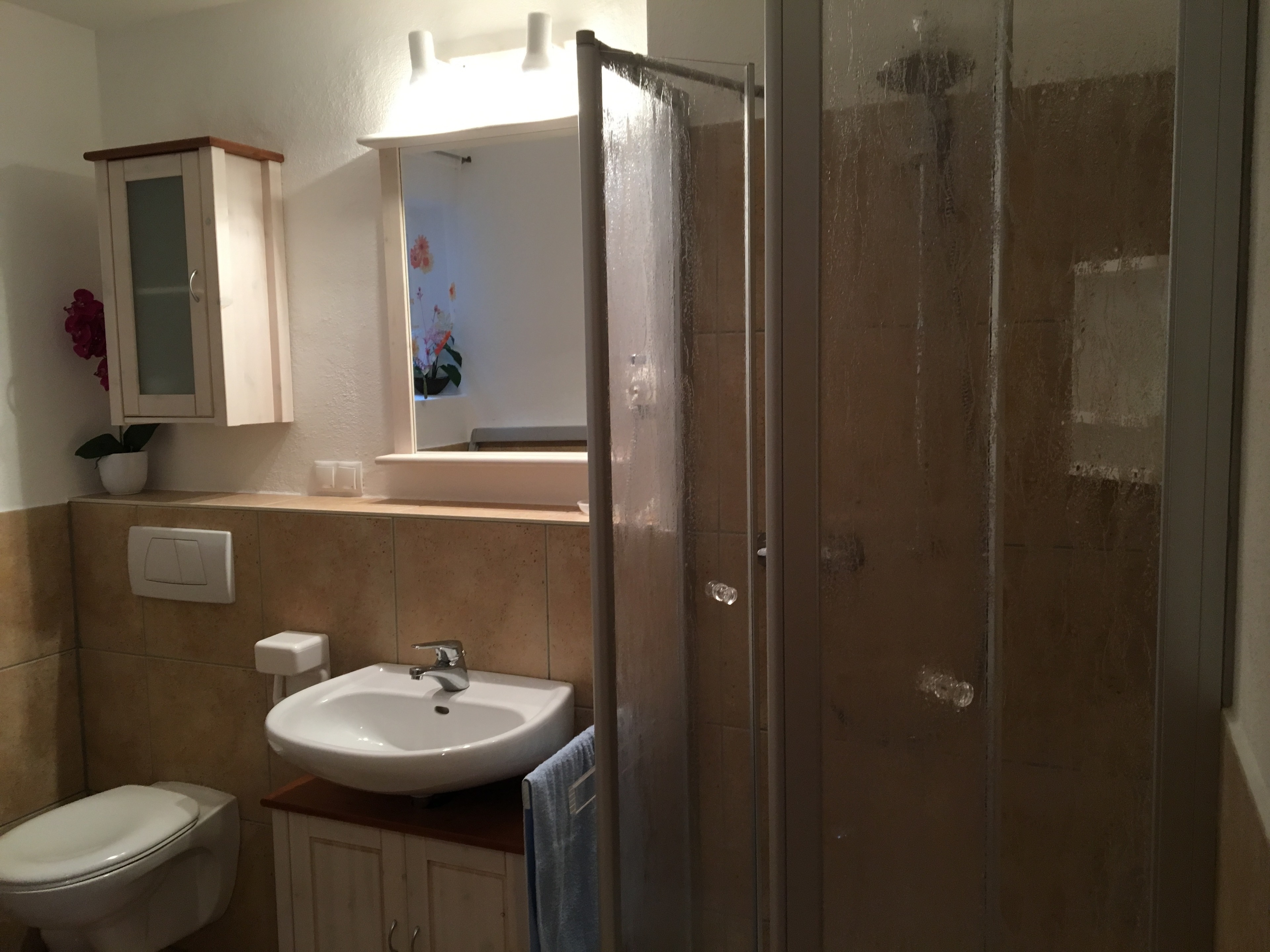 Im Bad befinden sich Toillette, Waschtisch und eine Eckdusche.