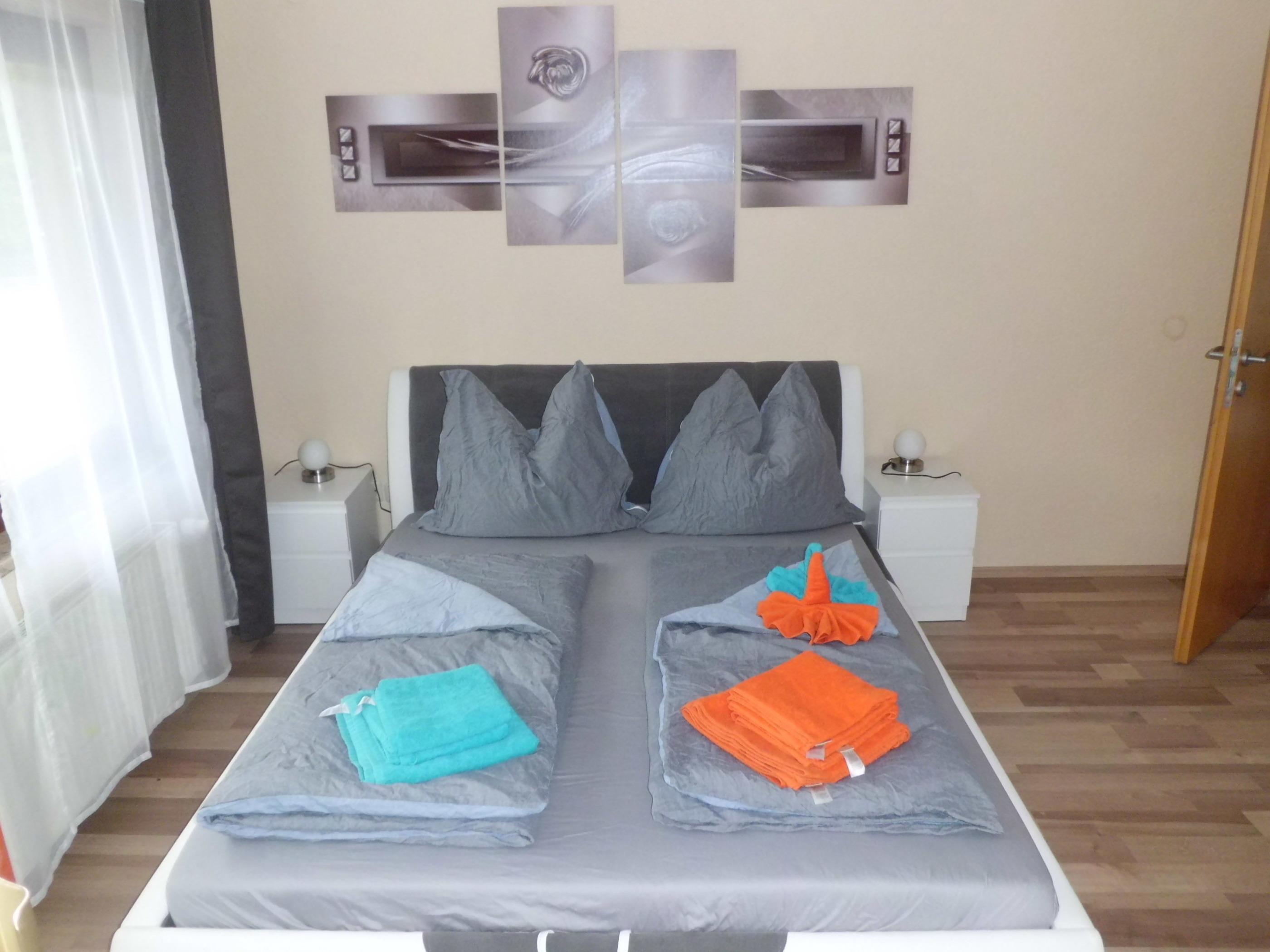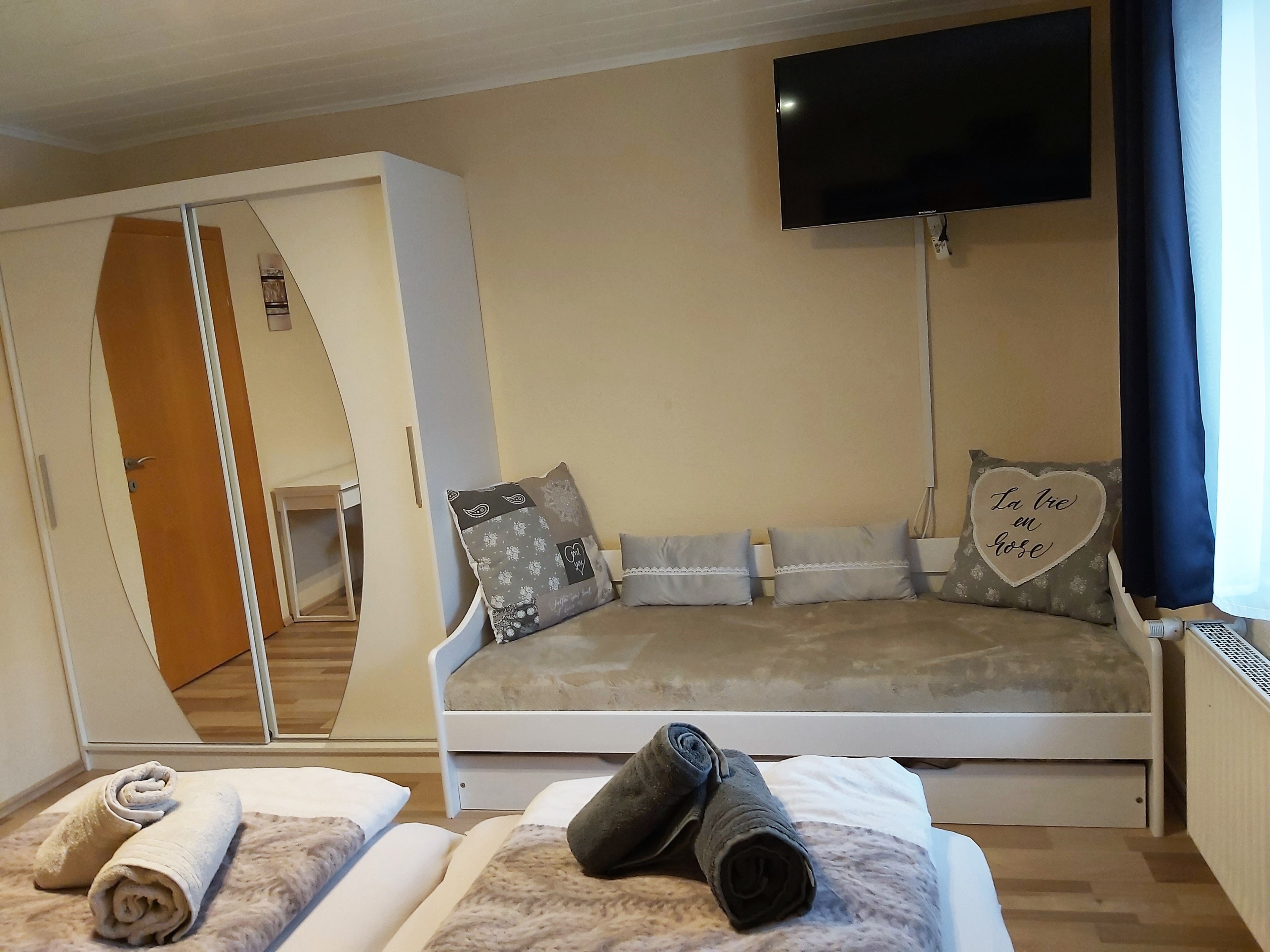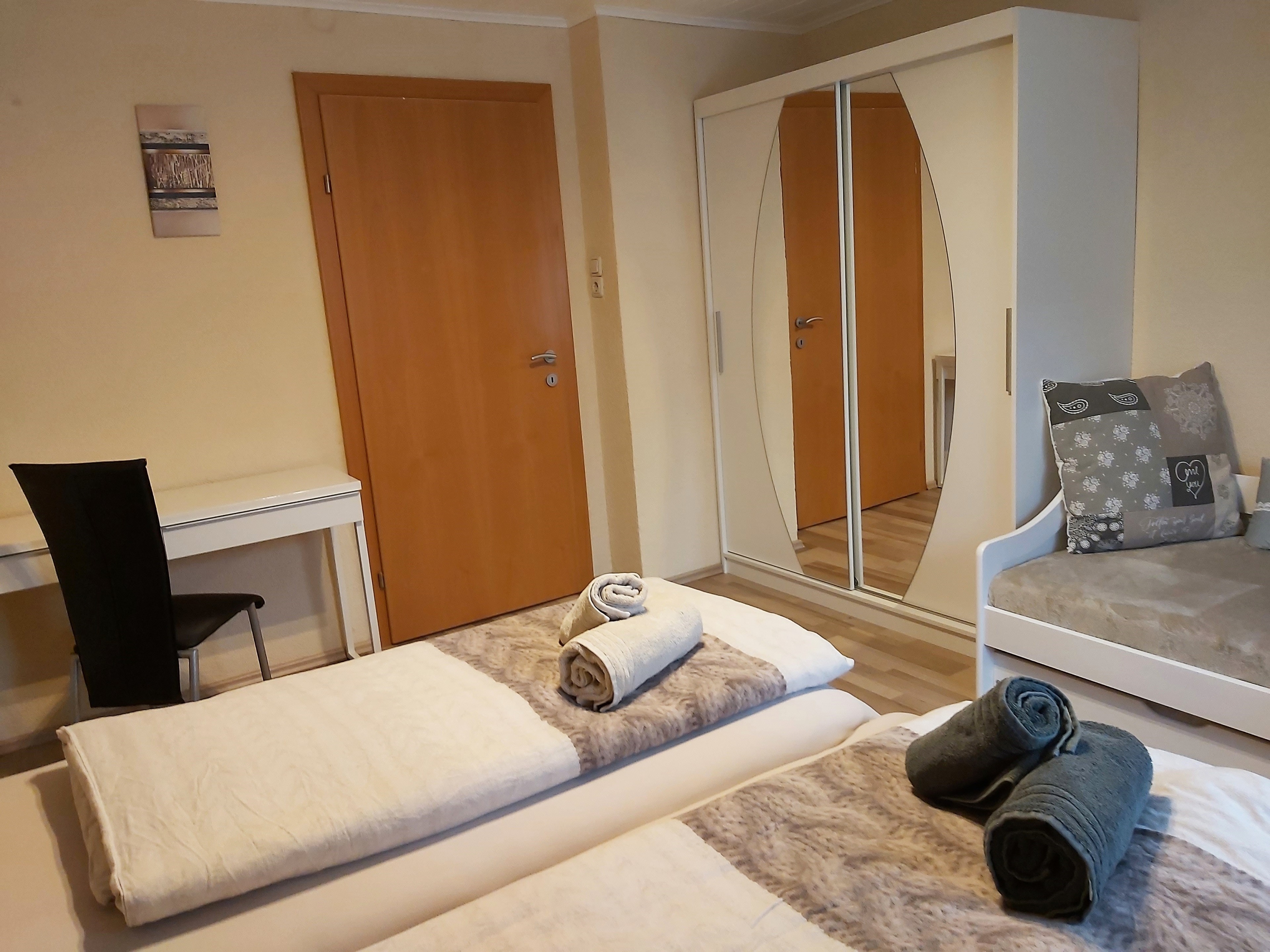 Die 2 Schlafzimmer sind mit Doppelbetten, Kleiderschrank, Herrendiener und Fernseher ausgestattet. Ein Schlafzimmer verfügt zudem über einen Schreibtisch, das andere über einen Schminktisch.