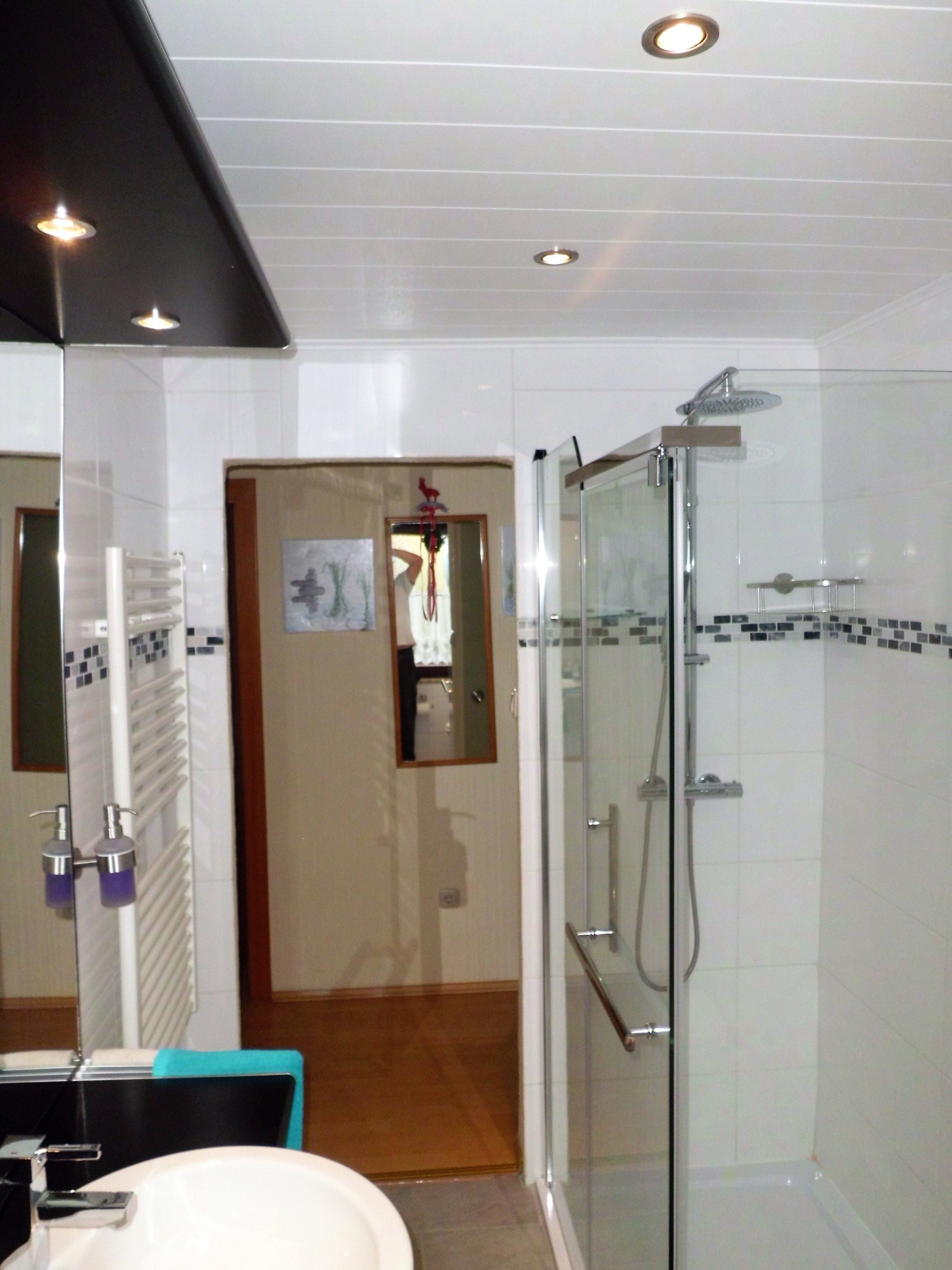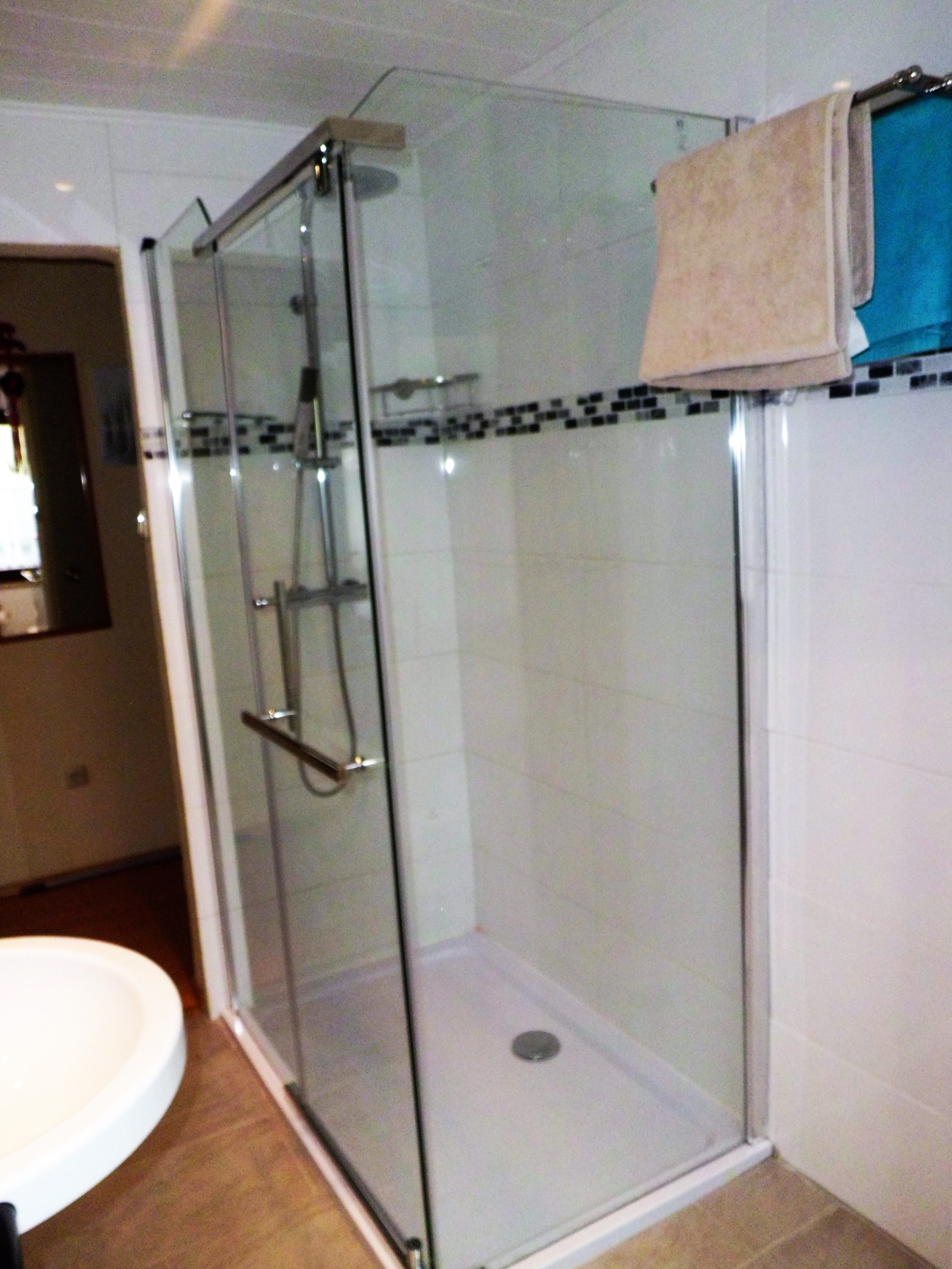 Das Bad ist sehr modern gehalten und hat eine grosse Dusche, sowie eine schöne Waschtischgarnitur und WC.