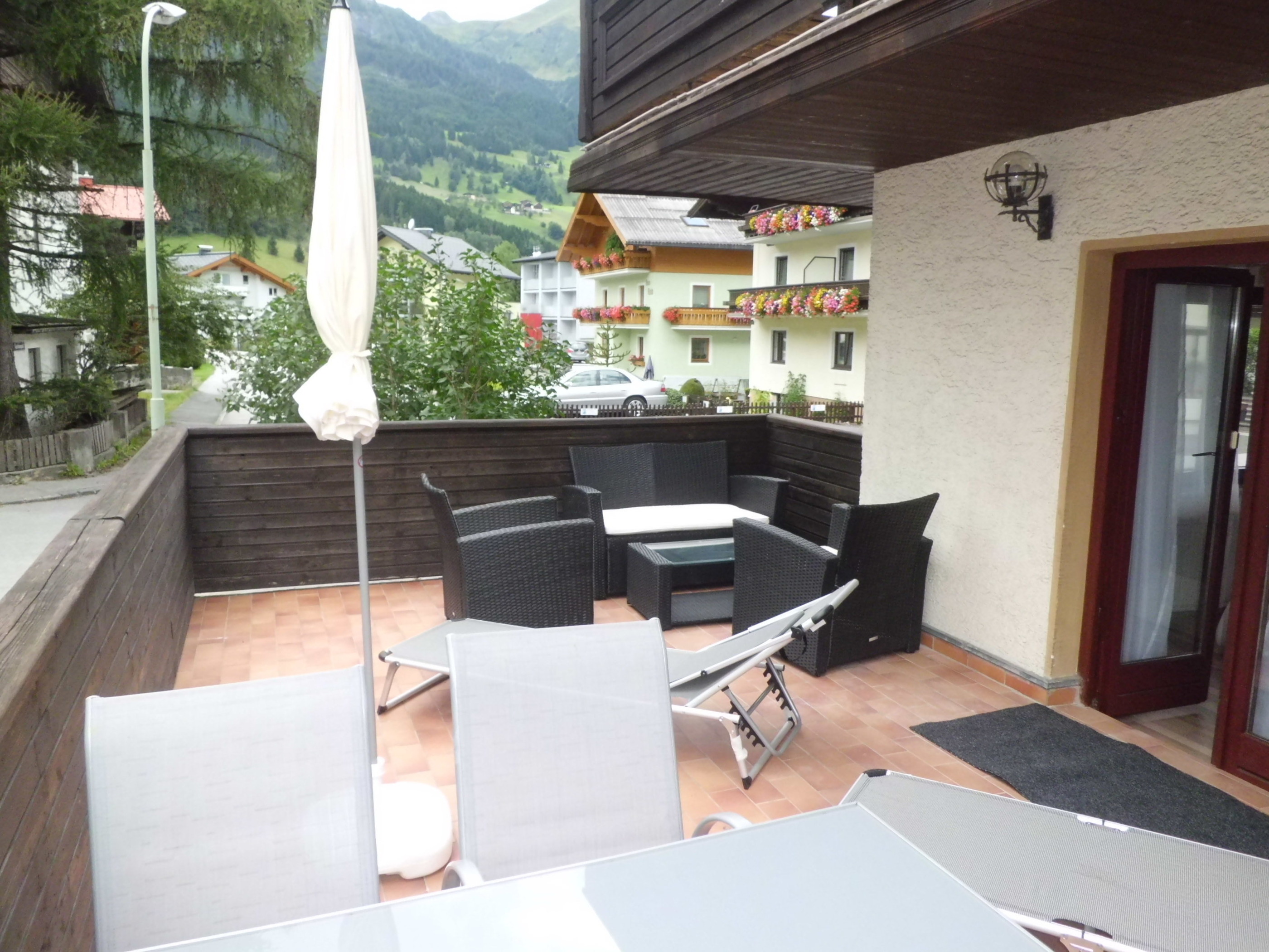 Die 20 qm große Terasse verfügt über eine Sitzgarnitur, Sonnenliegen und Sonnenschirm.