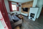 Im Wohnbereich entspannen Sie auf einer gemütlichen Couch, mit Blick auf den 55er Sony Flat, der an einer stylischen Altholzwand hängt.