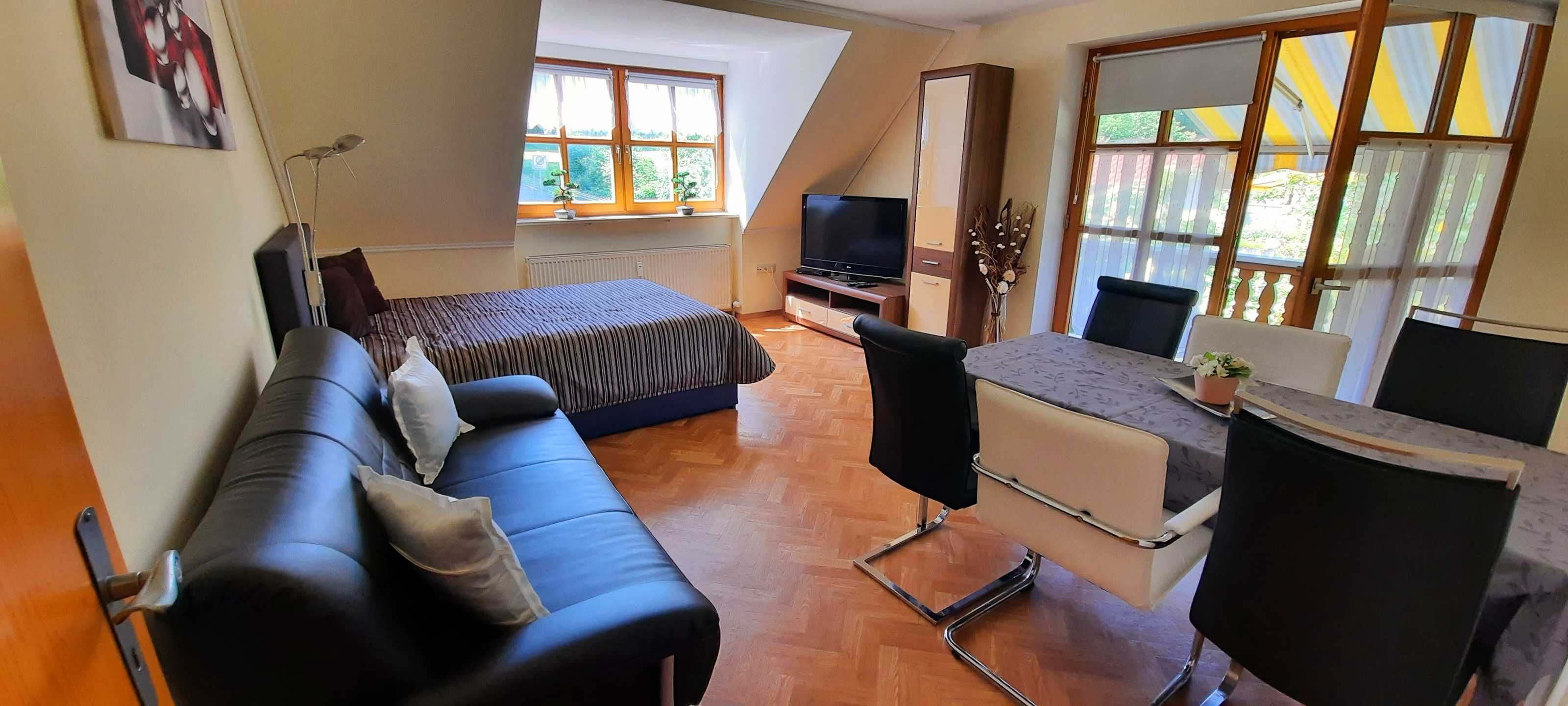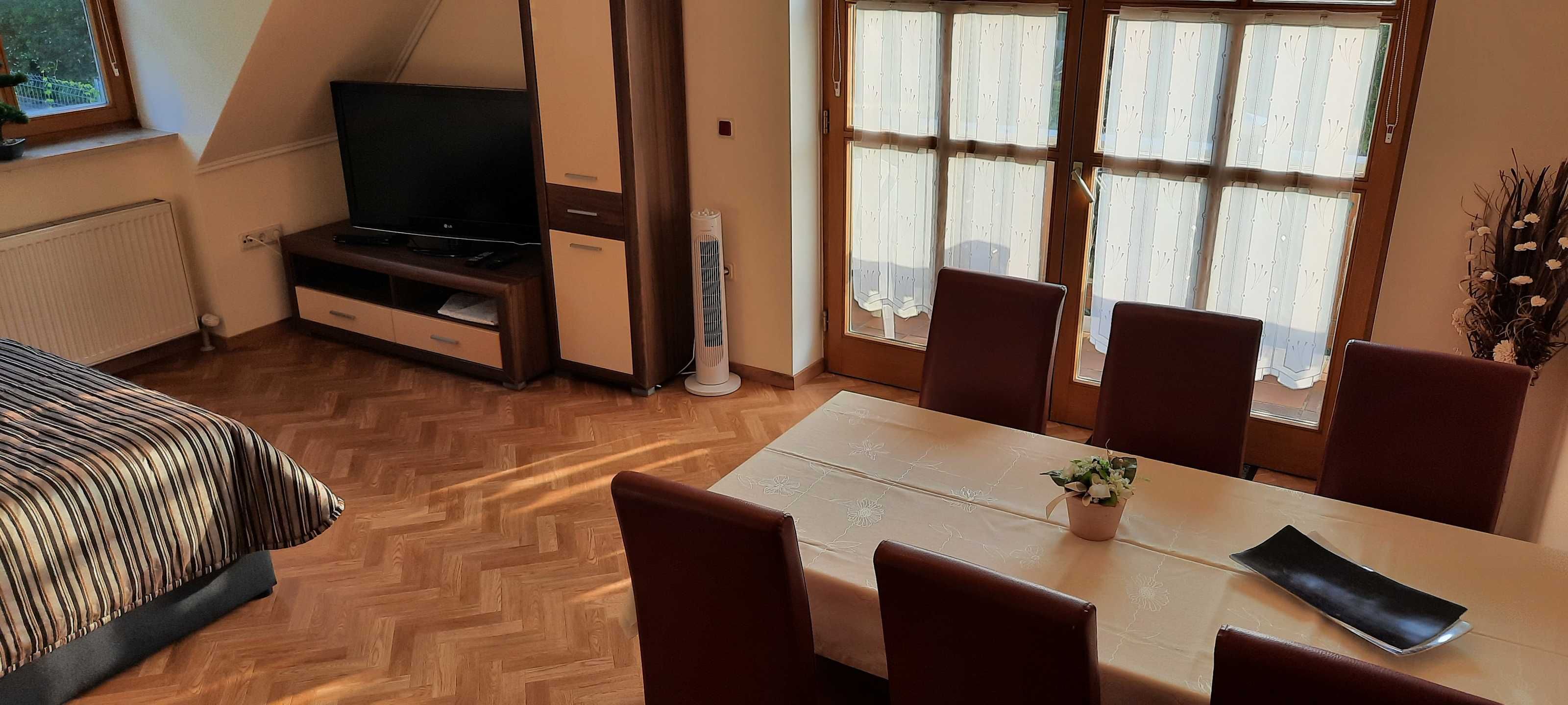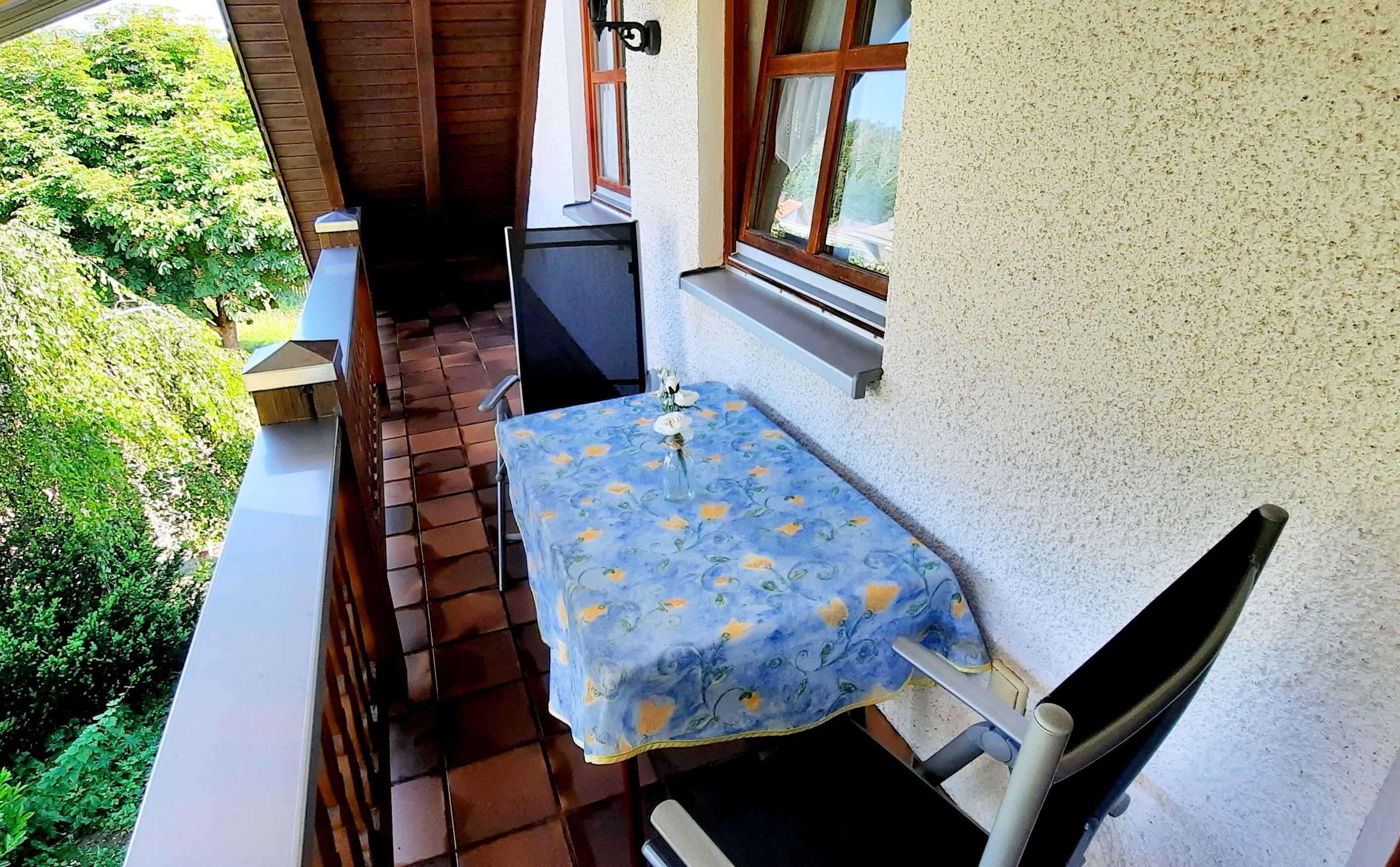 Die gemütliche komfortable eingerichtete Ferienwohnung FrankenOase besitzt einen großen Balkon, Ausrichtung nach Süden/ Westen und einen Panoramablick auf die umliegende Landschaft.