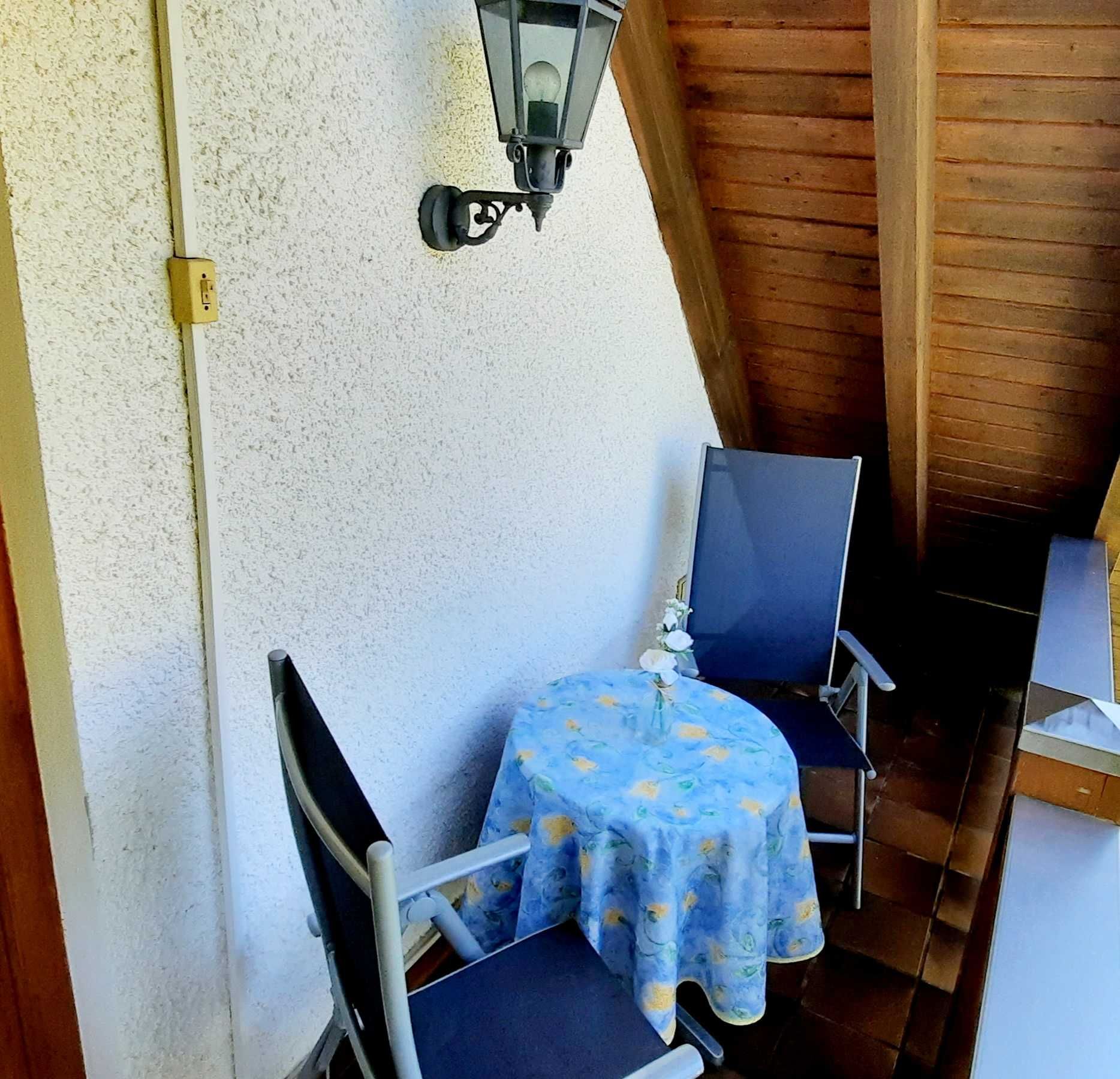 Die Ferienwohnung bietet direkten Zugang auf den überdachten Balkon, der nach einem langen Tag zur Entspannung bei einem Glas Wein einladet.