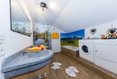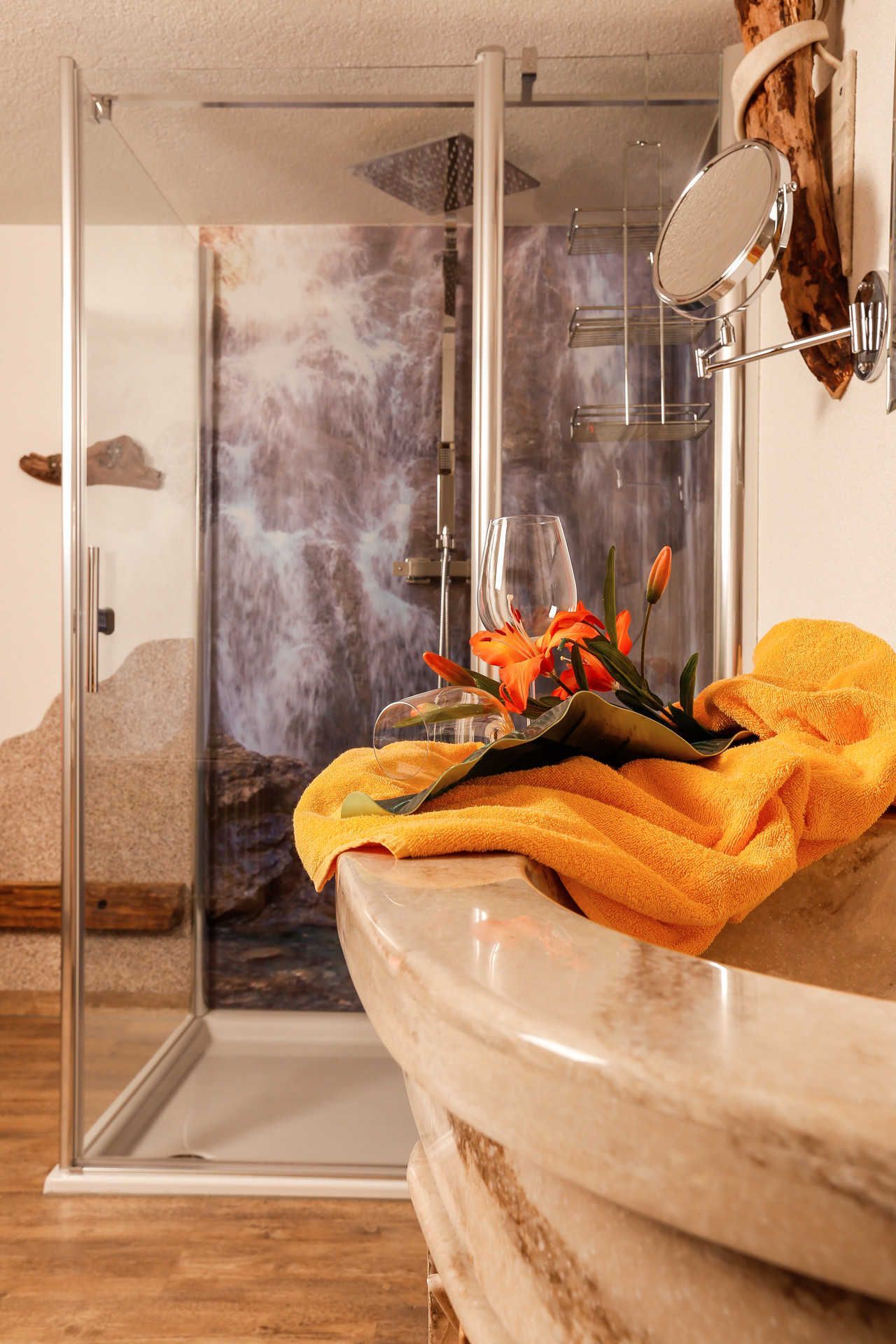 Oder die Romantiksuite mit 110m², ebenfalls vom Haustischler eingerichtet, von der Decke bis zum Bett, aus Altholz. Einzigartiger Wohnstil, den man so nicht überall findet.