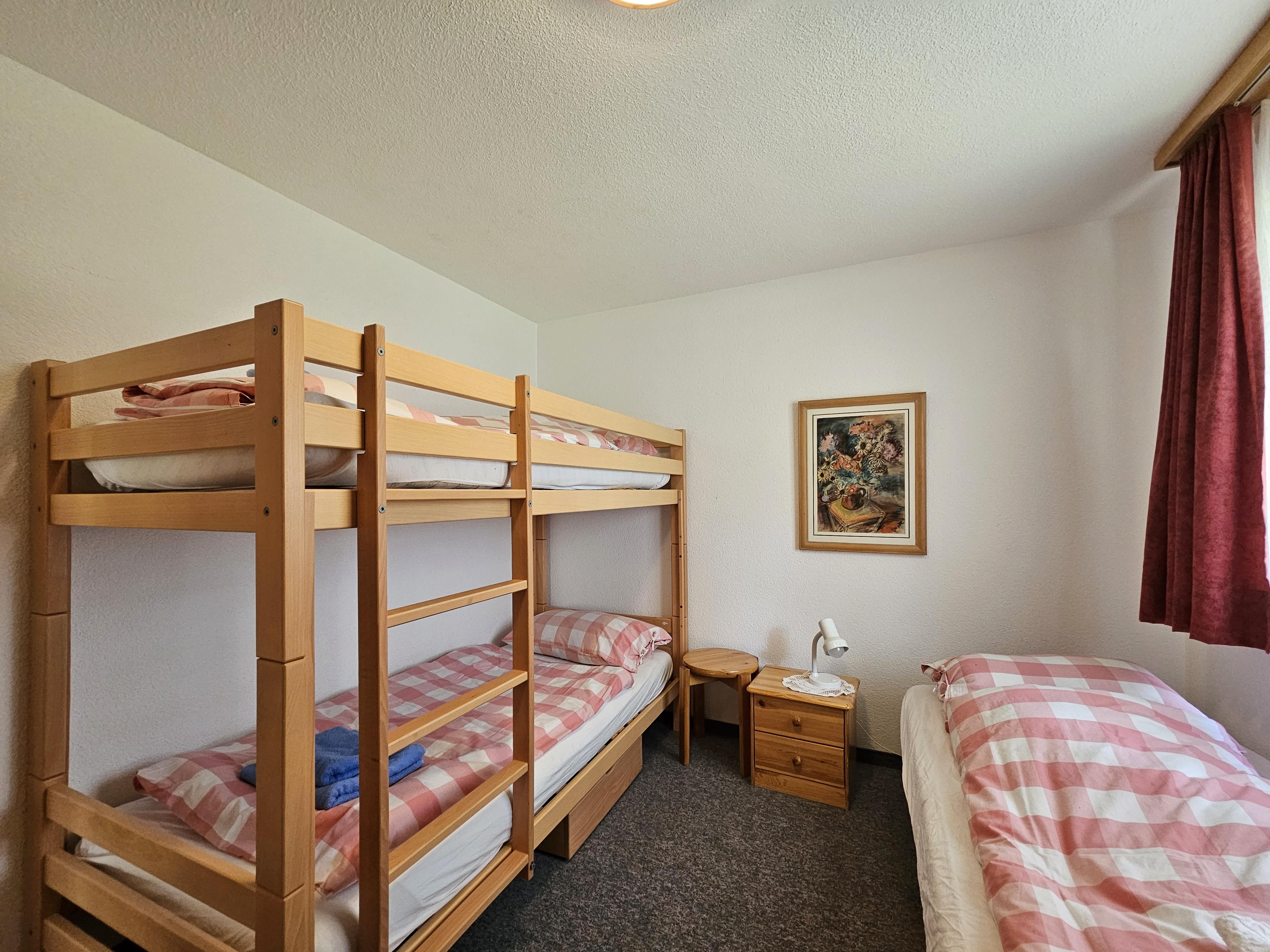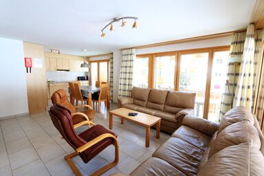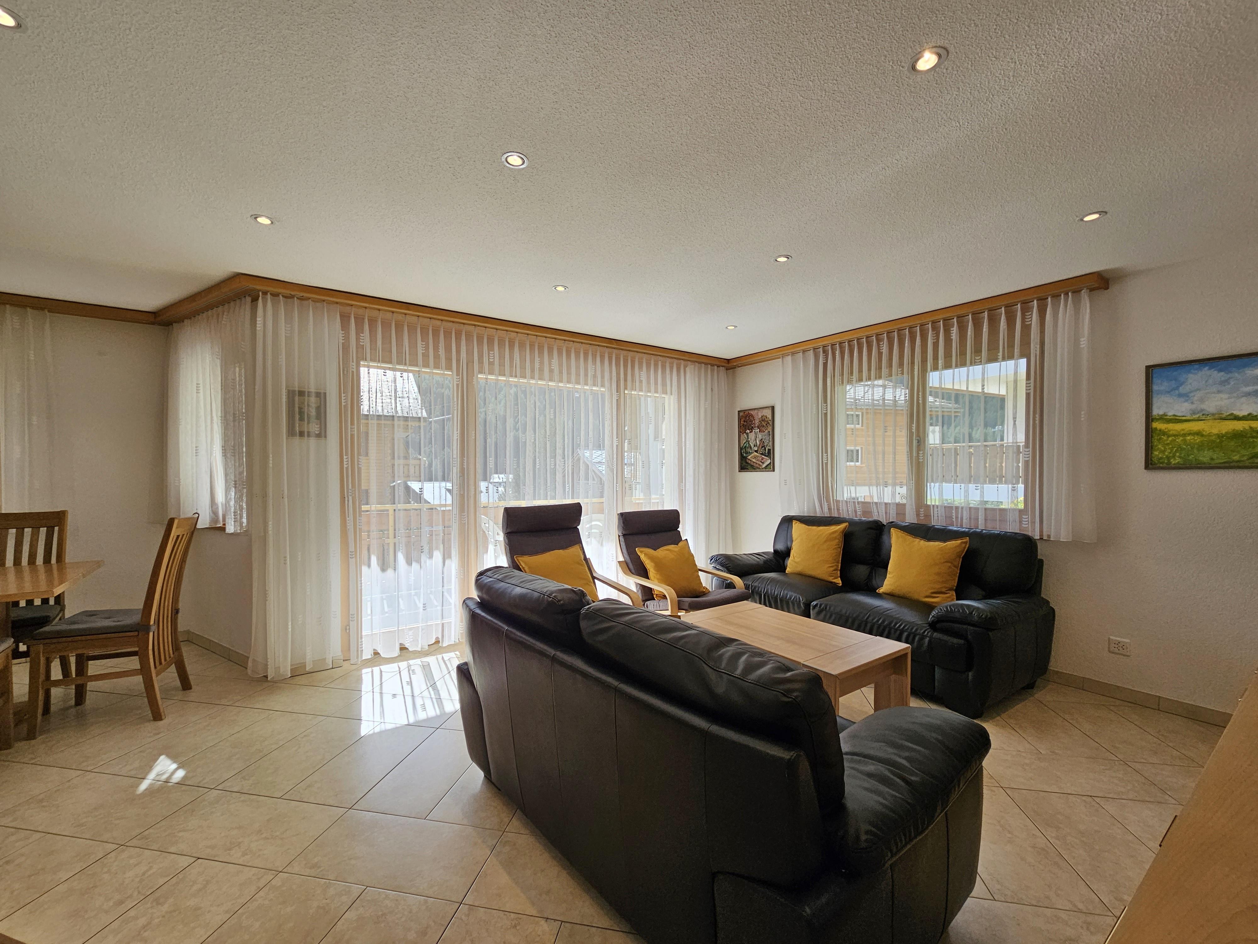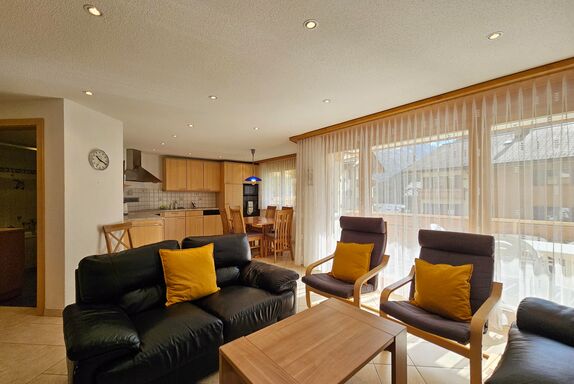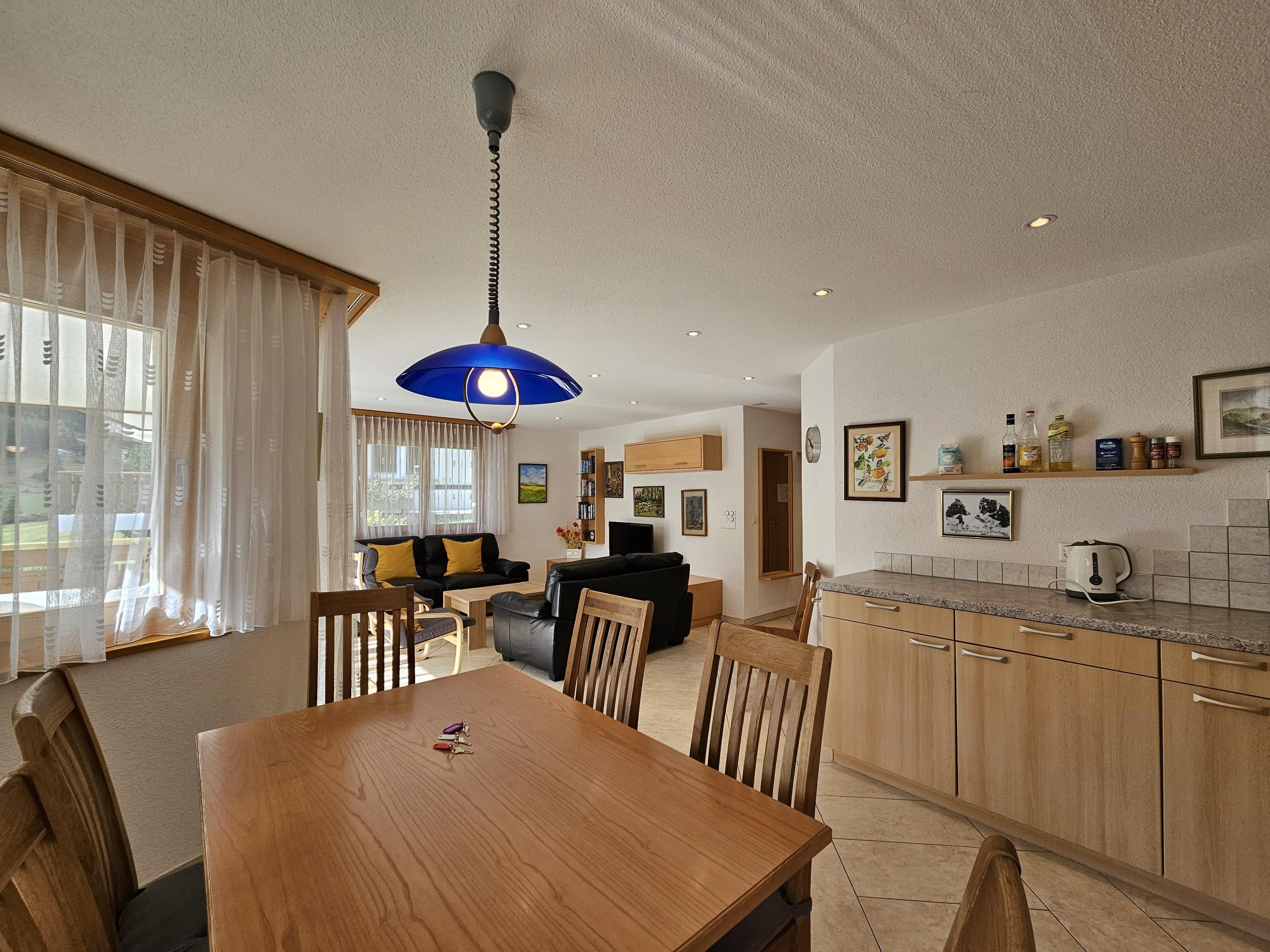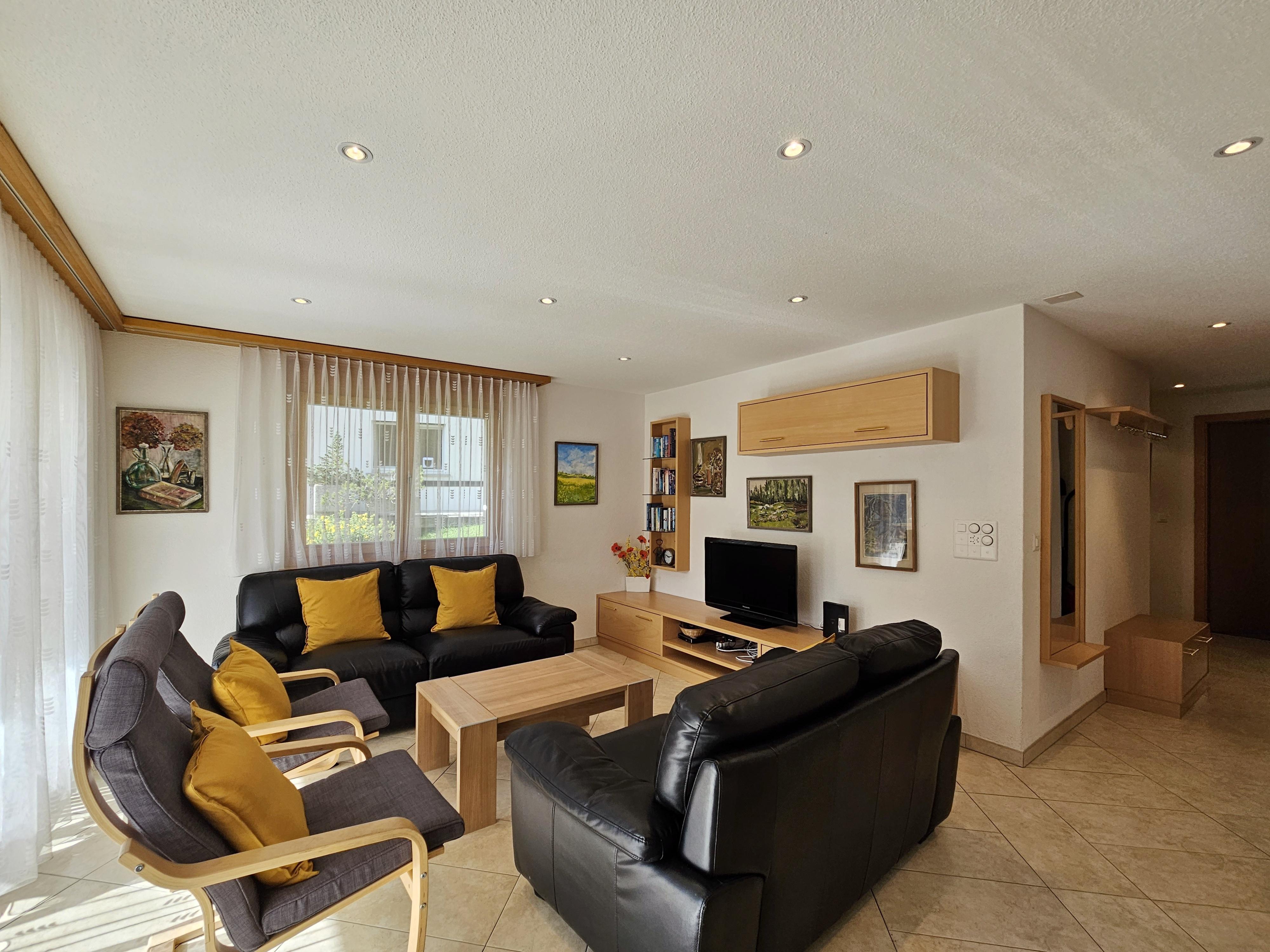 Schöne, moderne 4-Zimmerwohnung im Hochparterre. 1 Schlafzimmer mit 2 Betten, 1 Zimmer mit Doppelbett, 1 Schlafzimmer mit einem Etagen- und mit einem normalen Bett. 1x Dusche mit WC. 1x Bad mit WC. Grosszügiger Wohnraum mit offener, komplet eingerichteter Küche inkl. Geschirrspüler. Schöne Aussicht auf das Dorf und die Berge. Süd-West Balkon beim Wohnzimmer, grosser Gartensitzplatz mit Terrasse beim Schlafzimmer.