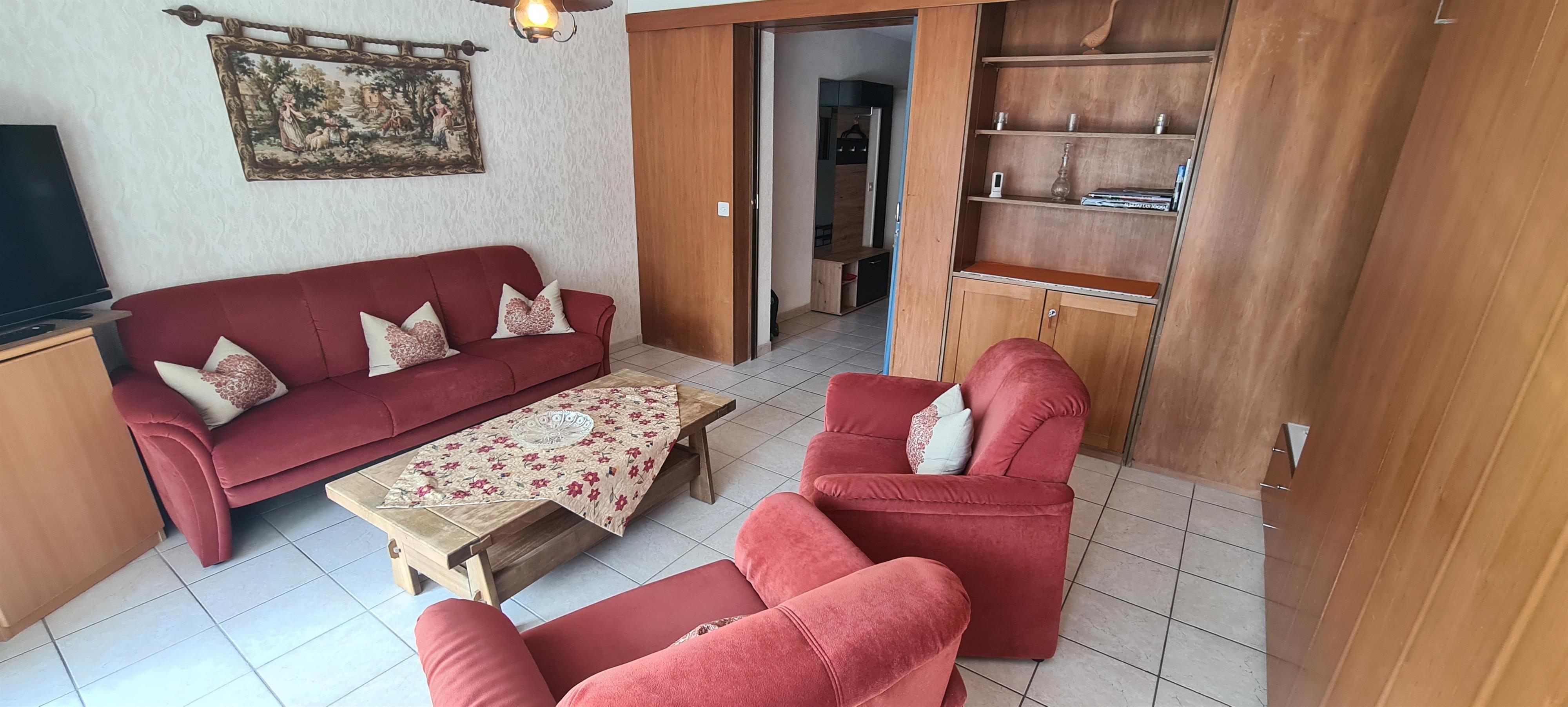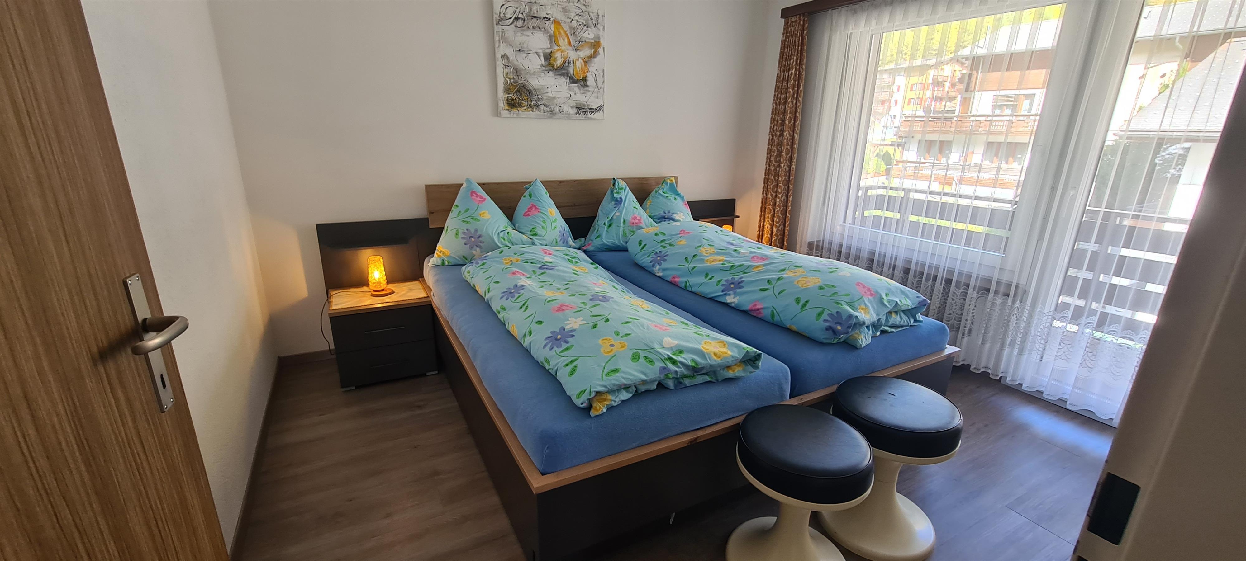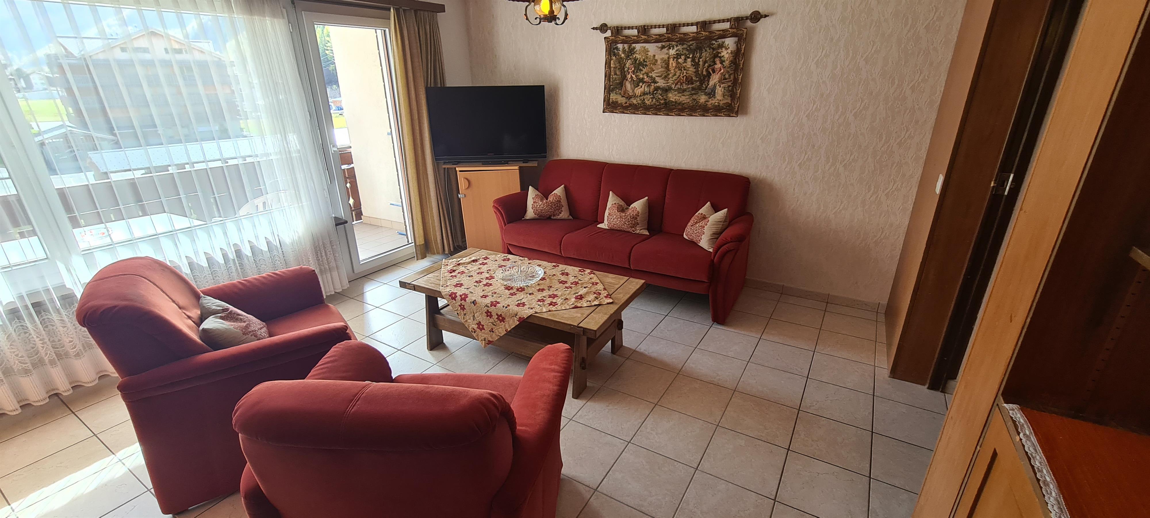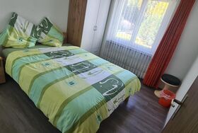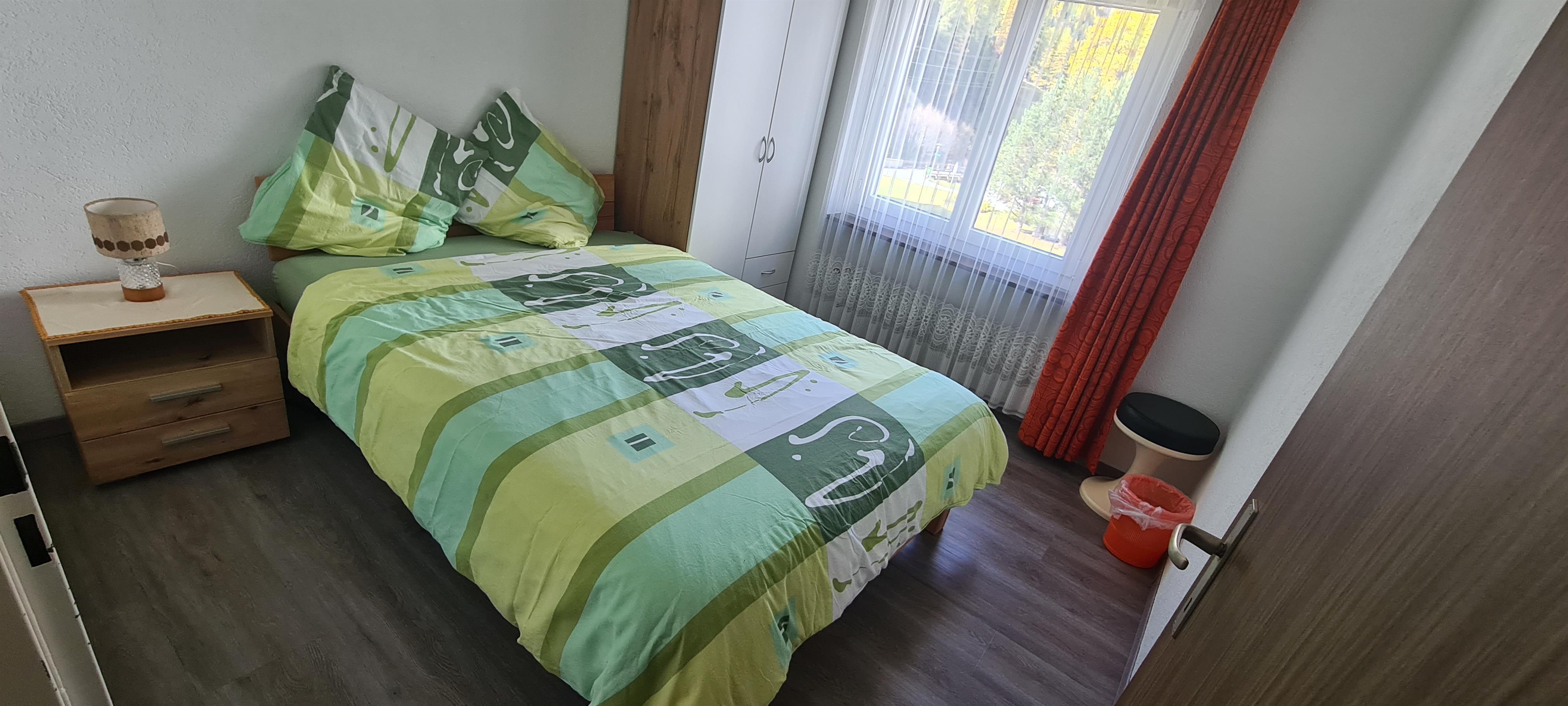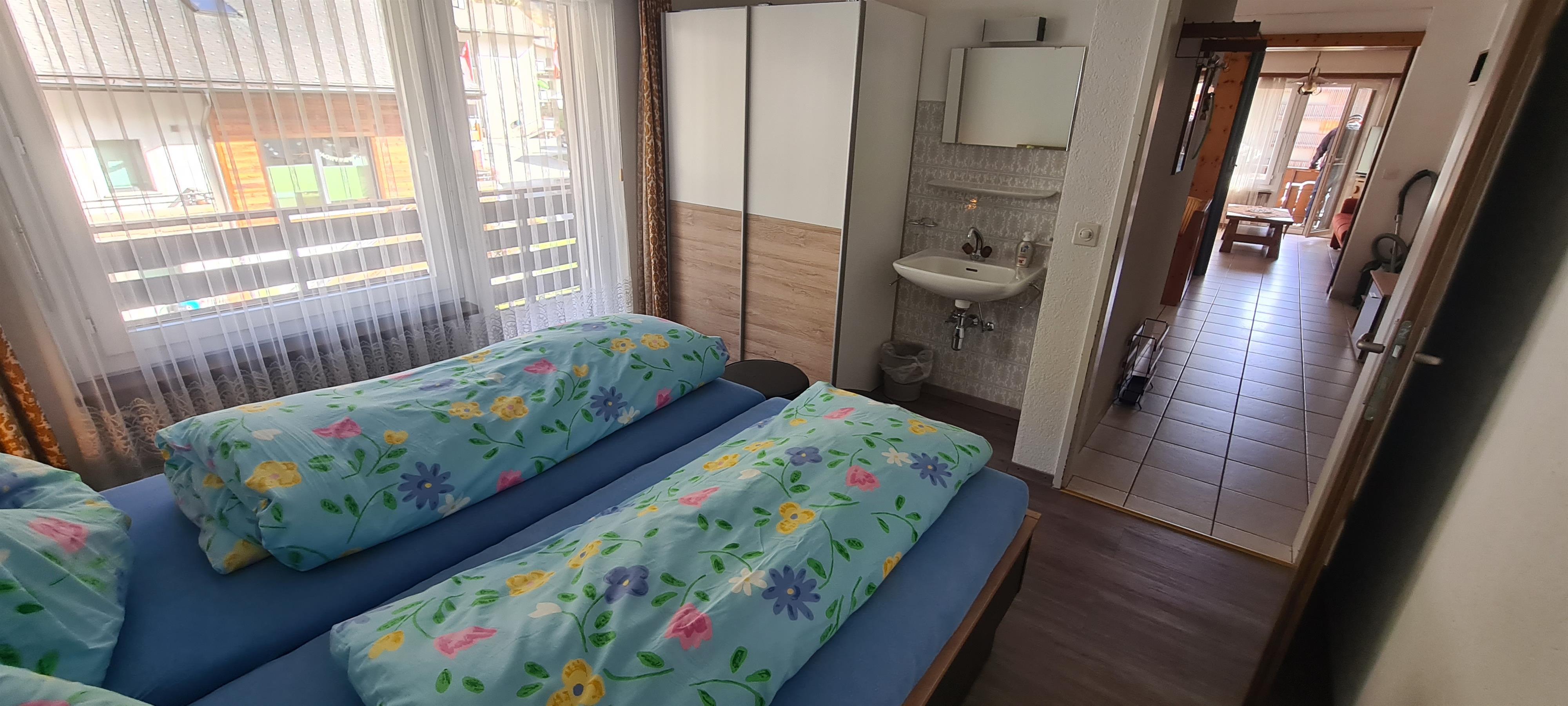 3-Zimmerwohnung, ruhige Lage, Parkplatz. Die Wohnung hat 2 Balkone. Ein Wohnzimmer kombiniert mit 2 Wandklappbetten. 1 Doppelschlafzimmer mit Waschbecken und ein Zimmer mit Franzosenbett mit einer Matratze. Jedes Zimmer ist abschliessbar. 1 separate Küche mit Essraum und WC mit Dusche.