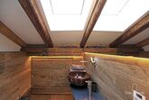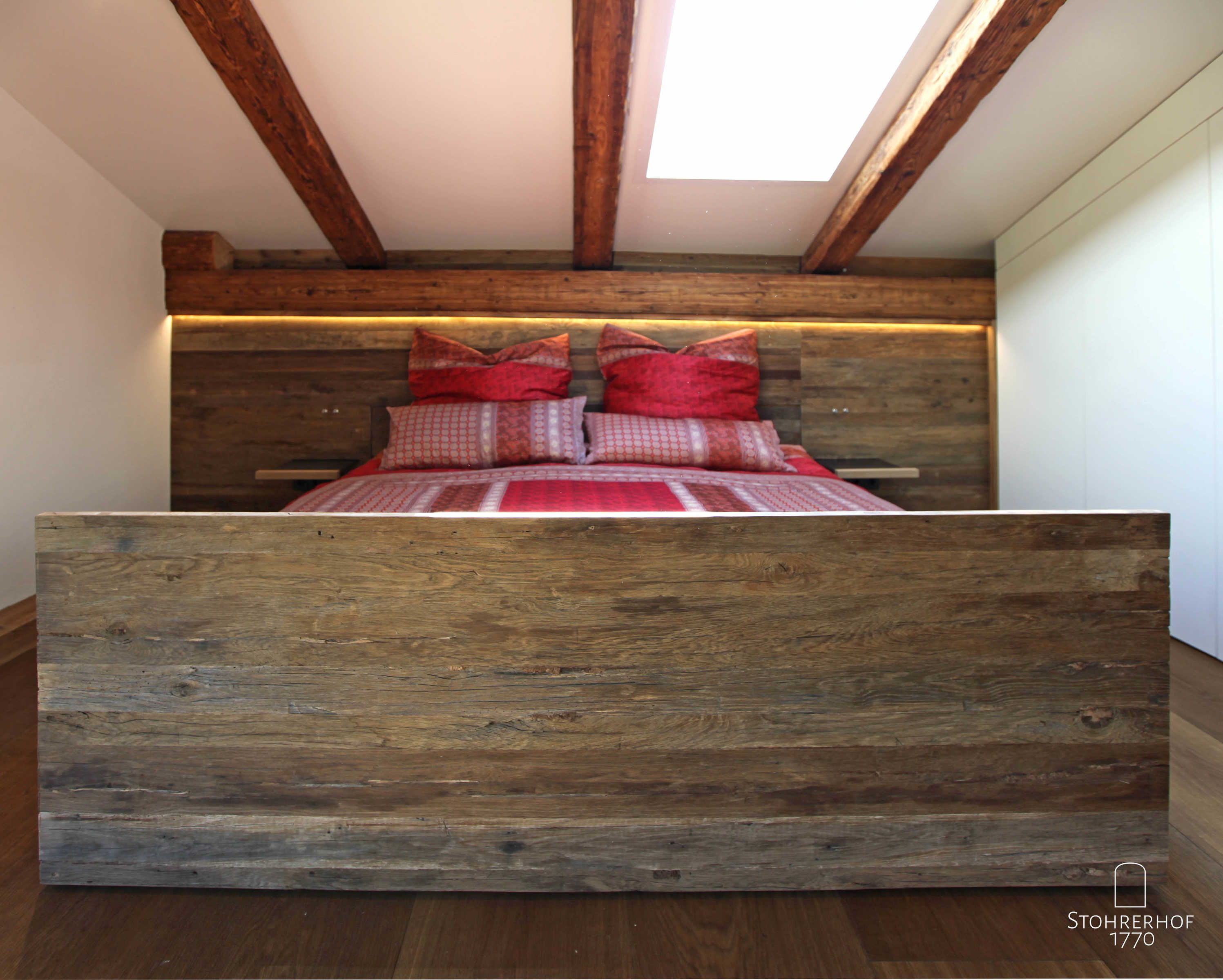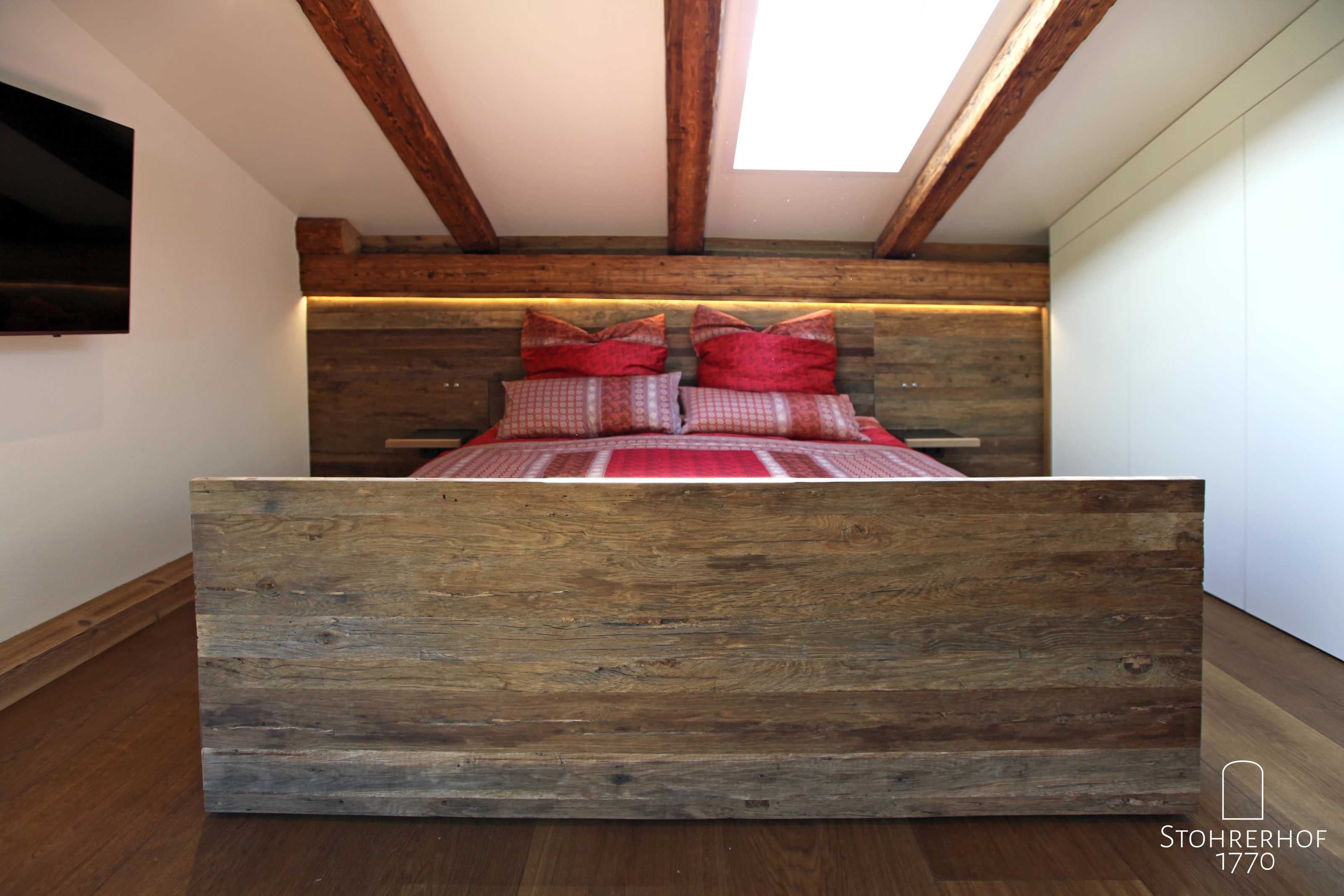 Unsere zwei Doppelbetten (1,80 x 2,00 m) zählen zu den zusätzlichen besonderen Highlights. Auf Knopfdruck schieben sich beide Betten auf Wunsch elektrisch zur Nachtruhe aus den Kniestöcken. Ein altes Scheunentor bietet in diesem großzügigen Ambiente die Möglichkeit auch in diesem Loft Rückzugsorte zu finden. Und besonders angenehm ist es, dass gleichermaßen auf Knopfdruck die Doppelbetten, ob gemacht oder nicht, wieder im Kniestock verschwinden und der große Raum uneingeschränkt als Wohnraum immer aufgeräumt zur Verfügung steht.