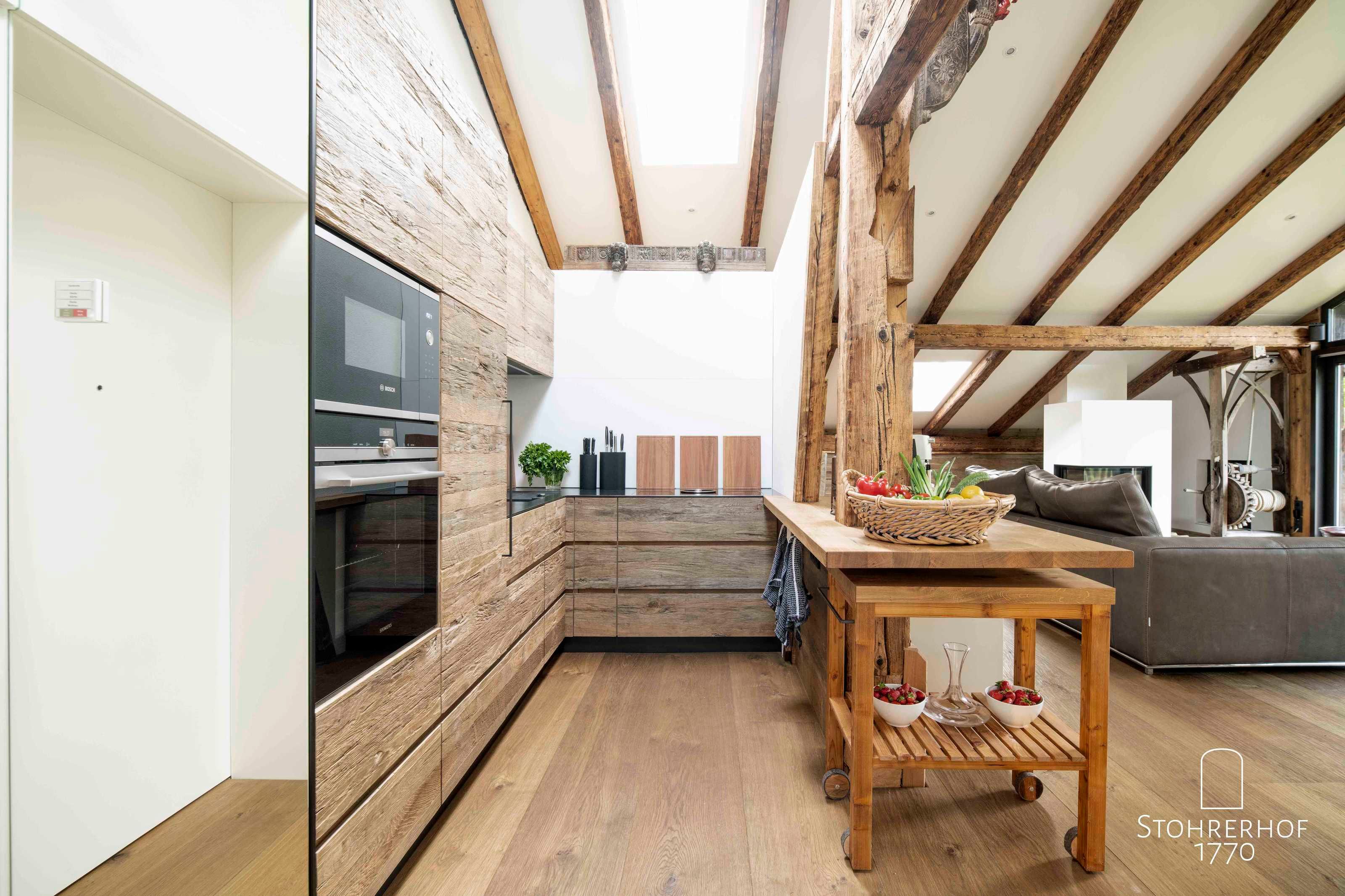 Diese fast 100 m² große, loftartig gestaltete Ferienwohnung für bis zu 4 Personen im Dachgeschoss des Gründerhofes von Riederau am Ammersee besteht quasi aus einem einzigen großen Raum, verfügt über eine offene Küche mit Mikrowelle, Backrohr, Bora Kochfeld, Kaffee-Vollautomat, Spülmaschine und allen Annehmlichkeiten einer voll ausgestatteten luxuriösen Küche.