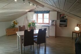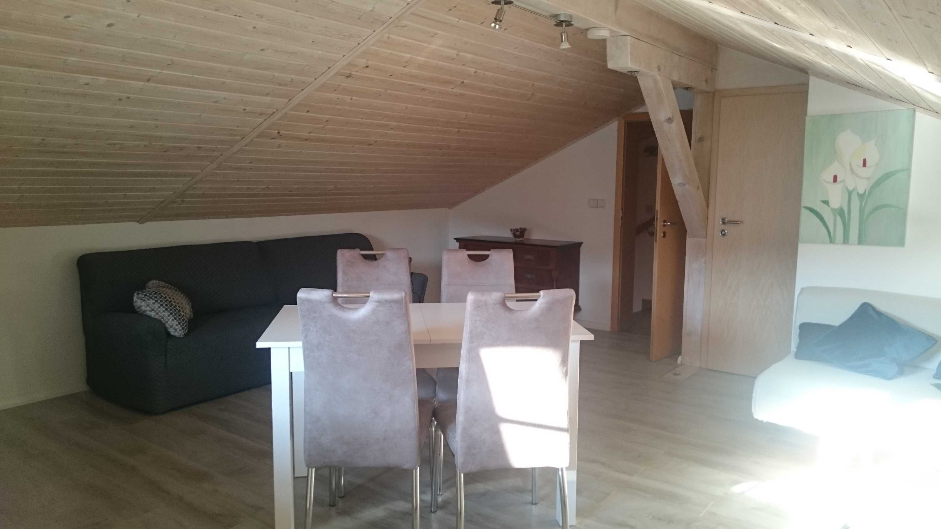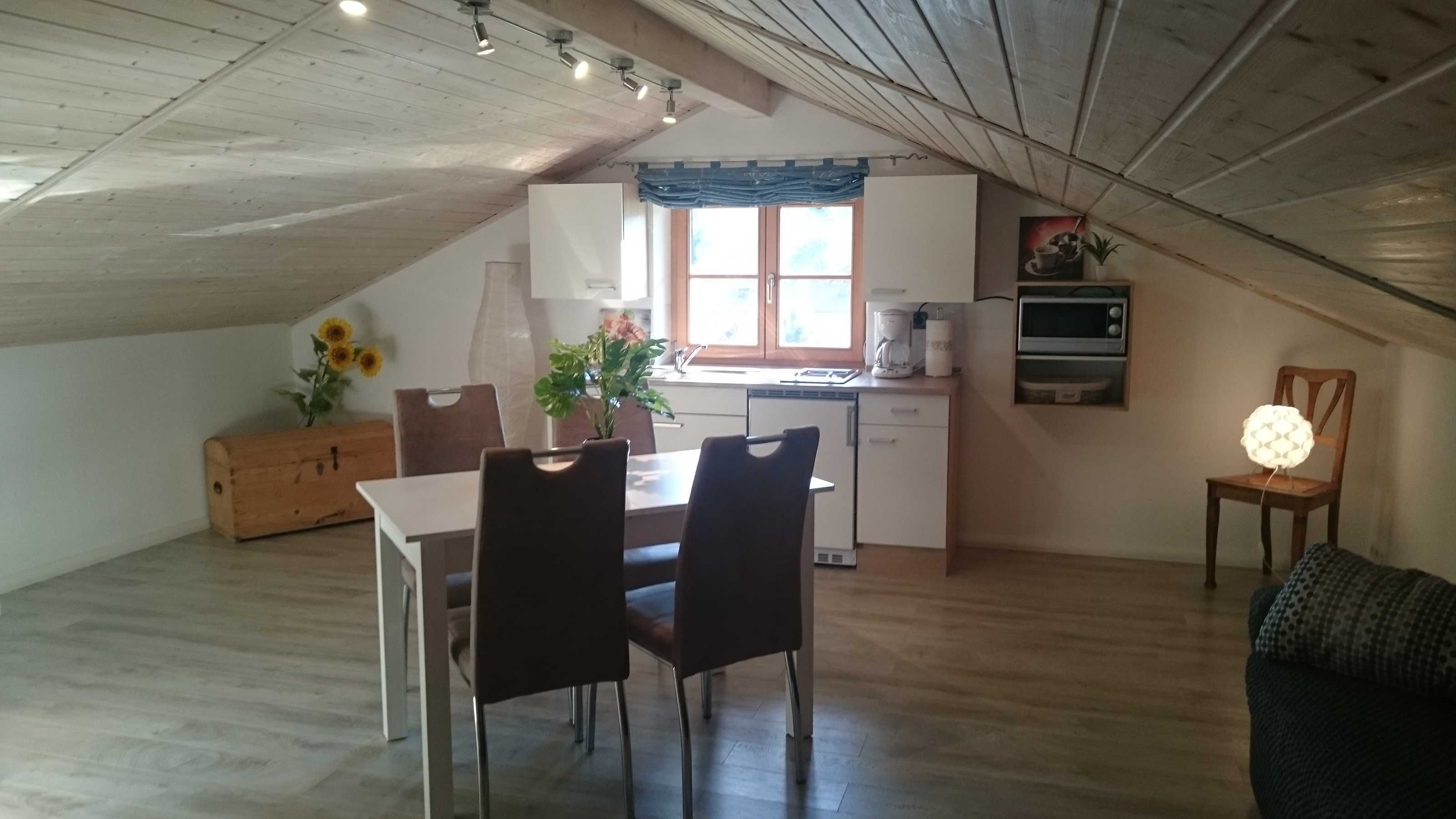 Gemütliche Dachgeschoßwohnung mit einem Schlafzimmer und gut ausgestatteter Wohnküche. Badezimmer mit Dusche/Wc. Blick in die nahe Bergwelt.