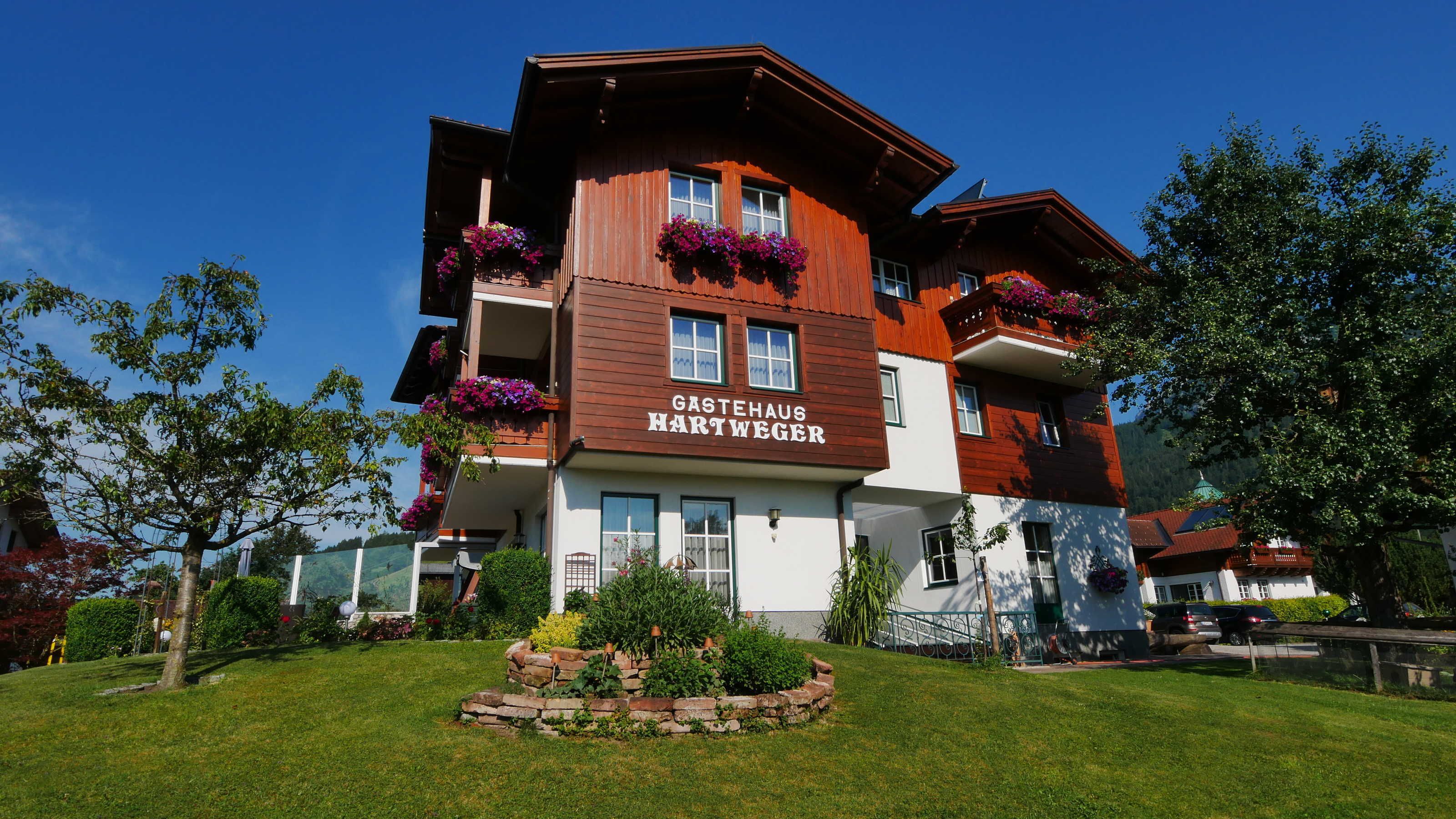 Das Gästehaus Hartweger befindet sich in sonnige Lage inmitten der wunderschönen Region Schladming-Dachstein; Blick auf die Schladminger Tauern sowie das Dachsteinmassiv, nur 1 km entfernt vom Ersteinstieg in die 4-Berge-Skischaukel (Hauser Kaibling), unser Dorf liegt 1 km vom Ort Haus entfernt und gehört zur Marktgemeinde Haus.