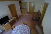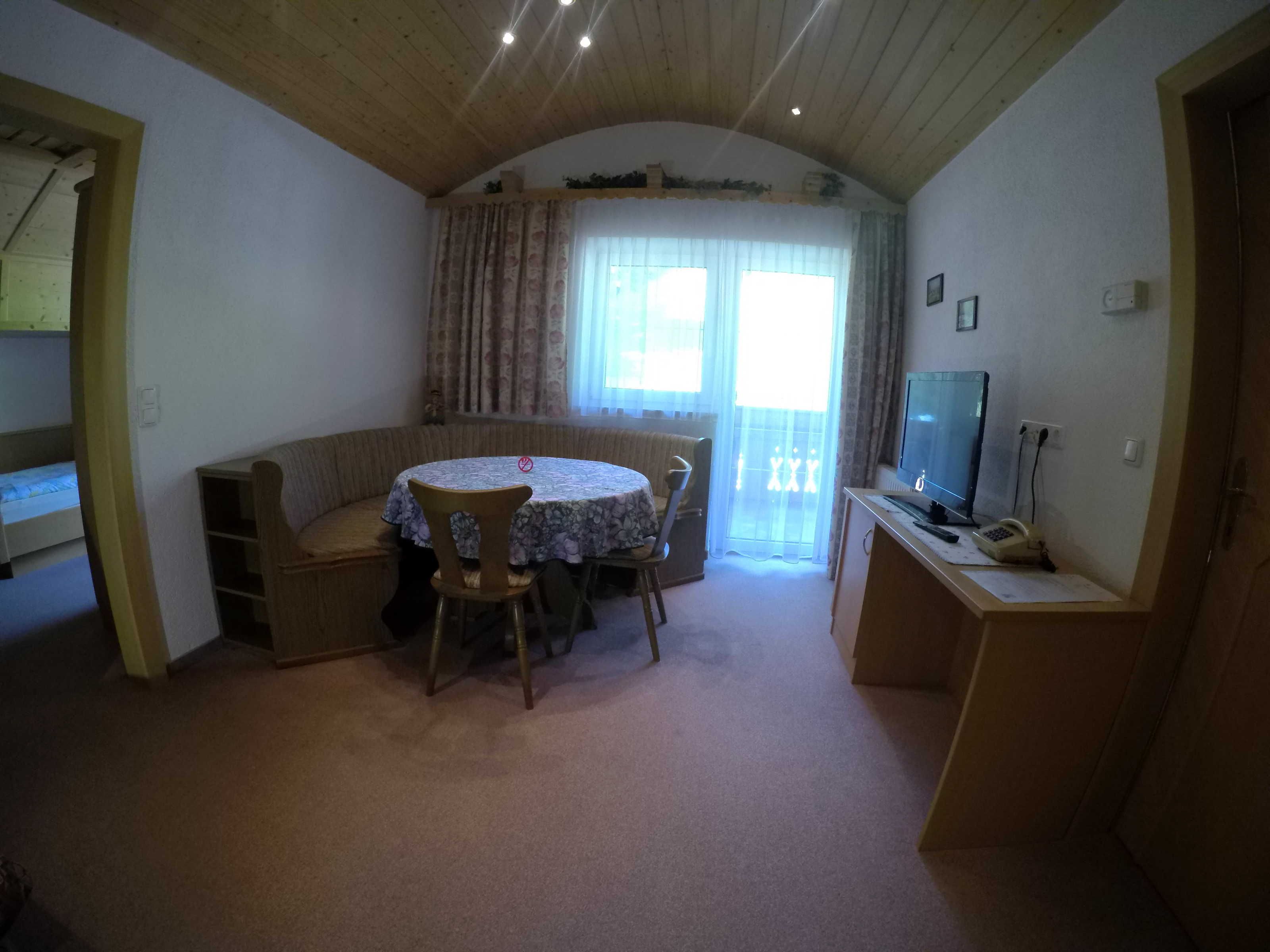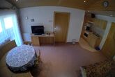 In der Wohnküche befindet sich eine gemütliche Sitzecke sowie eine Couch und ein Flachbildfernseher mit SAT-TV.