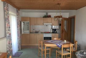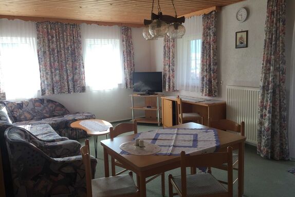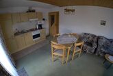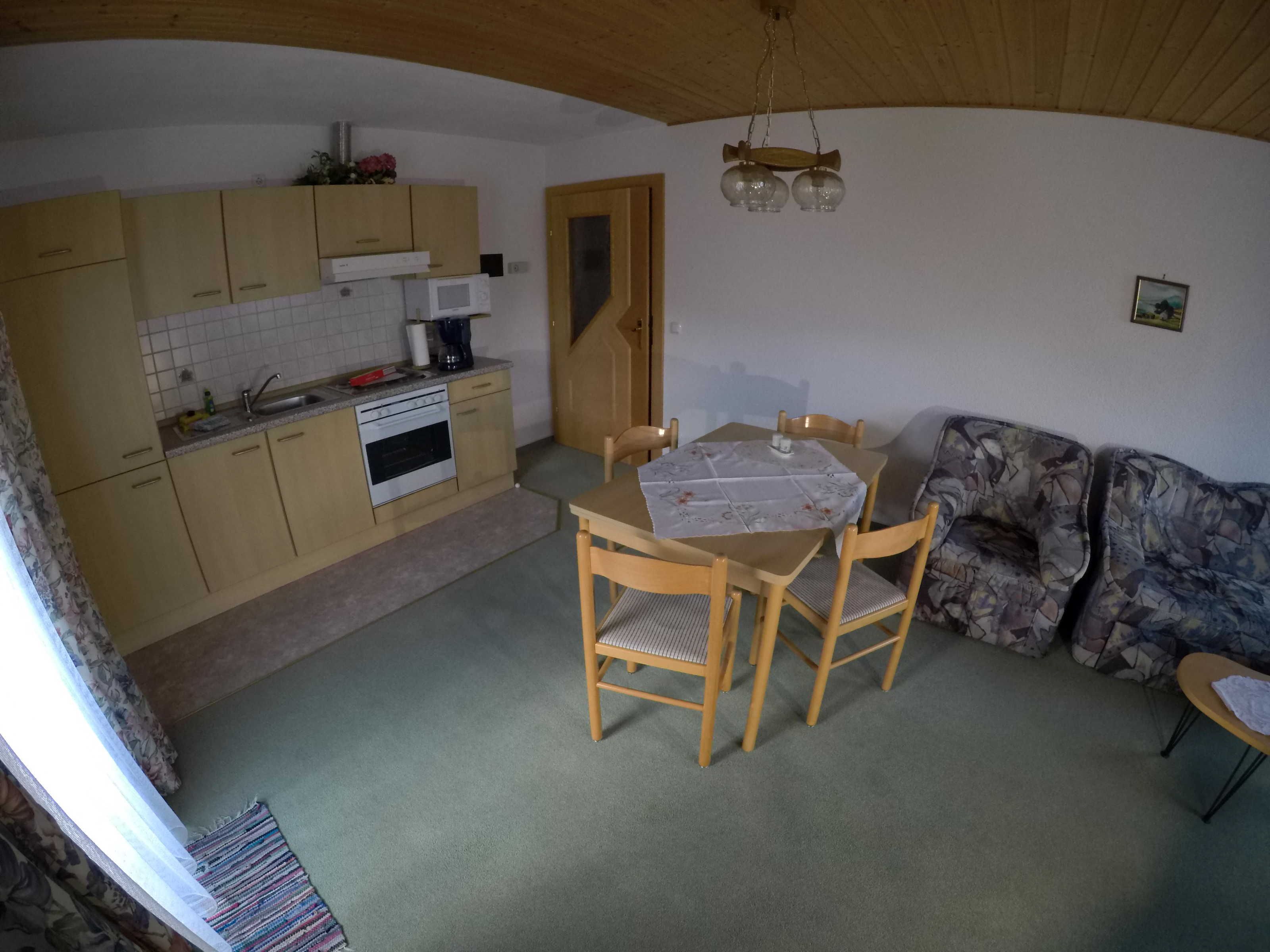 In der Wohnküche befindet sich eine gemütliche Polsterecke mit Sessel und Flachbildfernseher mit SAT-TV.
