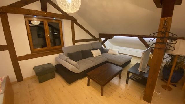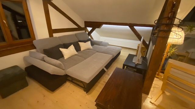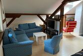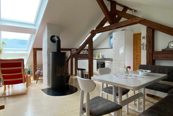Dachgeschoss FeWo, 2017 Fertigstellung, ein großer Raum mit freiliegenden Balken, großen Dachfenstern und einem romantischen Kaminofen. Durch elektronische Rollos und guter Isolation auch im Hochsommer nicht zu heiß.