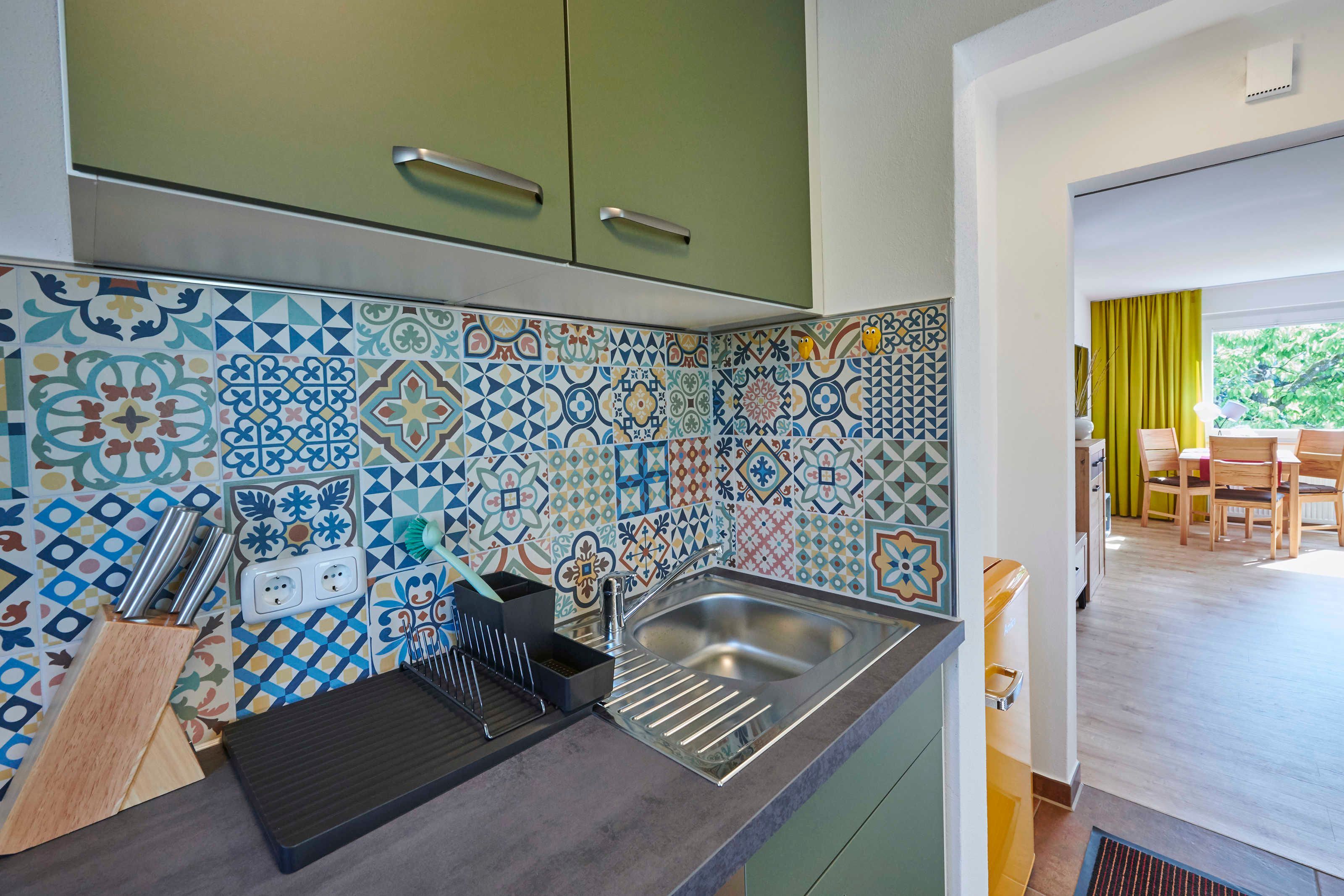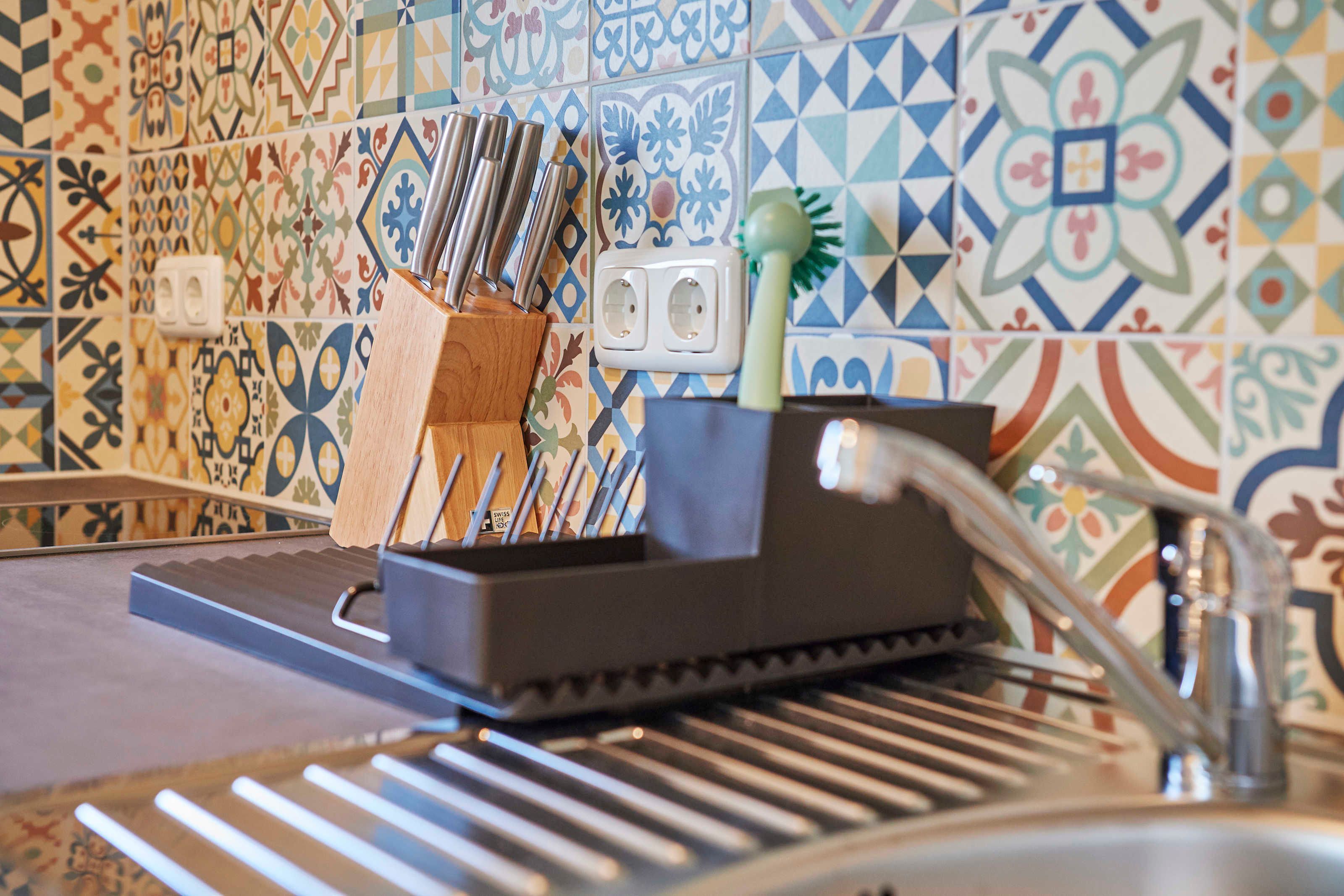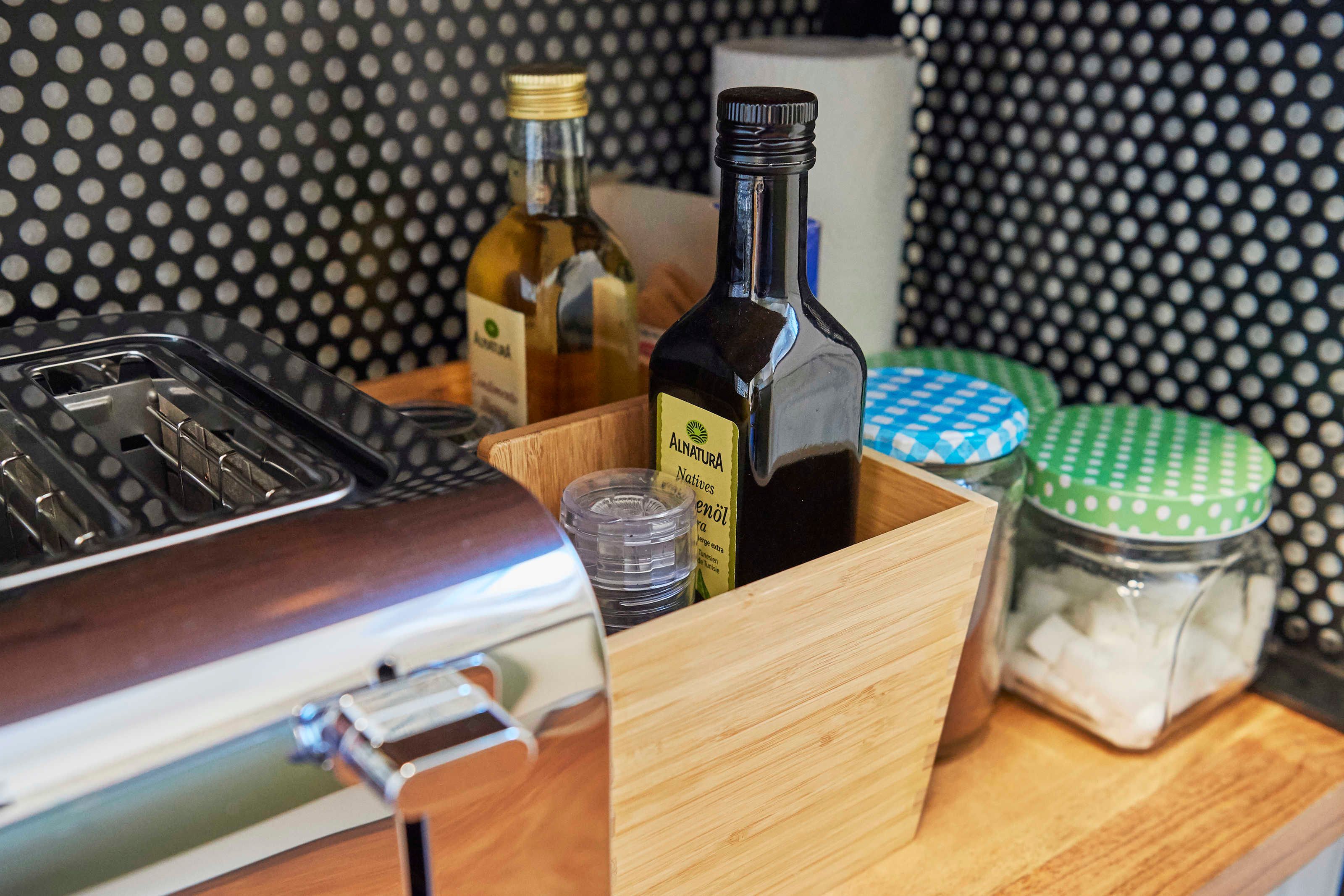 Die Küche mit Fenster Richtung Westen bietet eine Küchenzeile mit Cerankochfeld (2 Platten), Spülmaschine, Spülbecken, Unter- und Oberschränken, Mikrowelle mit Grill und Heißluft-/Backfunktion, Kühlschrank mit Eisfach, Kaffeemaschine, Toaster, Wasserkocher. Zur Grundausstattung gehören Salz und Pfeffer, Essig und Öl, Kaffee/Kaffeefilter, Tee, Zucker, Spül- und Reinigungsmittel sowie Geschirrtücher.