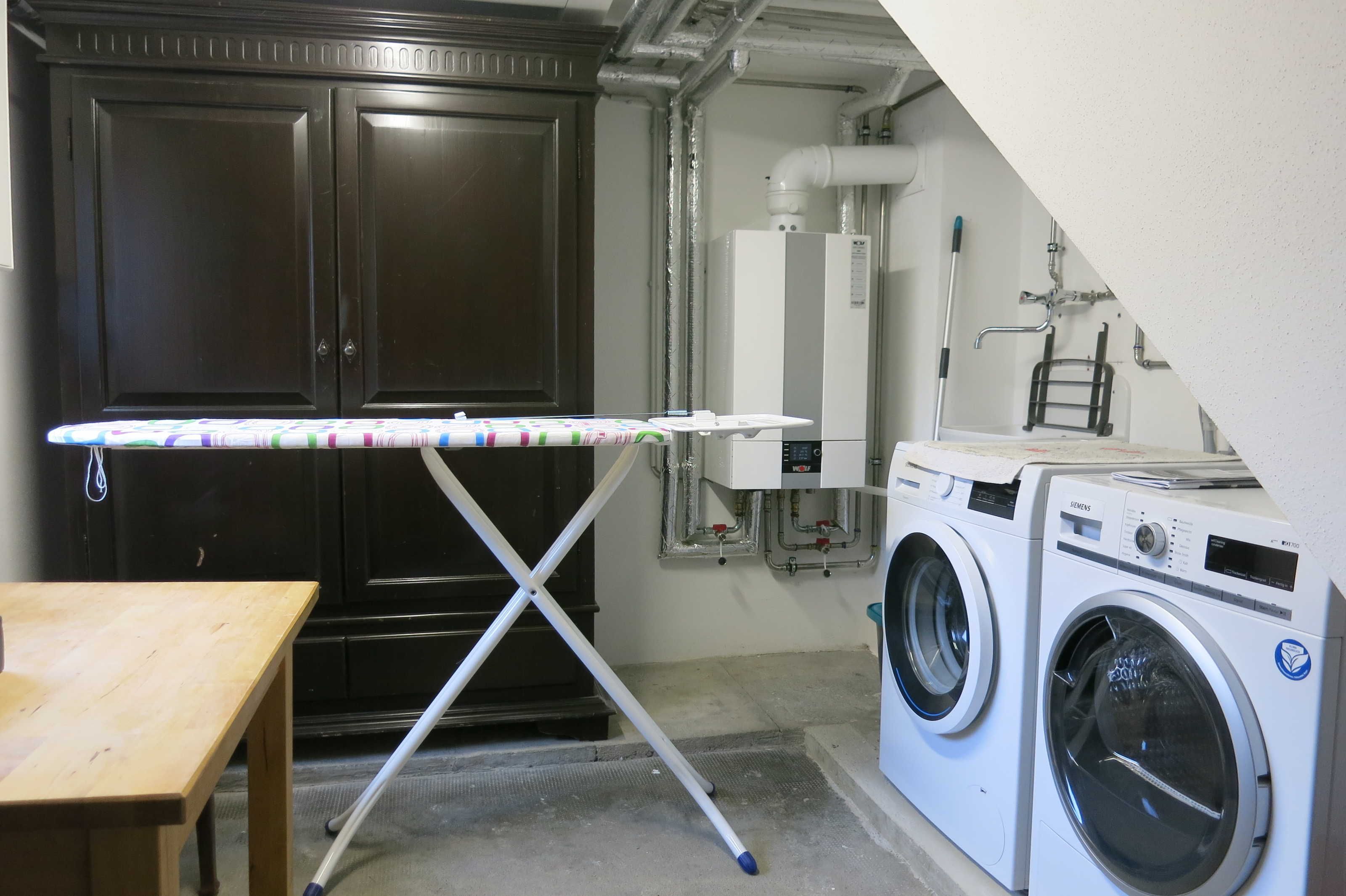 Im Erdgeschoss des Gebäudes befindet sich die Waschküche, der Hauswirtschaftsraum für das Ferien-Apartment. Dort finden Sie Waschmaschine, Trockner und Bügelbrett sowie größere Reinigungsgeräte wie Staubsauger, Wischer etc. Die Benutzung der Waschmaschine ist für Sie kostenfrei, den Trockner können Sie gegen eine kleine Gebühr nach Rücksprache ebenfalls gerne benutzen. Die Waschküche dient auch als Trockenraum für feuchte Kleidung oder Wanderschuhe.