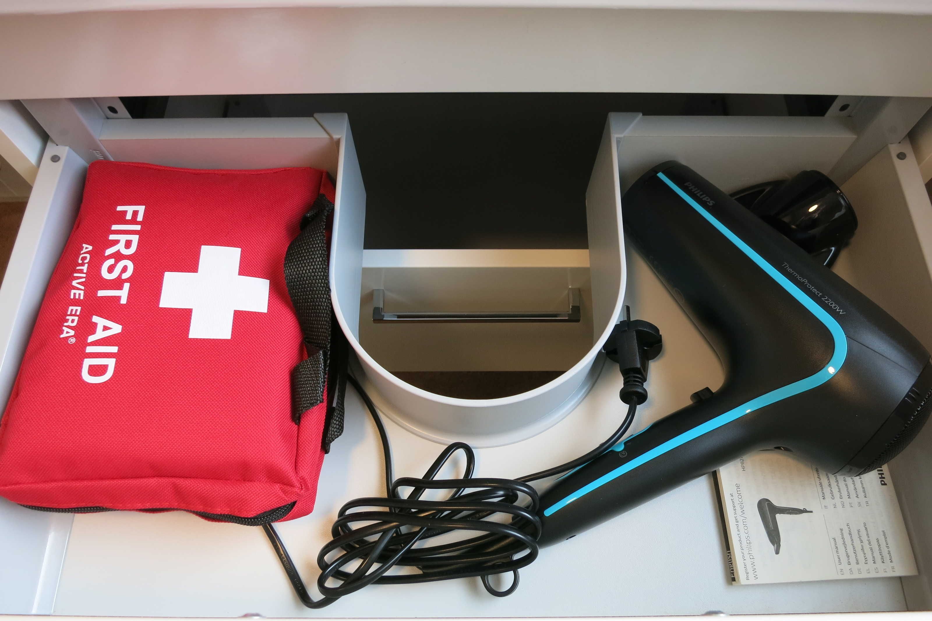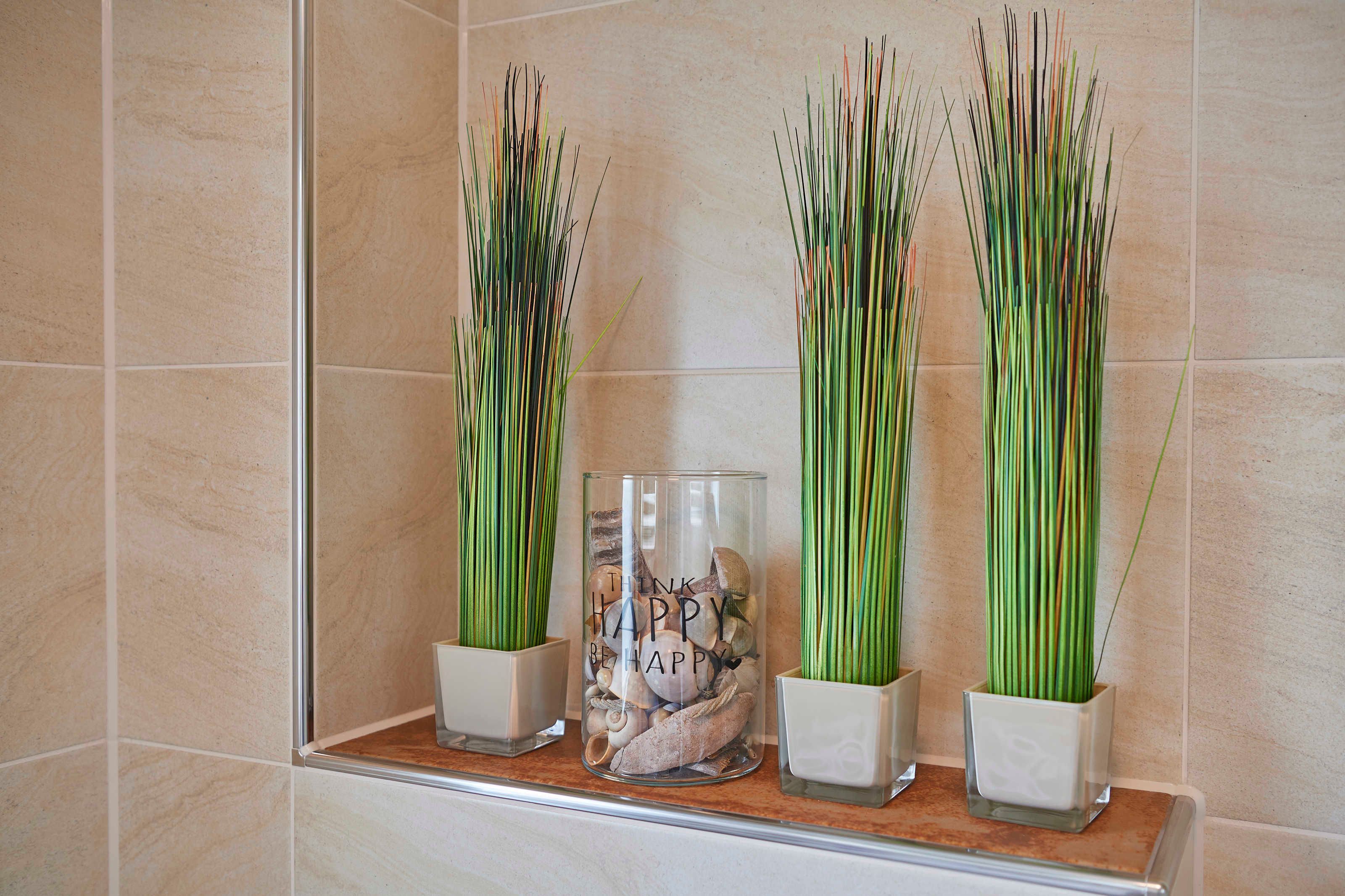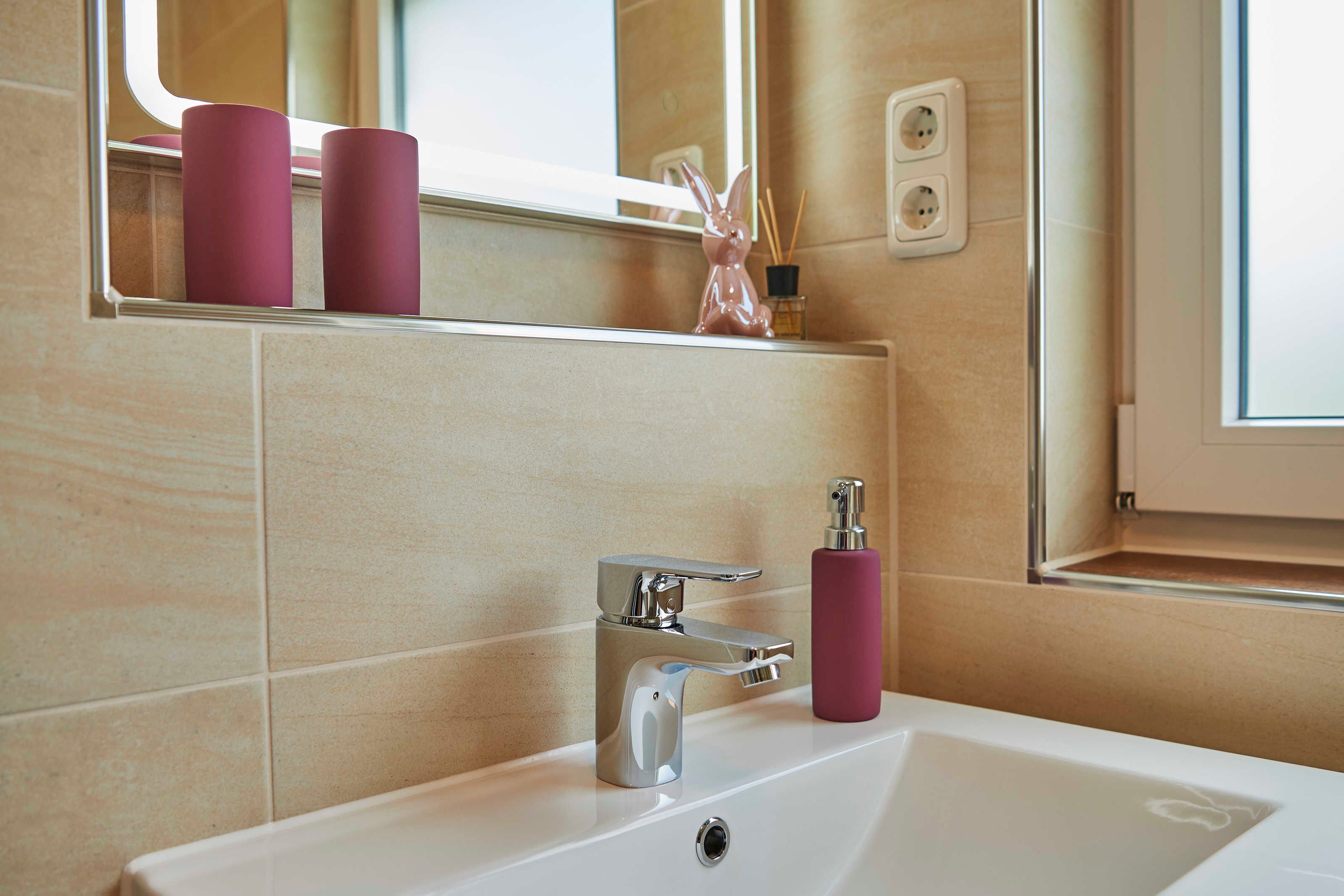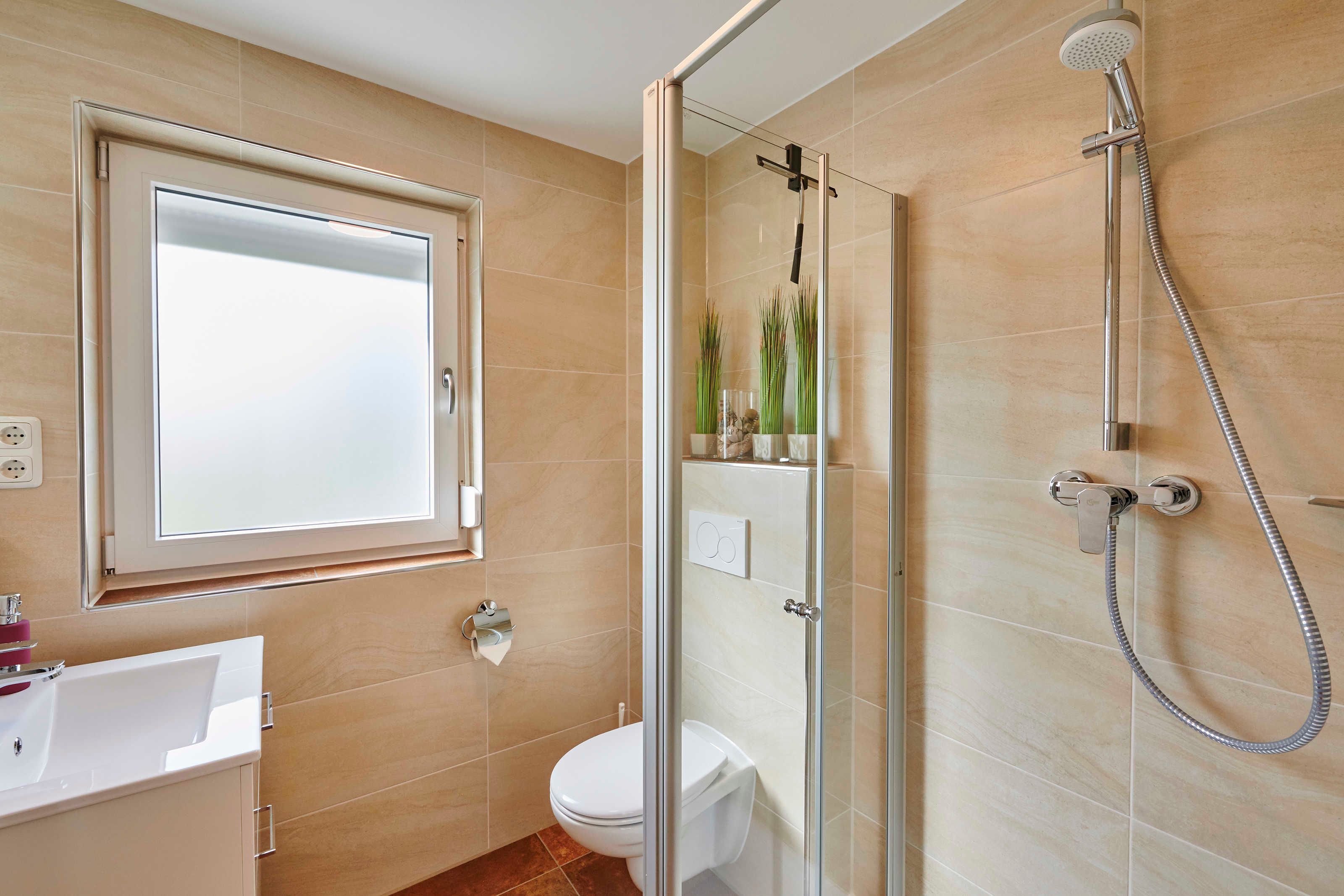 Das geflieste Tageslicht-Bad ist ausgestattet mit Duschkabine und flacher Duschwanne (90 x 80 cm), modernem spülrandlosem WC mit Absenk-Automatik, Waschtisch mit Unterschrank und Auszügen, LED Spiegel, wandhohem Handtuchheizkörper, Fön und Verbandskasten. Selbstverständlich finden Sie Toilettenpapier und Handseife vor.