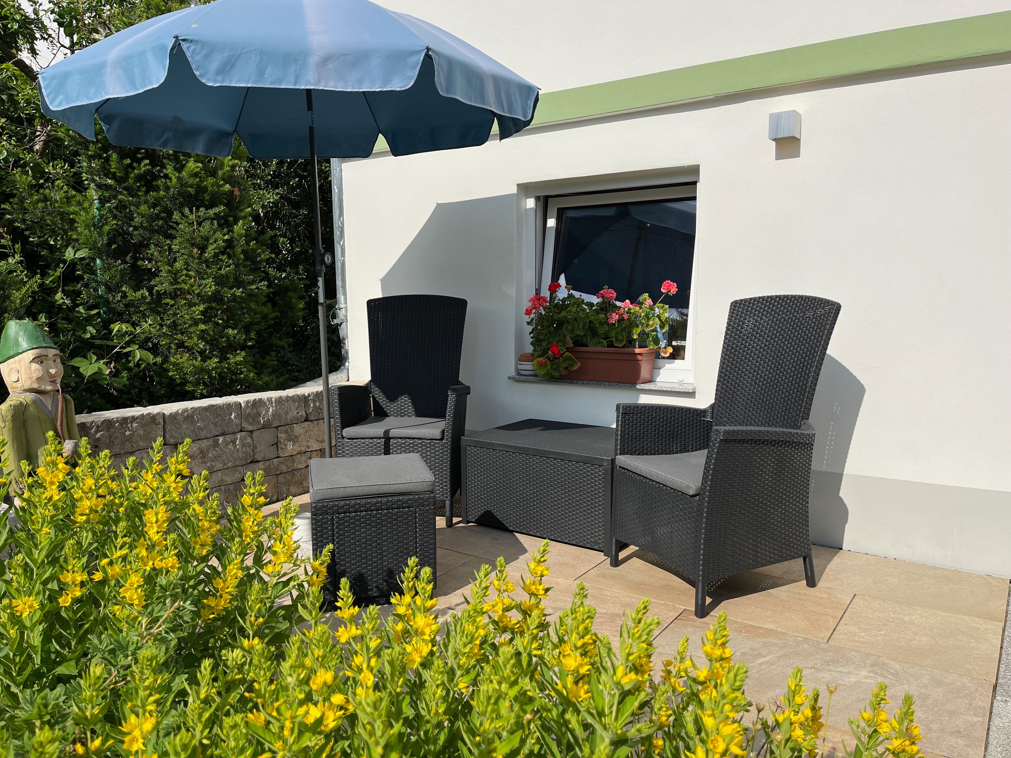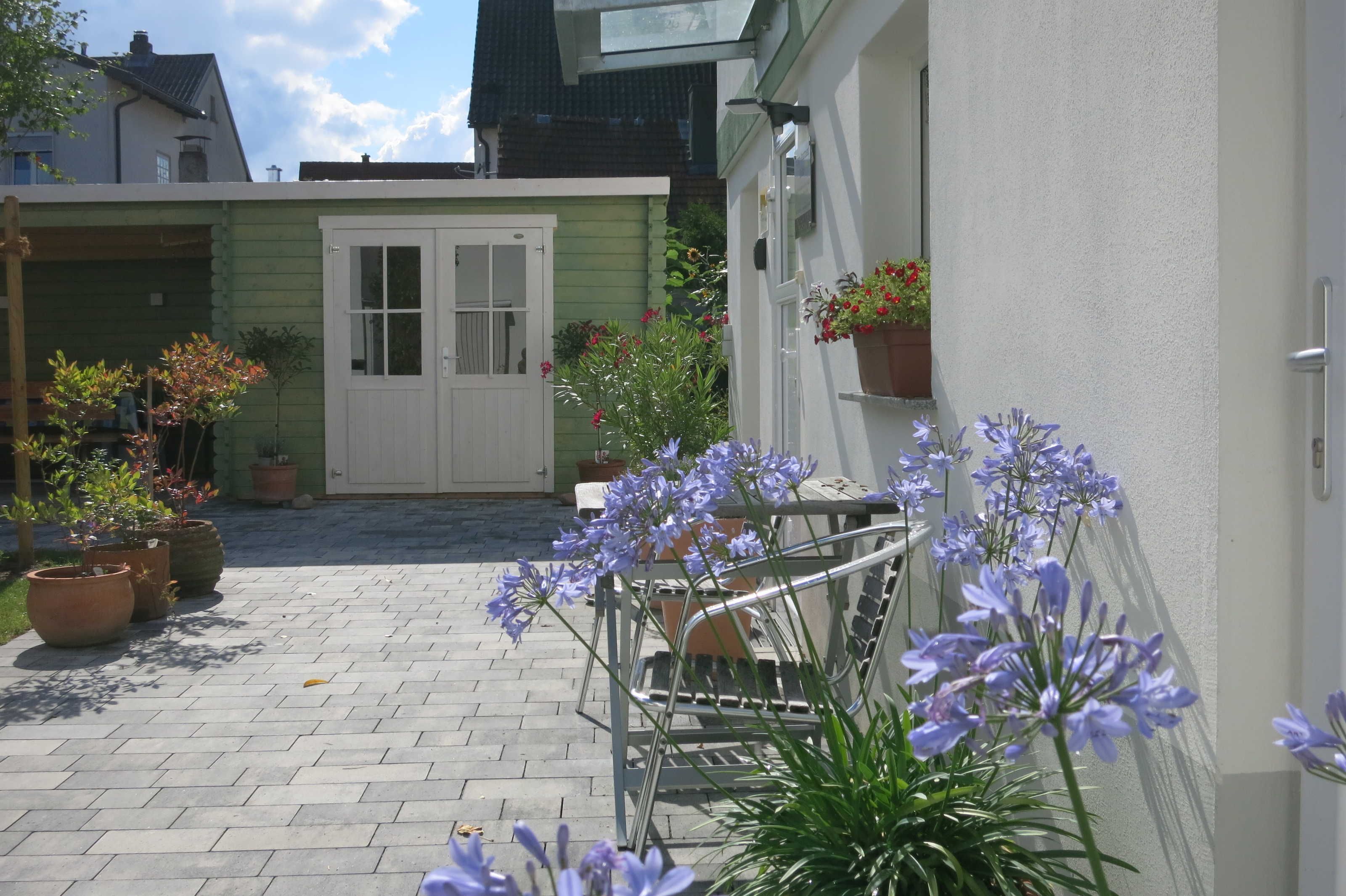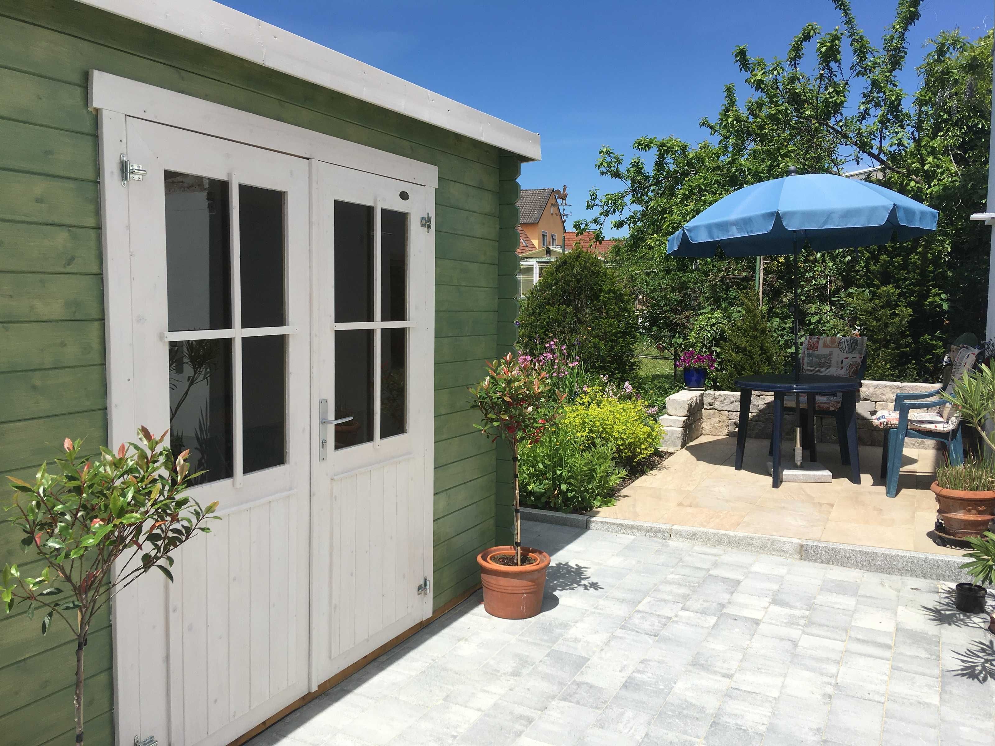 Unser kernsaniertes, helles Ferien-Apartment liegt im 1. OG eines kleinen Hauses auf unserem Anwesen, zurückgesetzt in unserem weitläufigen Bauerngarten. Von allen Fenstern blicken Sie ins Grüne, und auf der Westseite des Gebäudes steht Ihnen eine schöne Sonnenterrasse zur Verfügung. Neben dem Häuschen mit Ihrer Ferienwohnung befindet sich ein überdachter Freisitz, der vor zu viel Sonne und Regen schützt.