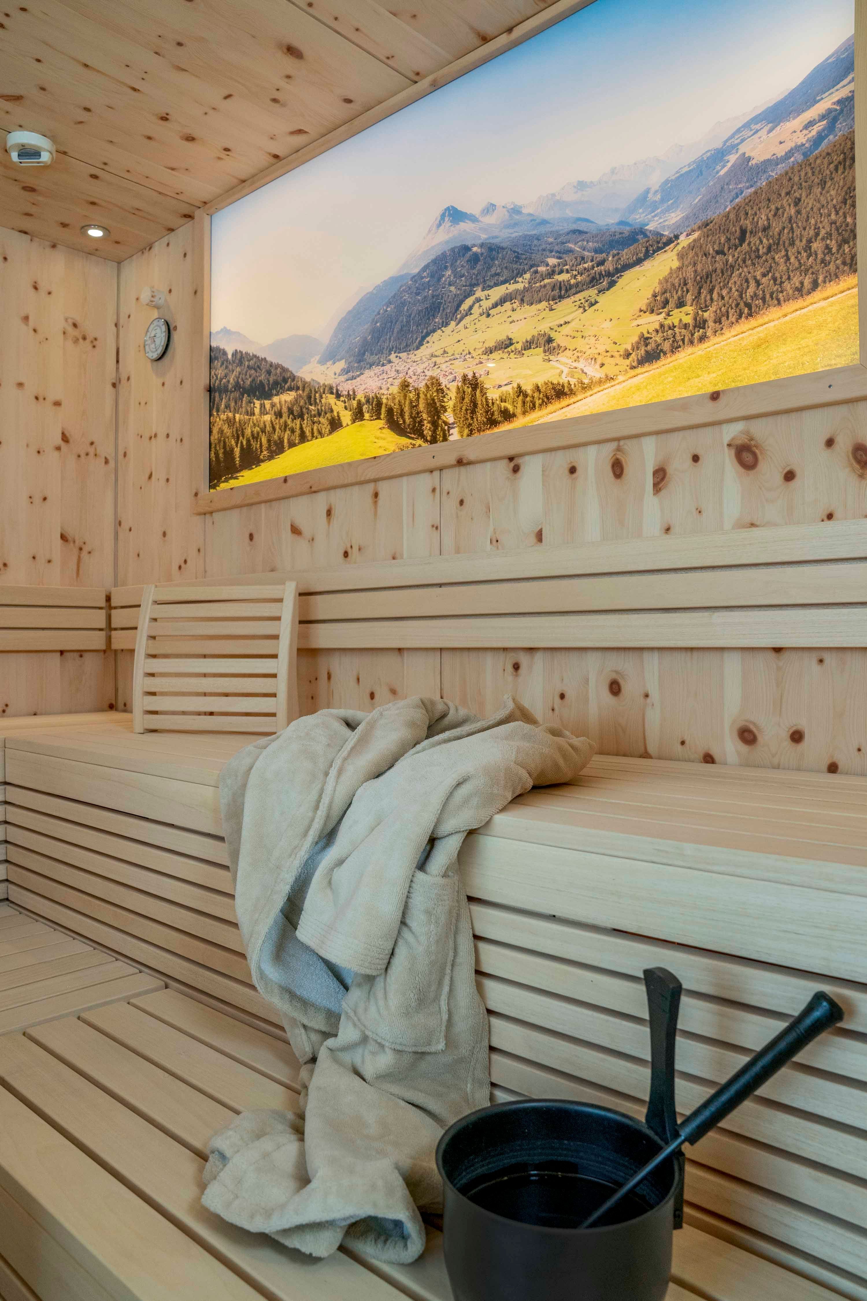 Ein feiner Wohlfühlbereich mit Sauna, Infrarotkabine, Teebar, Panoramaruheraum mit Entspannungsliegen und Relax-Liegwiese für wohltuende Momente.