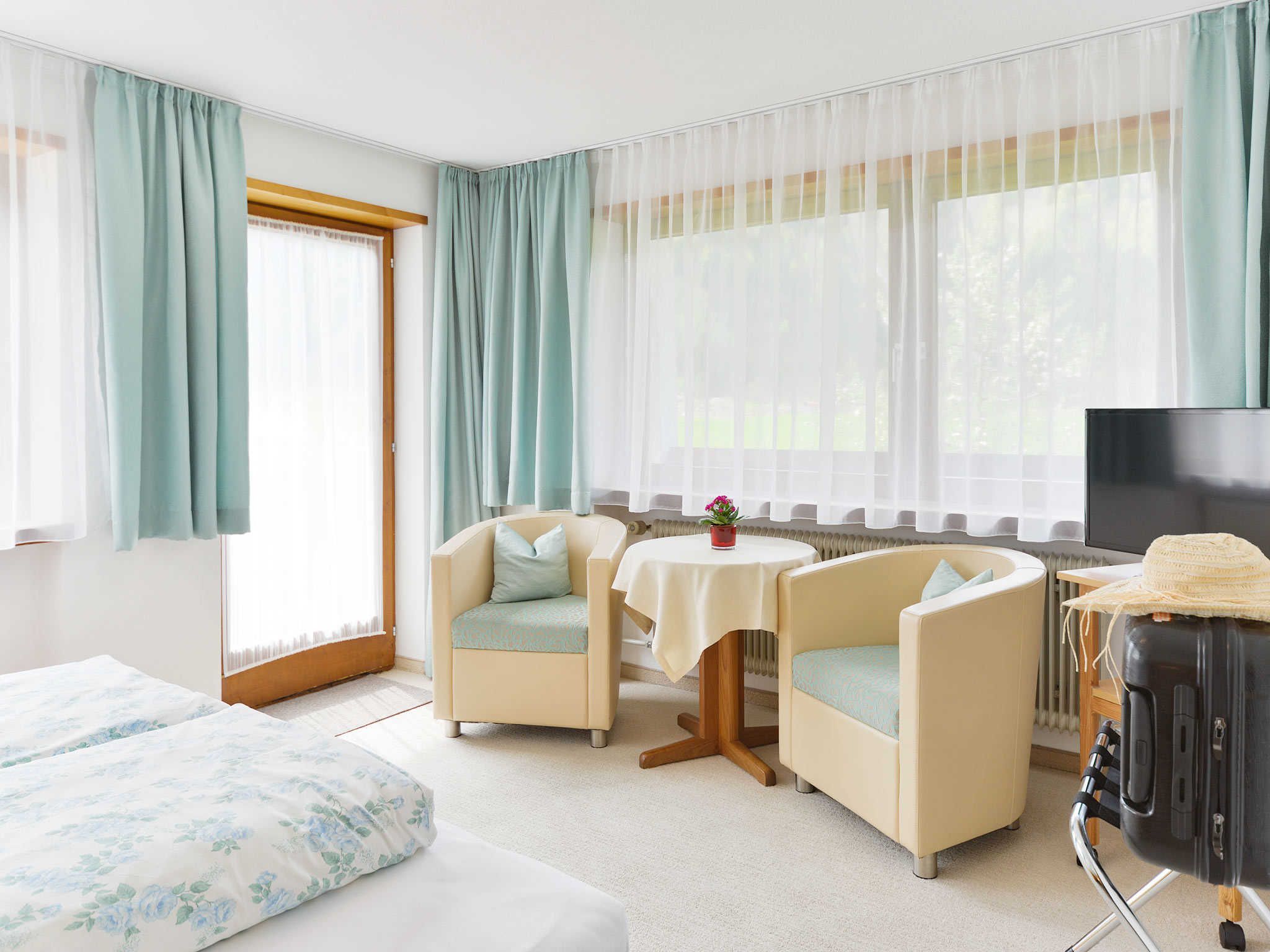 … ist im ländlichen Stiel ausgestattet mit Dusche, WC, Föhn, TV, Gratis-WLAN und Balkon, auch für ein Zusatzbett ist in diesem Zimmer Platz.