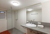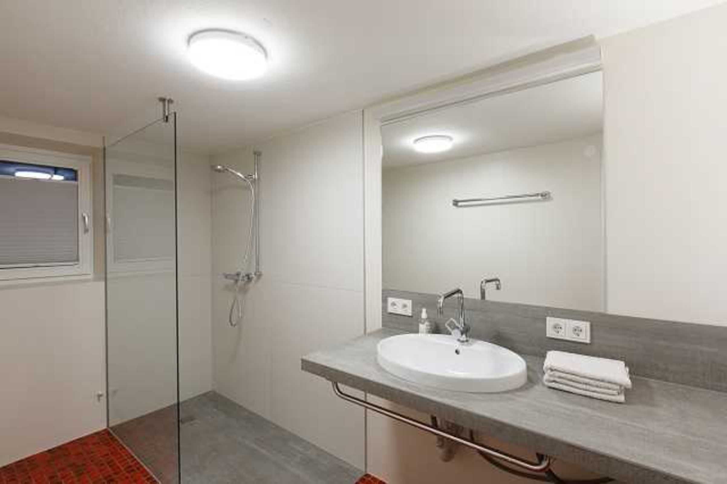 Das Bad ist eine gelungene Symbiose von alt und neu und hat eine großzügige schwellenlose Dusche, ein Waschbecken und eine Waschmaschine. Die Toilette ist in einem eigenen Raum.