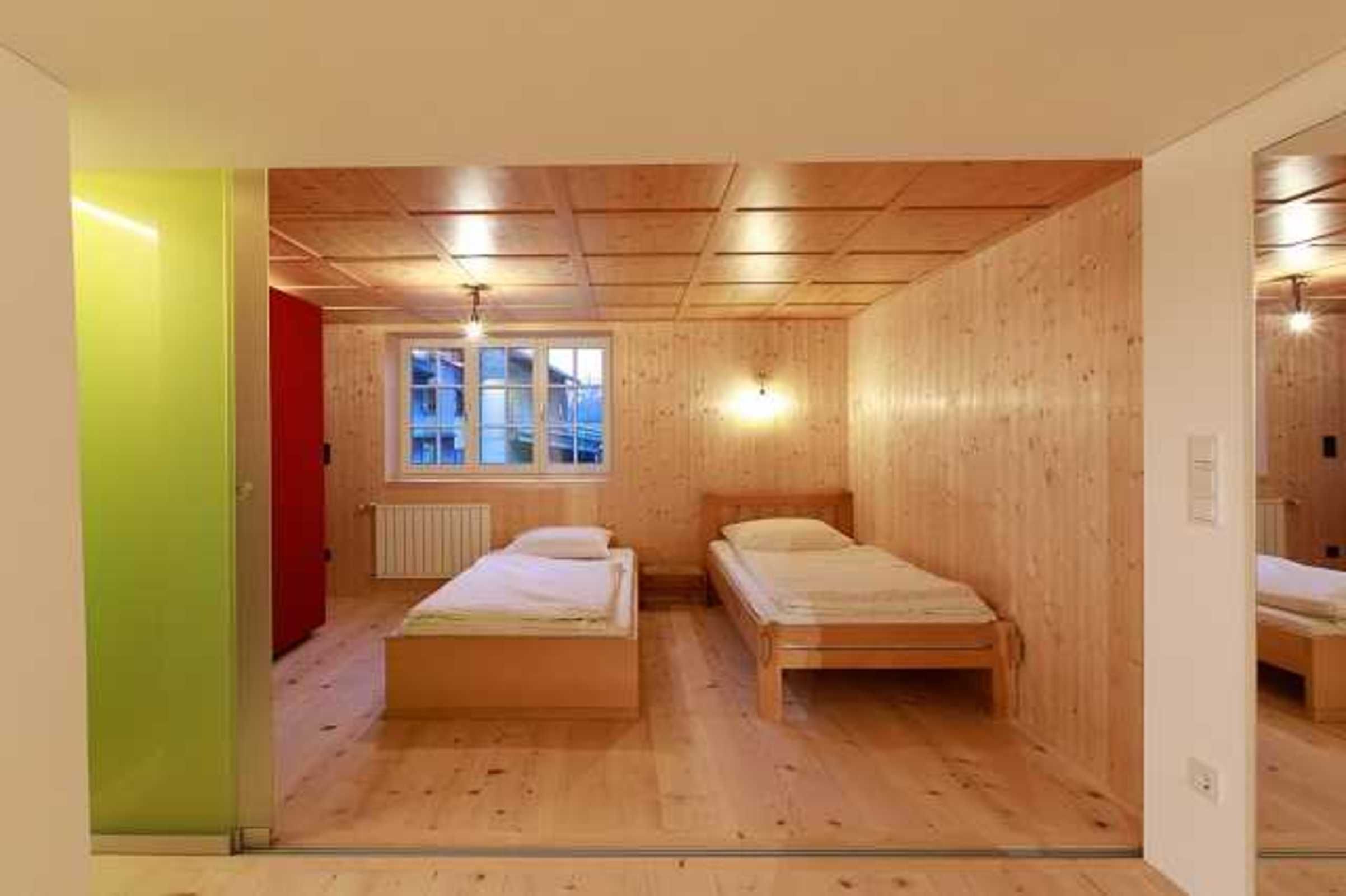 Schlafzimmer 1 hat ein Doppelbett mit 2x2 Meter, einem hochwertigen Lattenrost und Matratze und weiters einen großzügigen, stoffbespannten Kleiderschrank. Eine Holzschiebetür trennt und verbindet hin zum multifunktionalen Raum (Bibliothek, Schlafzimmer 2), der ehemaligen Flurküche. Dieser Raum kann mittels einer farbigen Glasschiebewand in einen Schlaf- und Aufenthaltsbereich mit Bibliothek zoniert werden. Schlafzimmer 2 hat zwei Einzelbetten und ebenfalls einen großen stoffbespannten Kleiderschrank. Der Boden der ganzen Wohnung ist aus Naturholz (geseift) und bietet ein unglaubliches Gehgefühl.