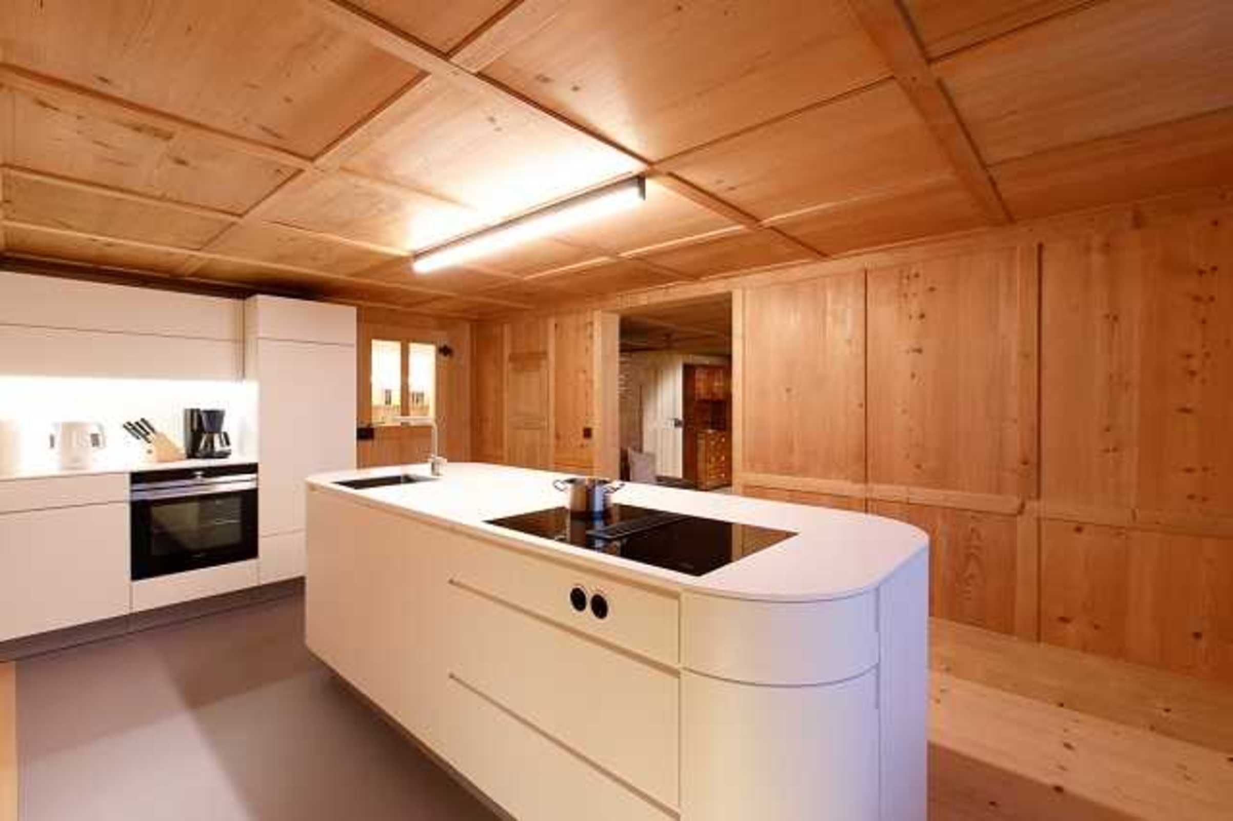 Die Ferienwohnung besteht aus dem Schopf (Loggia), dem typischen Vorraum in einem Bregenzerwälder-Haus. Das Herzstück ist eine mit originalem, historischem Kassettentäfer ausgestattet Stube, mit Eckbank, Tisch und Stühlen, einem gemütlichen Kanapee, einem wunderschönen alten Kasten, einem neu restaurierten Kachelofen mit Ofenbänken. Die Stube und die Küche sind mit einem offen Durchgang verbunden. Die Küche hat einen modernen, abstrakten Küchenblock und ist mit höchster handwerklicher Qualität getischlert worden. Die Küchenausstattung und Geräte (Geschirrspüler, Herd, Backrohr) sind hochwertig und umfangreich.