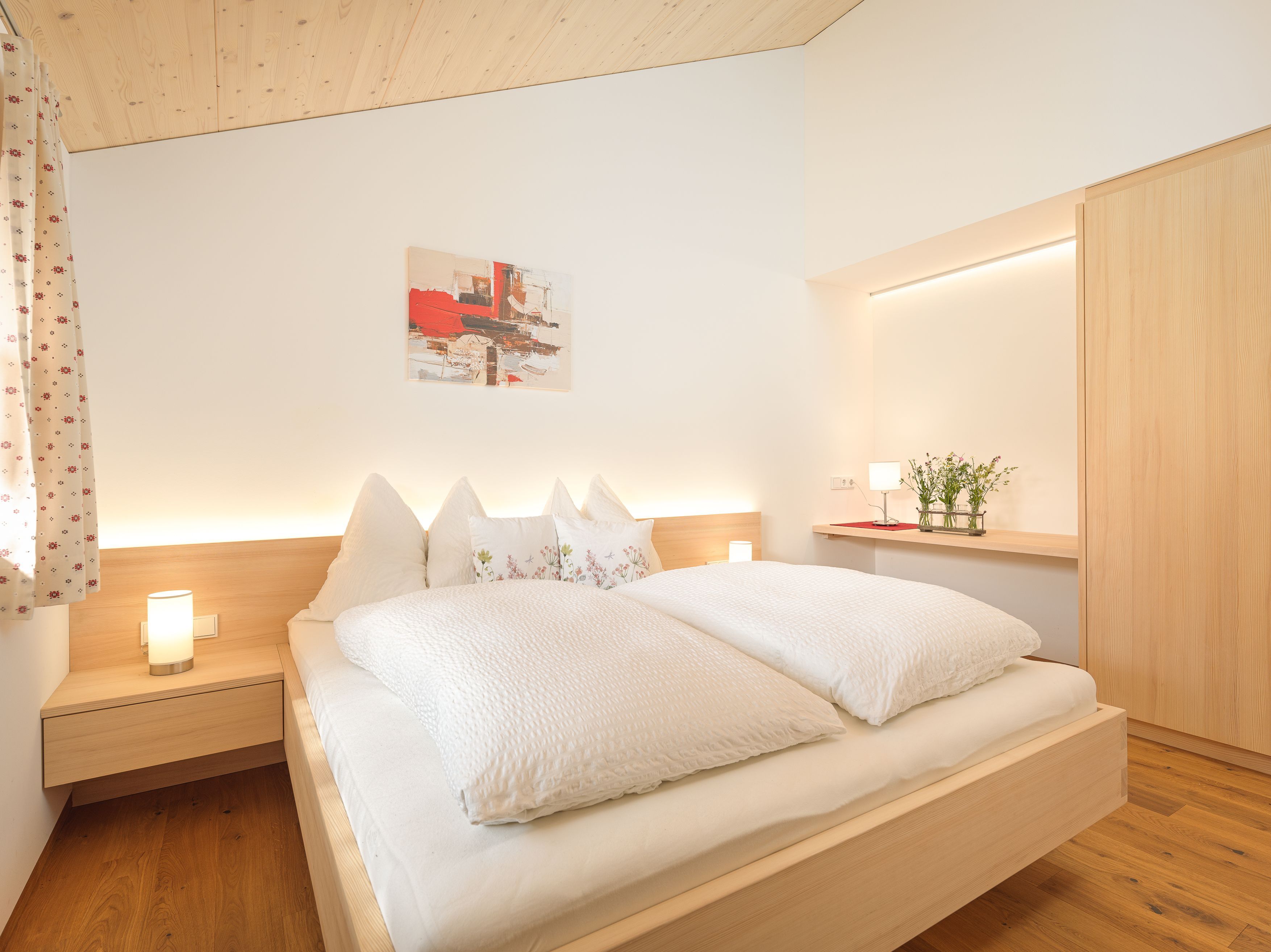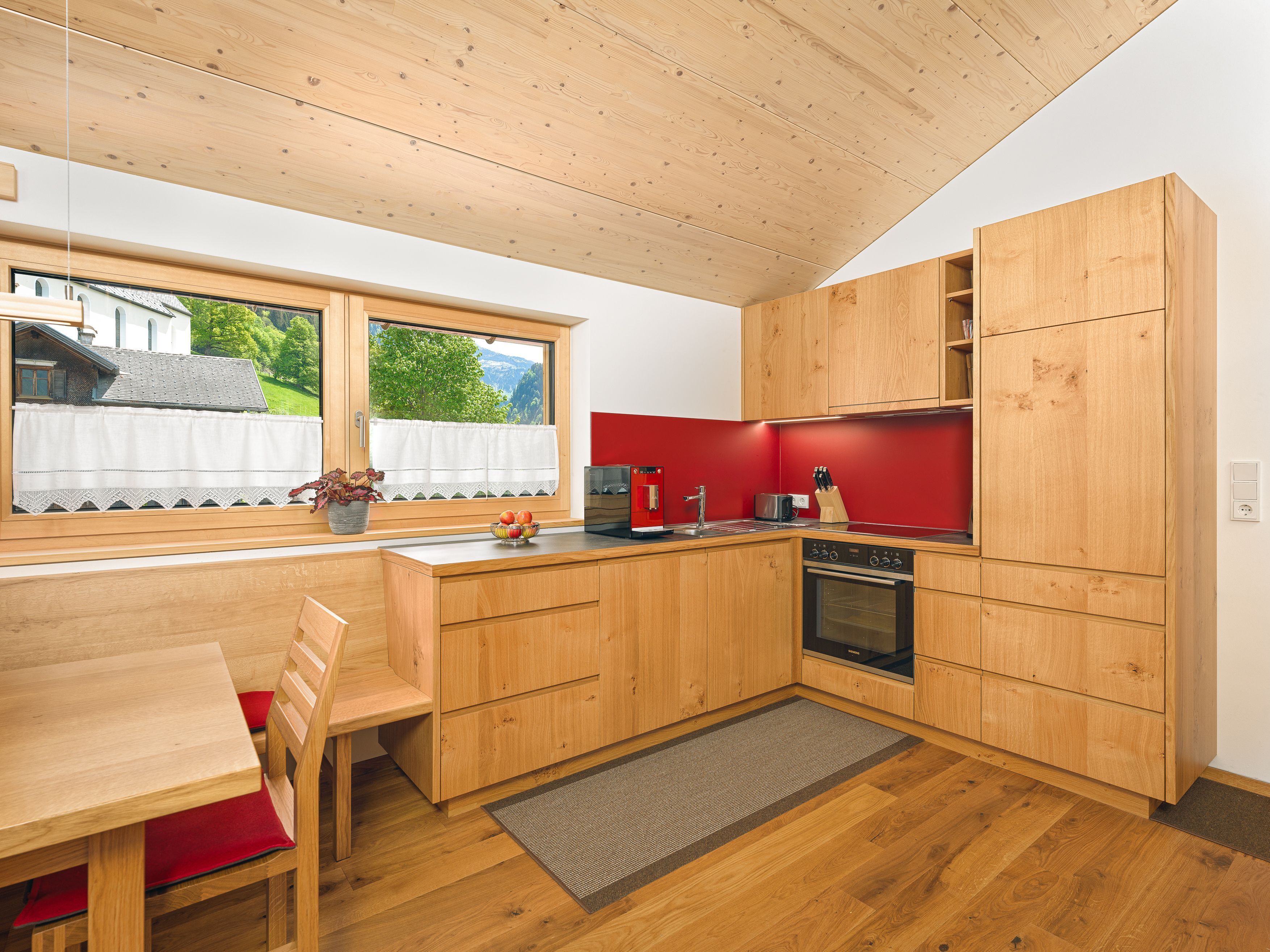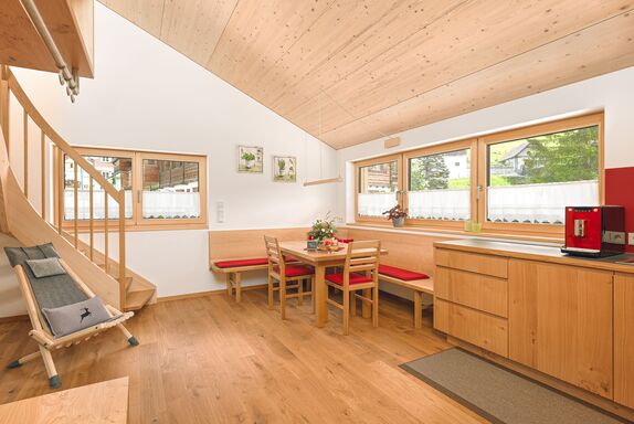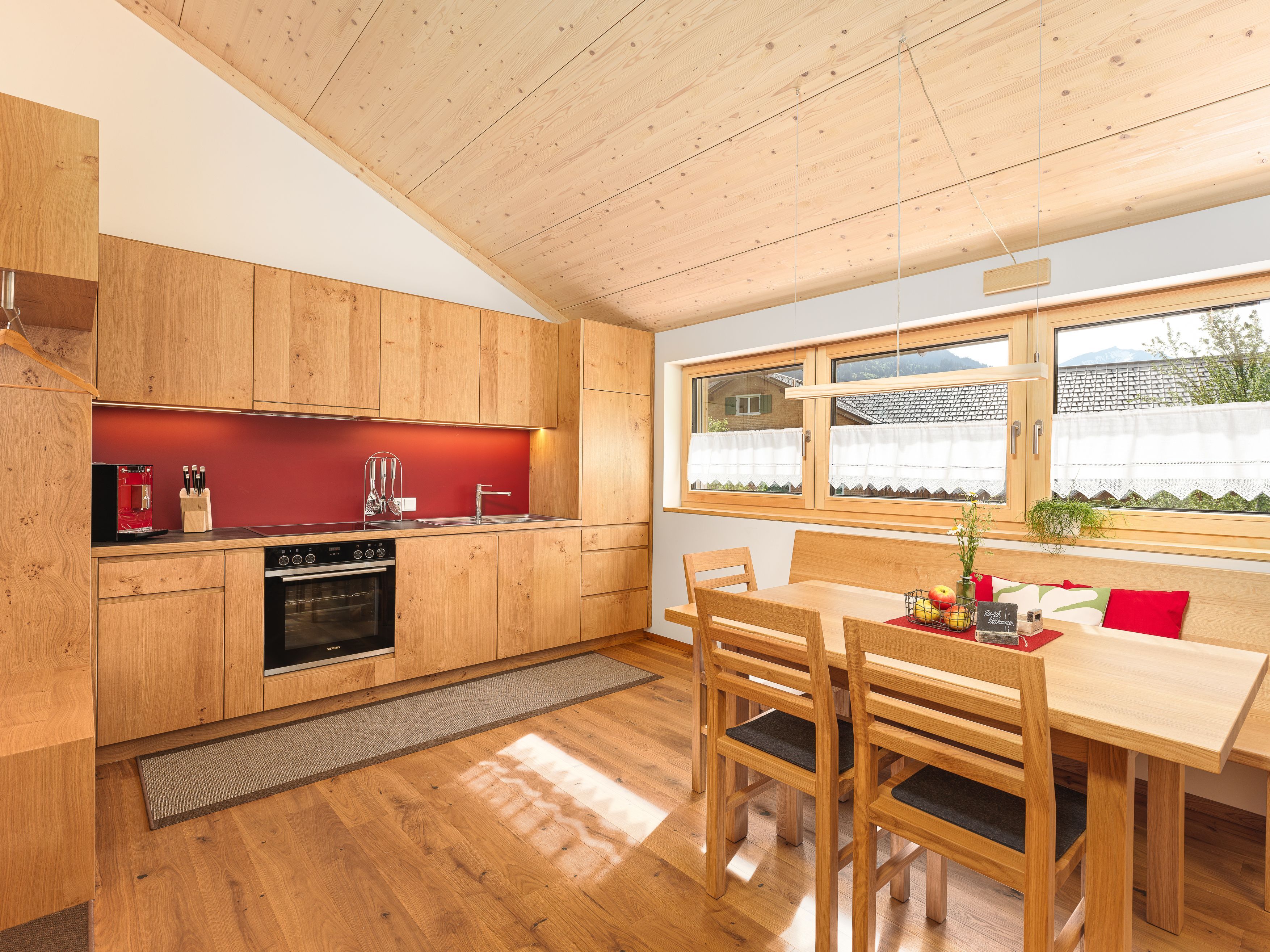 Gefertigt von heimischen Handwerkern, überzeugen die Möbel und die geölten Eichenparkettböden durch ihre Qualität. Fußbodenheizung und viel Holz schaffen eine besonders heimelige Atmosphäre.