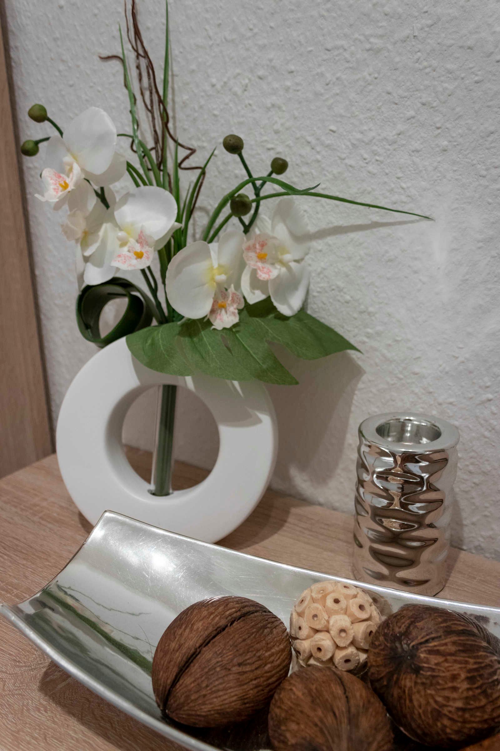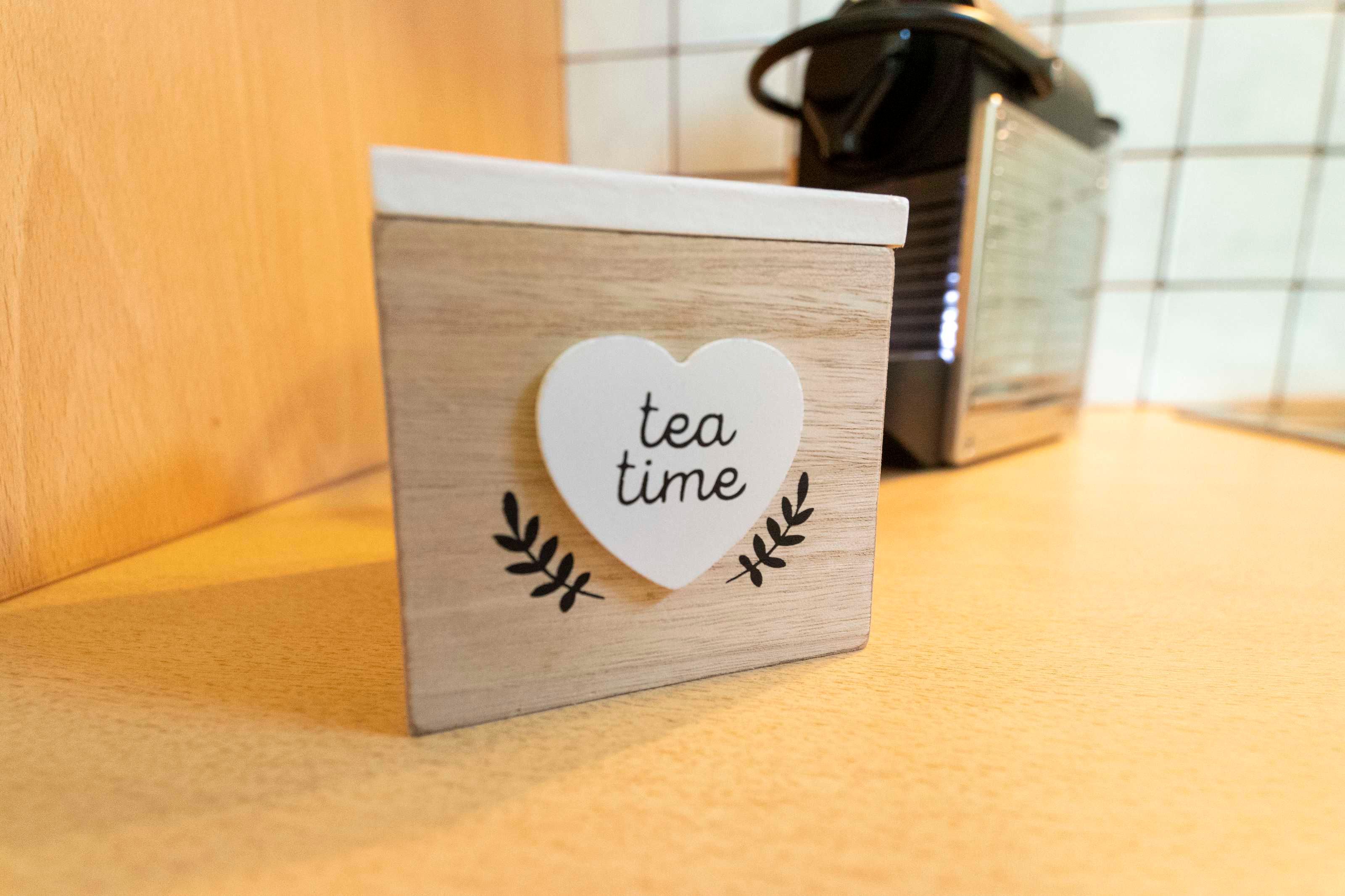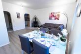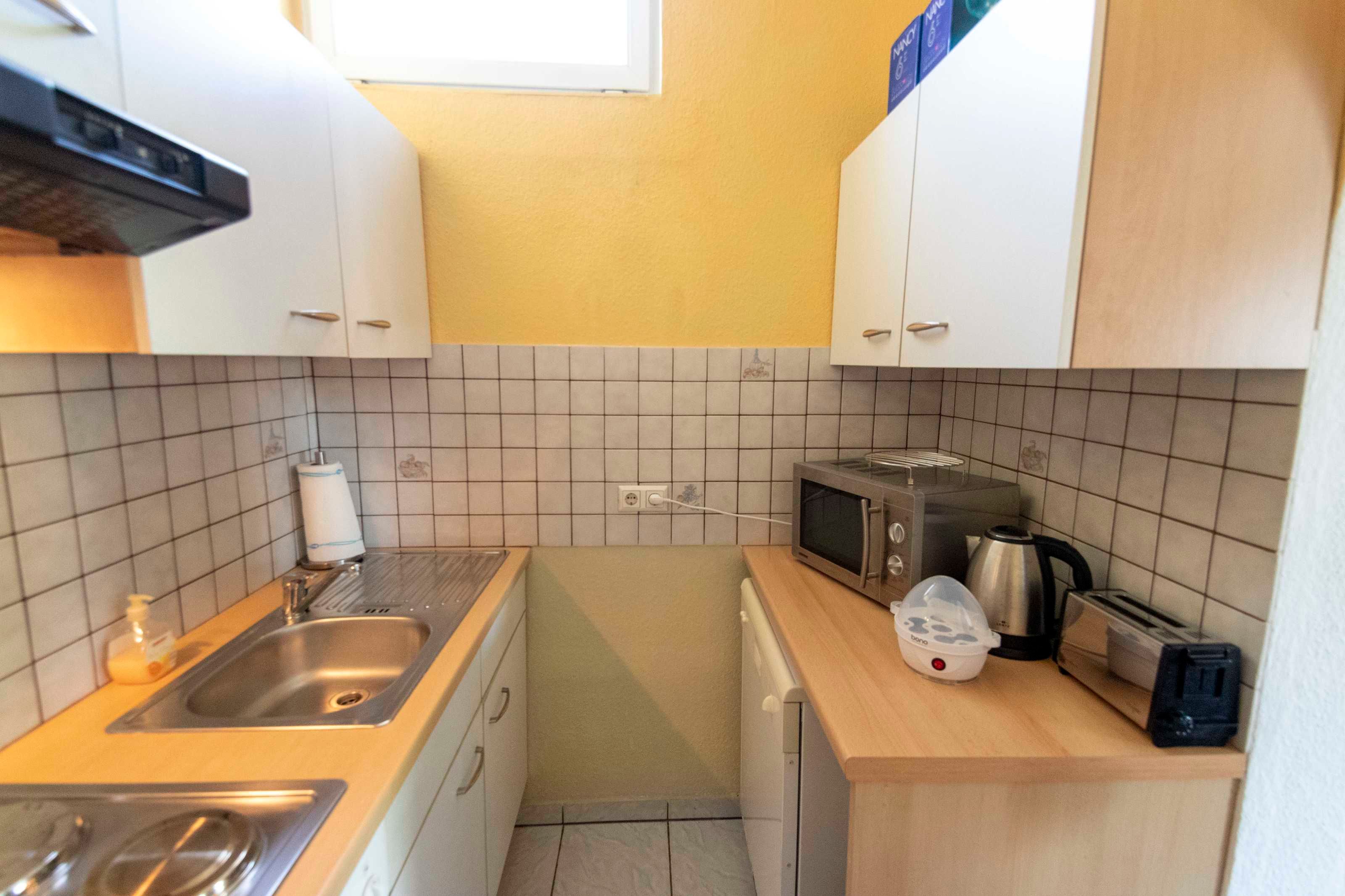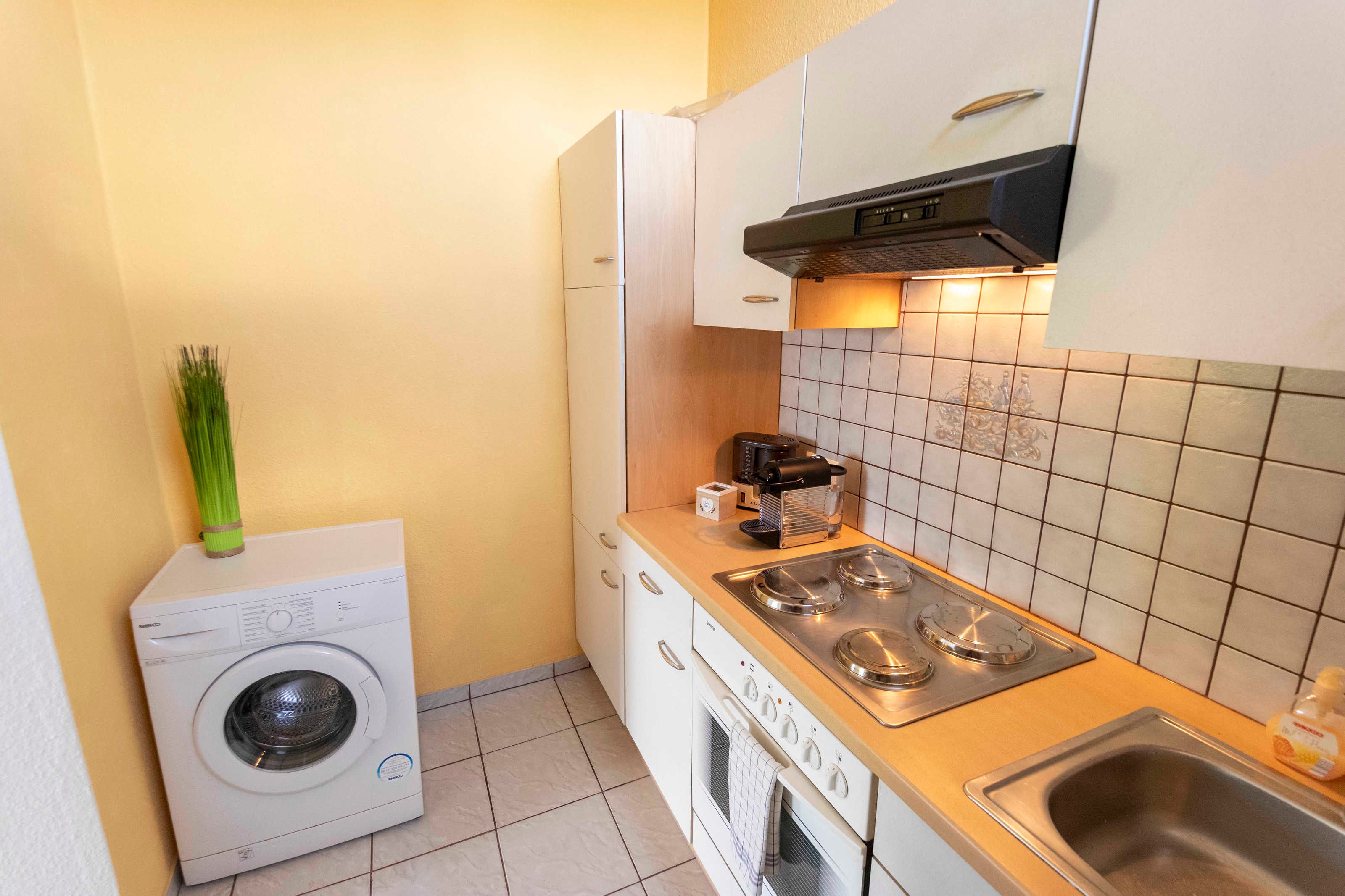 Die Küche ist komplett ausgestattet mit Herd, Backofen, Kühlschrank, Geschirrspüler, Mikrowelle, Nespresso-Kaffeemaschine, Wasserkocher, Eierkocher und natürlich sämtlichem Geschirr, Weingläsern, Töpfen und Pfannen. Weiters ist hier auch eine Waschmaschine vorhanden.