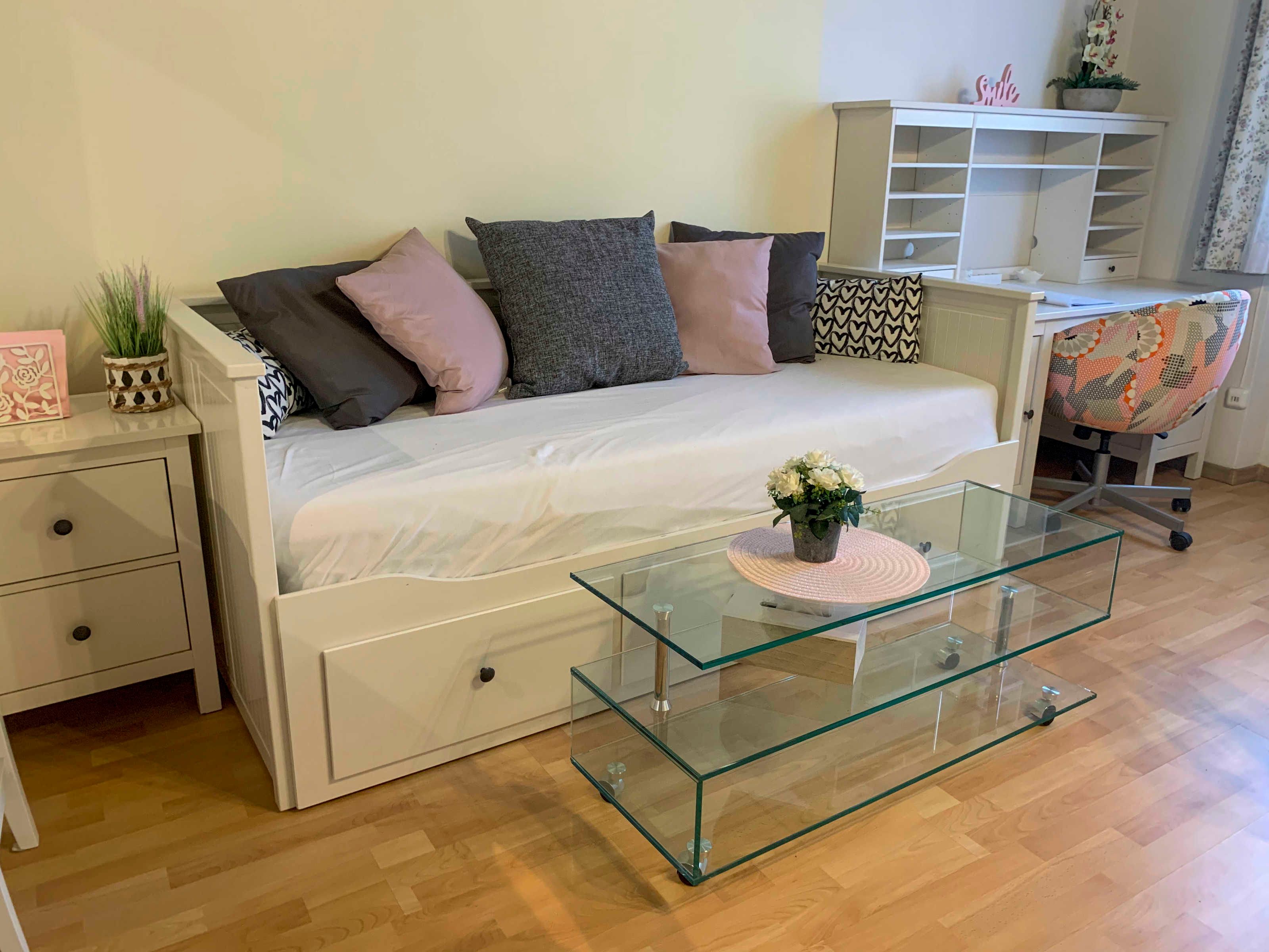 Der Wohnbereich ist mit einem gemütlichen, ausziehbaren Tagesbett ausgestattet. Dieses kann entweder als Einzelbett (80x200) genutzt werden oder als Doppelbett (160x200), wenn es ausgezogen ist.