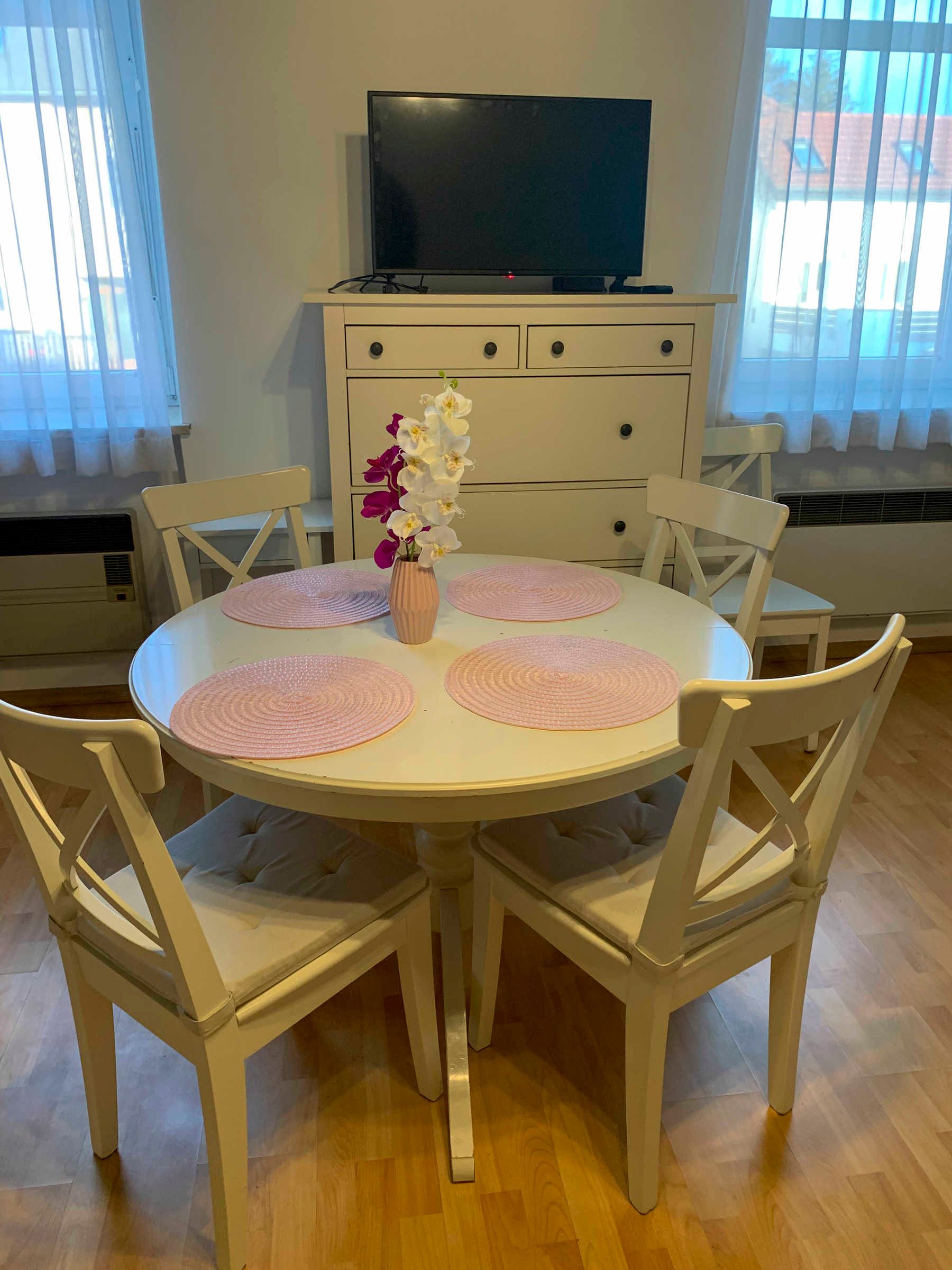 Der Essbereich bietet Platz für bis zu 6 Personen. Der Fernseher verfügt über Satelliten TV.