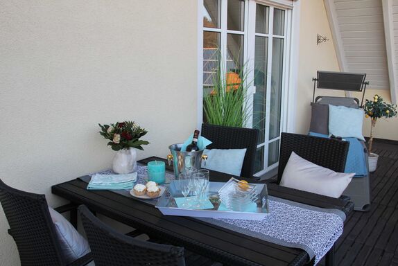 Balkon: Sitzgruppe, Liegestühle, Sonnenschirm, Wäscheständer