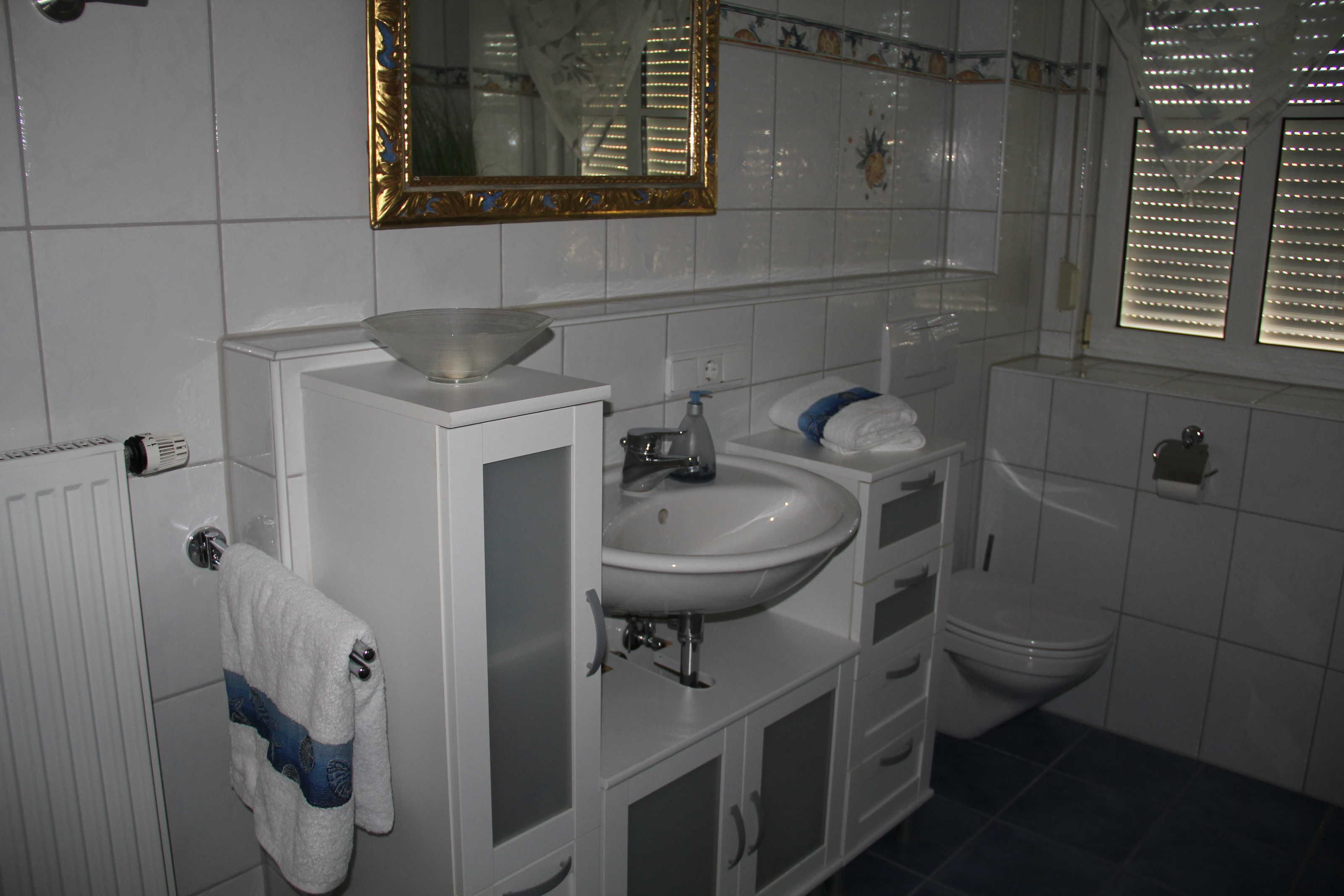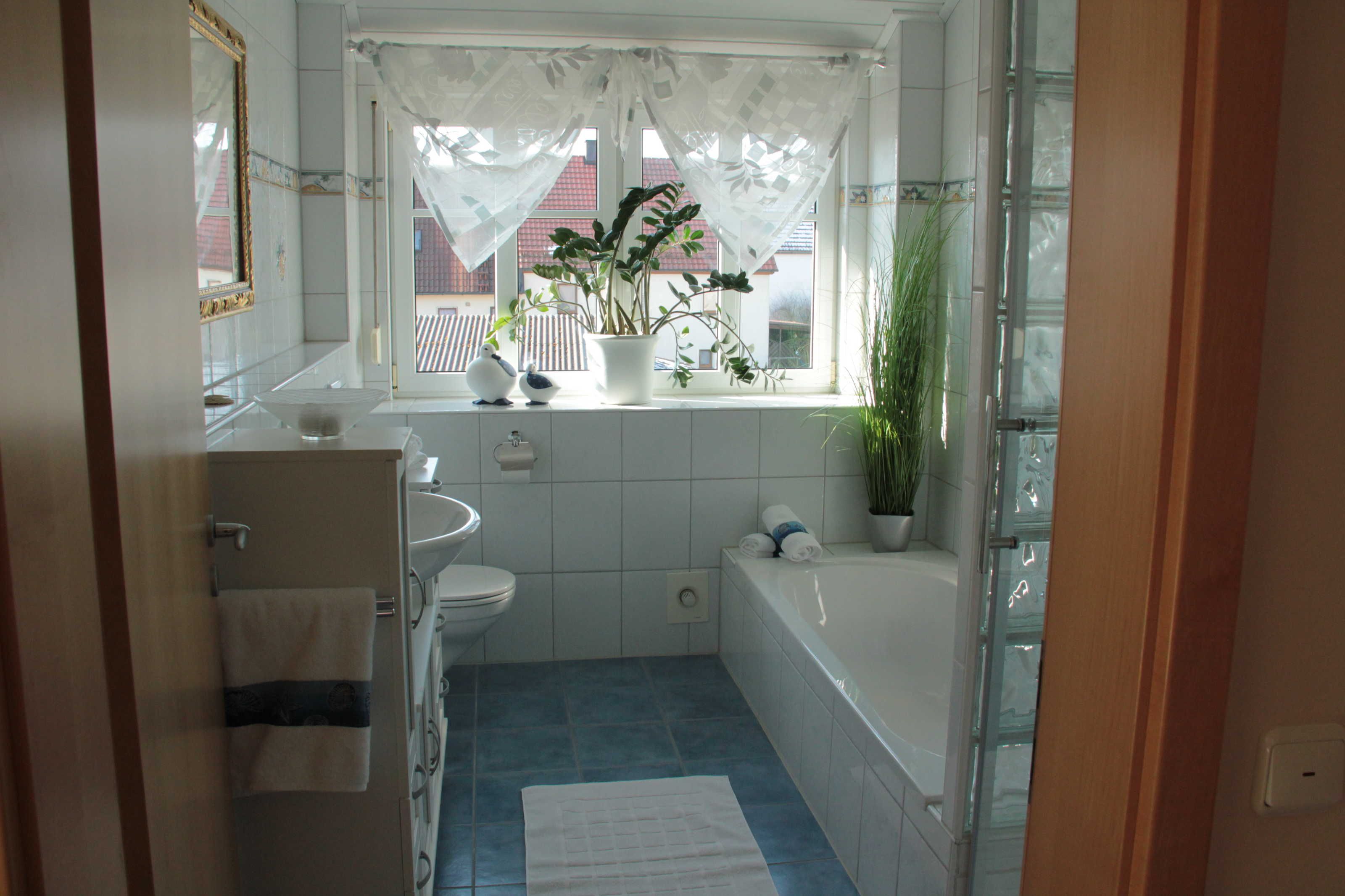 Tageslichtbad: Badewanne, Dusche, WC, Waschbecken, Bademöbel mit Kosmetikspiegel und Fön