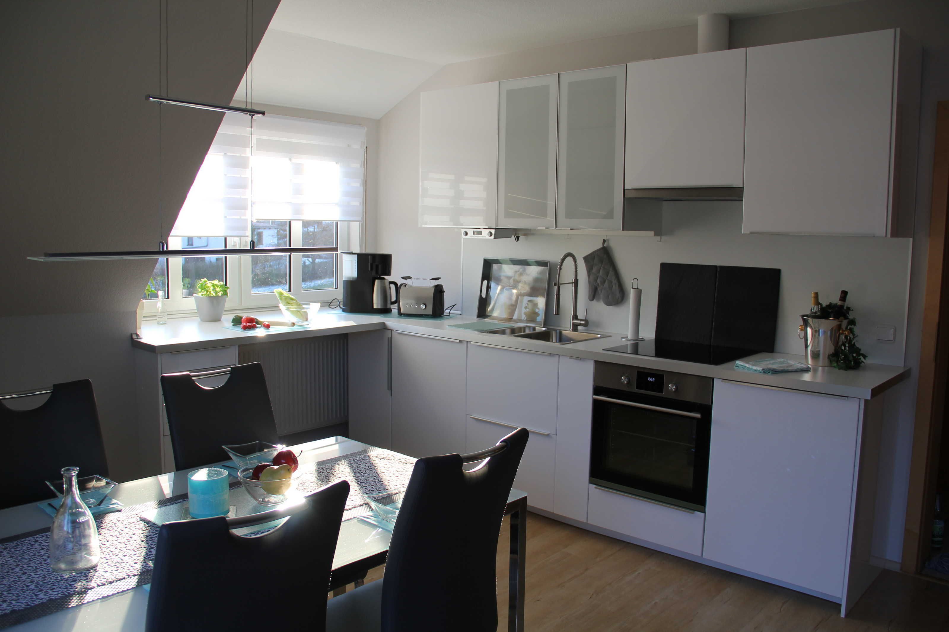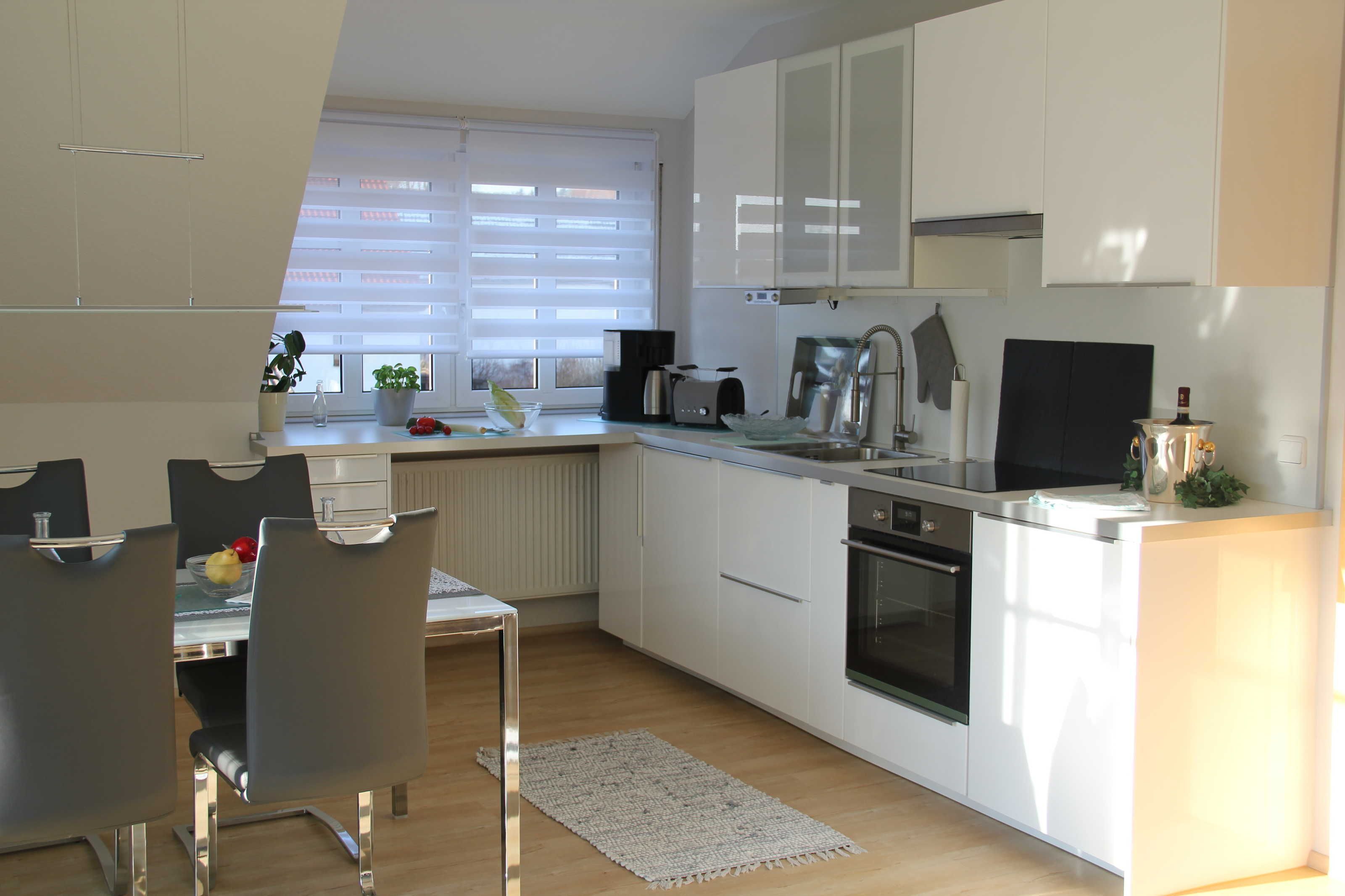 Küche: Geschirrspüler, Kühlschrank mit Gefrierfach, Herd mit Induktion und Backröhre, Mikrowelle, Kaffeemaschine, Wasserkocher, Toaster, Koch- und Essgeschirr (Grundausstattung Gewürze)