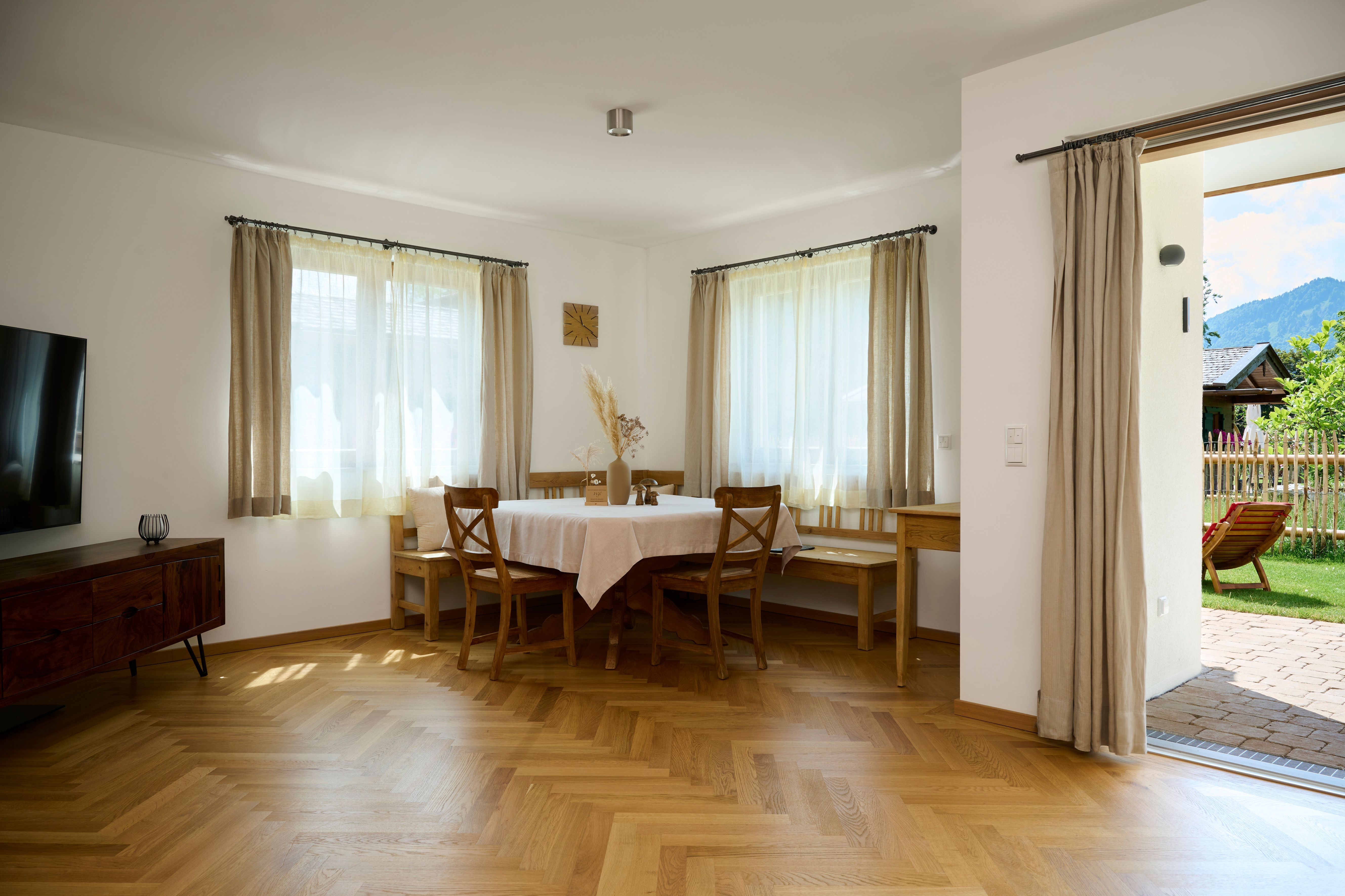 Alpine Lebensart gepaart mit schlichter Eleganz, bodenständig und luxuriös zugleich. Im Erdgeschoß gelegen, eigene Garten-Sauna, Parkettfußboden, Smart-TV, Nichtraucherwohnung, Panoramafenster mit Gartenterrasse, Boxspringbetten 180 x 200,Doppelbett 160x200 cm im zweiten Schlafzimmer, WC extra, hochwertige Küche, voll ausgestattet, Leihbademantel, Pflegeprodukte, Objekt in einer ruhigen Sackgasse.