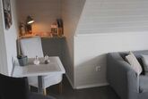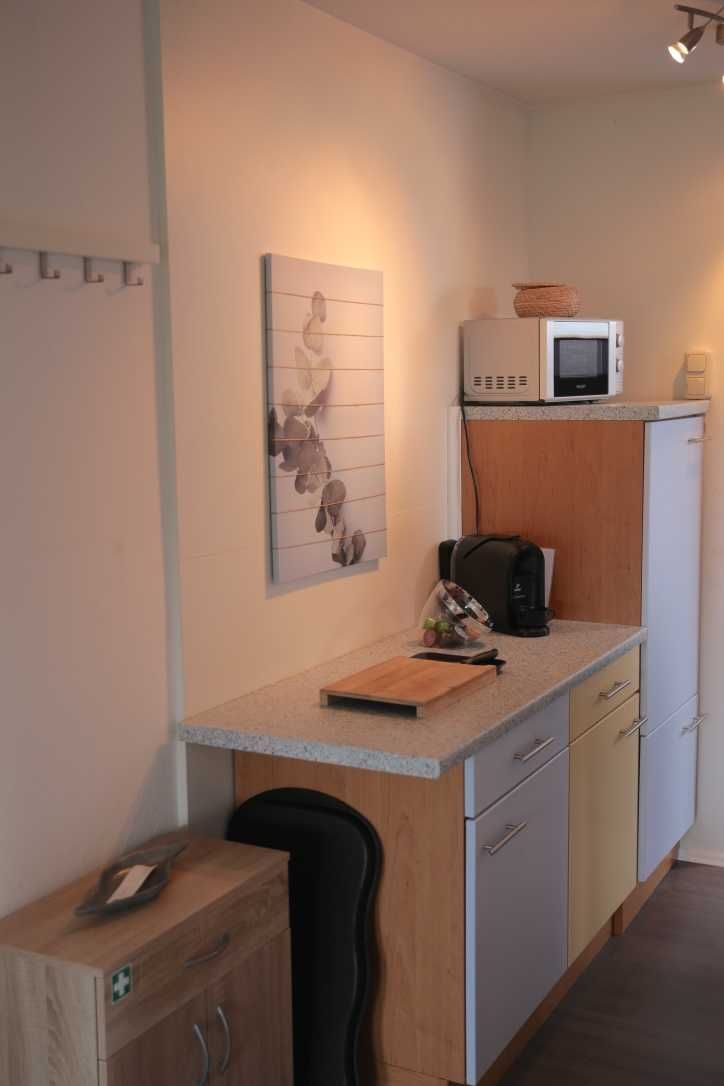 Kaffeemaschine, Tabs- Kaffeemaschine, Wasserkocher, Mikrowelle, Herd mit Backofen, Kühlschrank mit Gefrierfach. Das notwendige Geschirr sowie Geschirrtücher sind vorhanden, um nur einiges zu nennen.