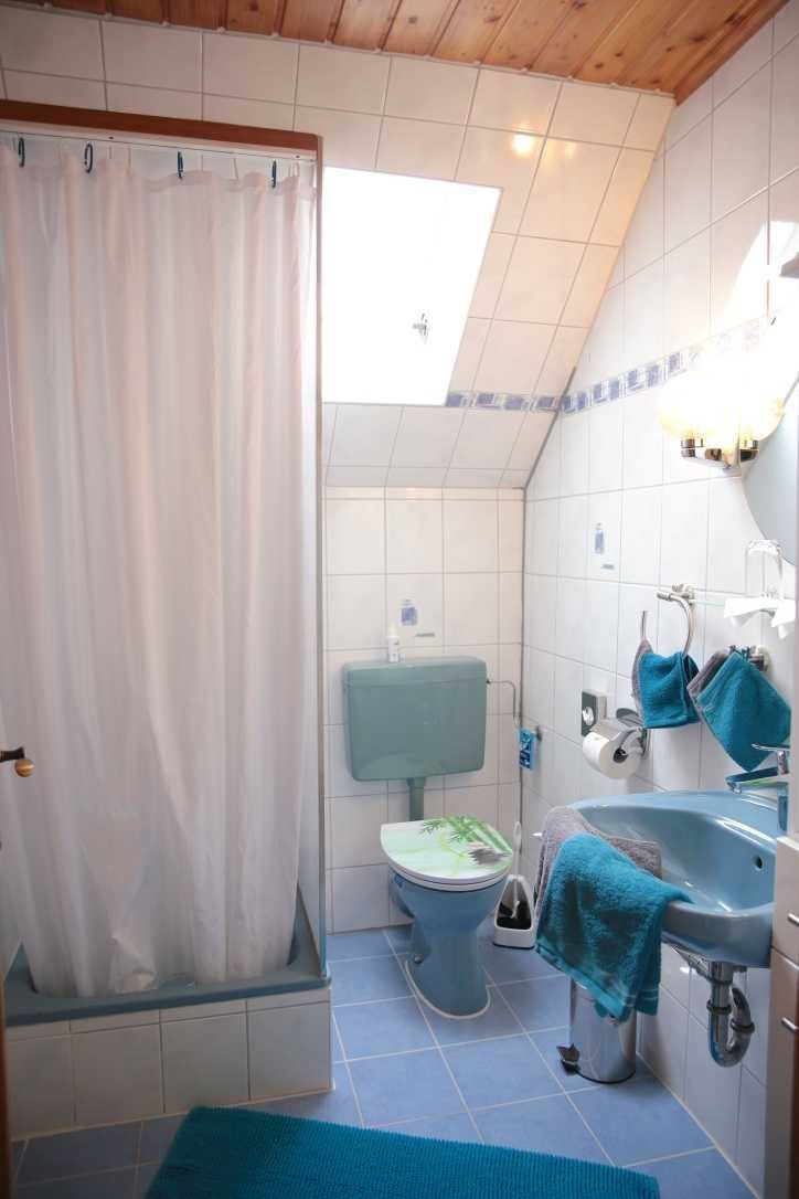 Das Badezimmer ist mit einer Dusche, WC und Waschbecken ausgestattet.