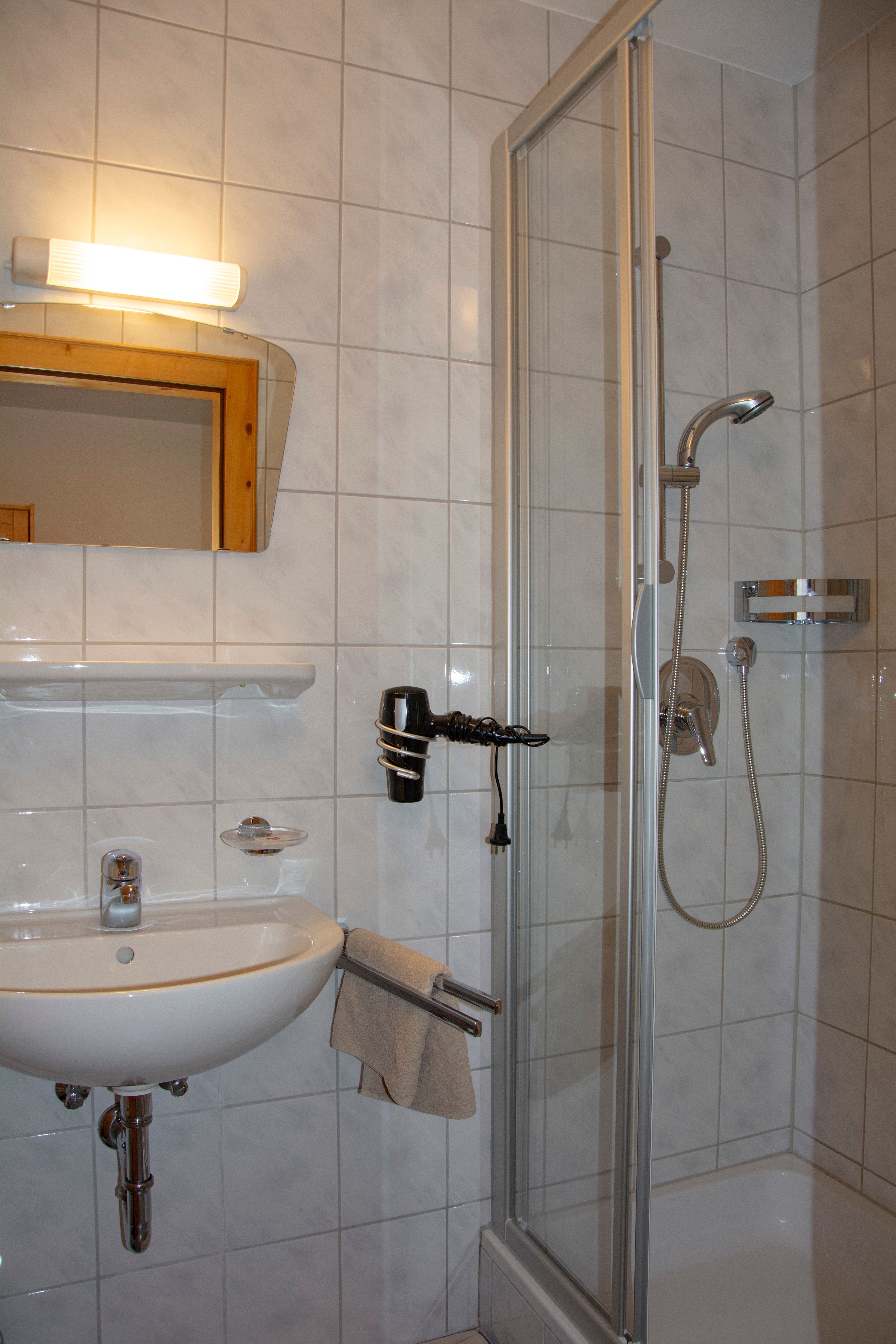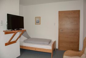 Dieses Einzelzimmer verfügt über einen Wohn-/Schlafbereich mit Einzelbett, Sitzgelegenheit und Sat-TV sowie ein Badezimmer mit Dusche und WC.