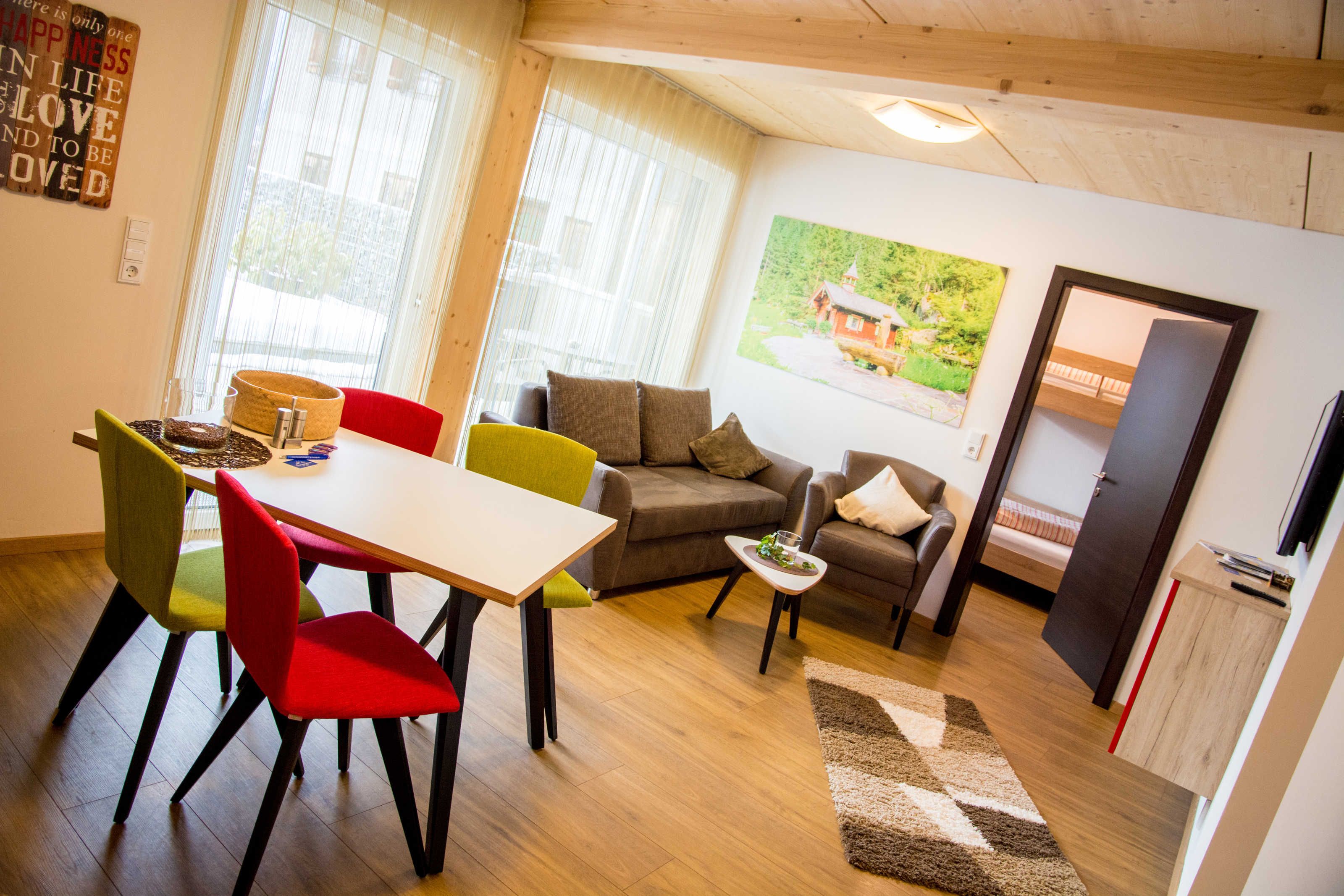 Die Apartments sind mit Holzmöbeln eingerichtet und verfügen über ein Schlafsofa, eine Küche mit einem Geschirrspüler, ein Bad mit einer Dusche und einer Badewanne sowie eine Terrasse mit Bergblick.