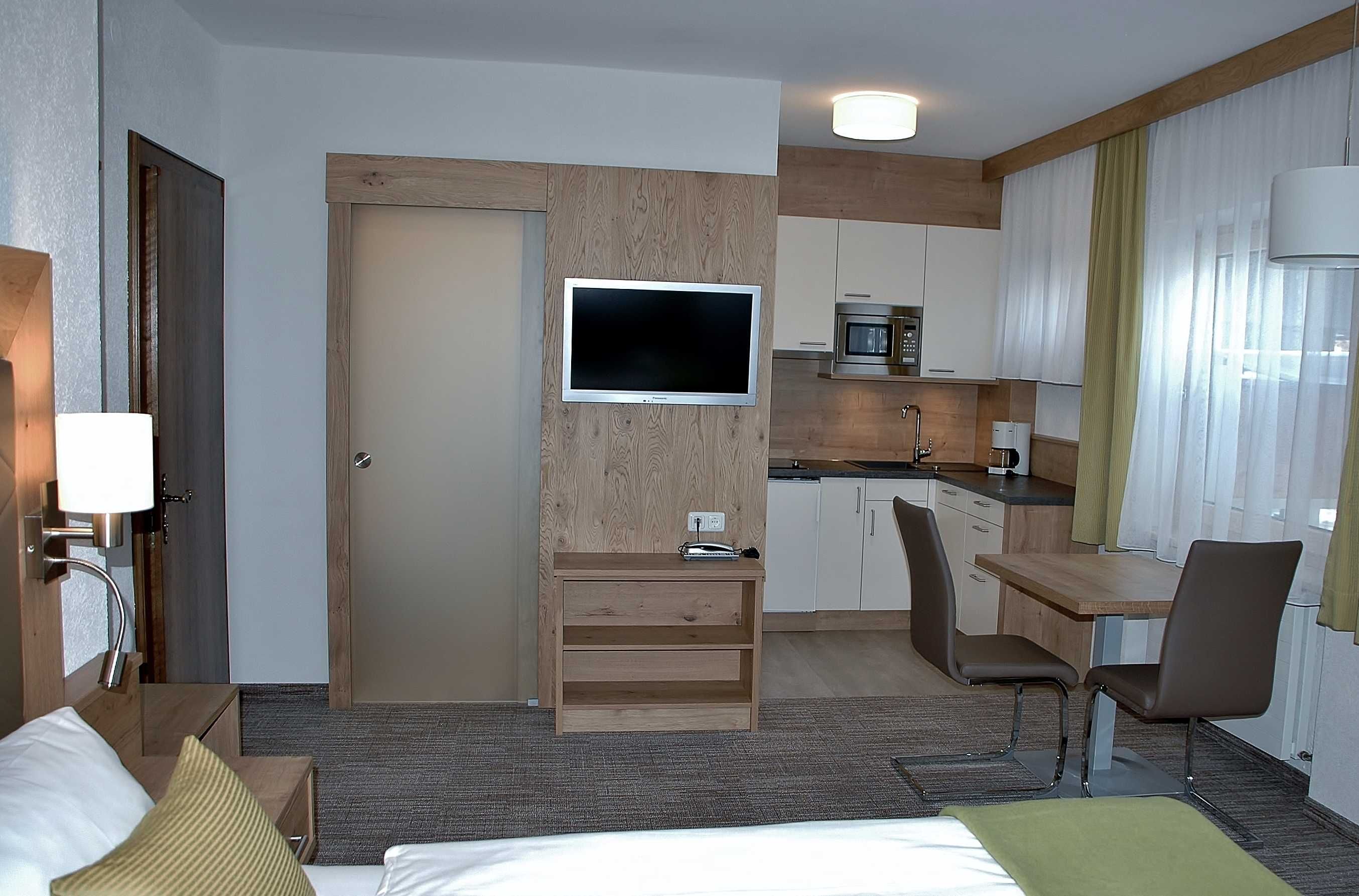 Helles Einraum-Appartement (ca. 30 m²) mit Morgensonne und Blick über Bach und Wiesen zum Neunerköpfle. Wohn-Schlafraum mit Doppelbetten, Sitz-und Essecke, Kochnische, Dusche/WC, Ostbalkon, TV/Radio, Telefon.