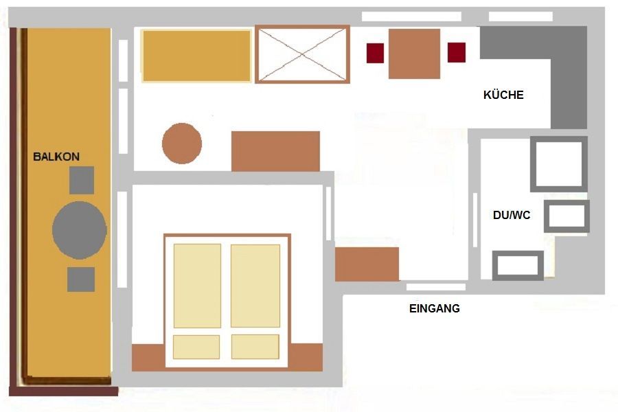 Helles Appartement ( ca. 35 m²) mit großem Westbalkon und Blick zur Roßalpe und in Richtung Vilsalpsee. Kleiner Wohnraum mit Sitzecke, Eßecke, Kochnische, DU/WC, Schlafraum, TV/Radio, Telefon.