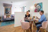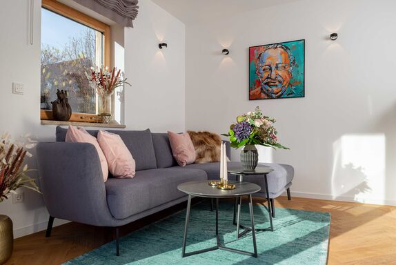 Unser Credo bei allen Überlegungen ist immer gewesen, dass unsere Gäste im Urlaub keineswegs schlechter wohnen möchten, als sie es von zu Hause aus gewohnt sind. Die mit viel Liebe und Herzblut ausgesuchte Einrichtung und Ausstattung hat einen Ort erschaffen, an dem man gerne ist und zu dem man gerne zurückkommt. Im Sinne einer möglichst allergikerfreundlichen Umgebung haben wir ausschließlich geöltes Fischgrät-Eichenparkett und keinen Teppichboden verlegt. Die Matratzen unseres hochwertigen Boxspringbettes sind in zwei unterschiedliche Härtegrade unterteilt, so dass auch der persönliche Schlafkomfort nicht zu kurz kommt. Die gesamte Wohnung ist mit elektrischen Rolläden und Vorhängen ausgestattet.