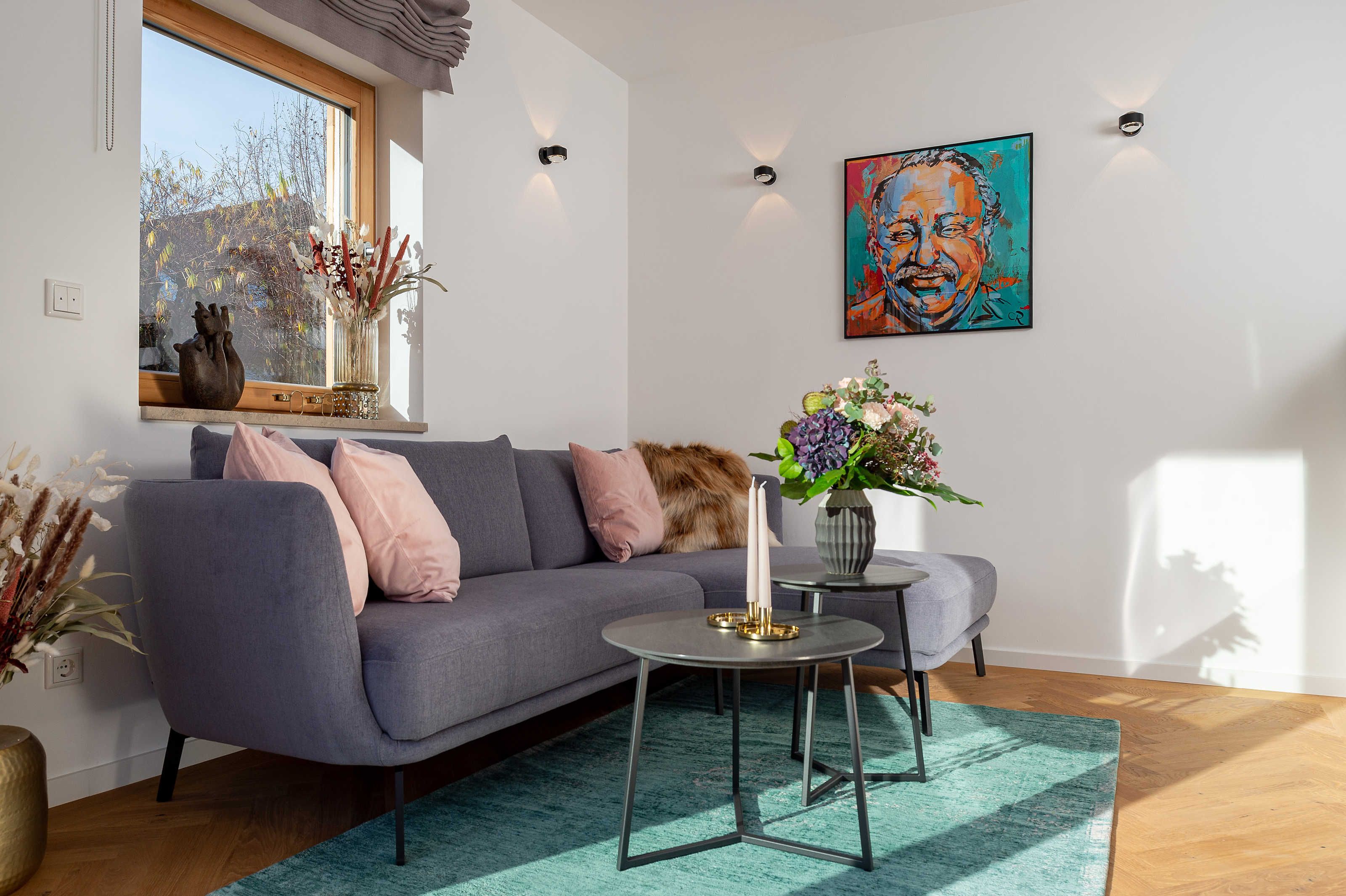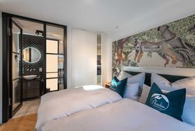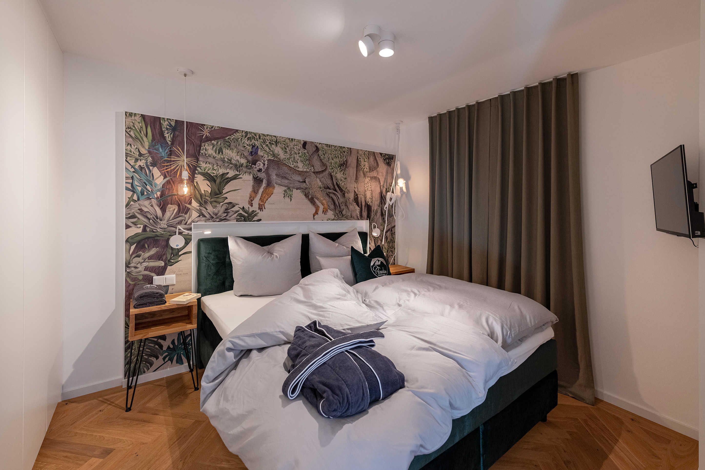 Italienische Designerlampen von Foscarini und weitere Designklassiker von Vitra und String sowie die Designmöbel aus der Schöner Wohnen Collection erfreuen Ihr Auge und Ihre Sinne ebenso wie das gemütliche Boxspringbett mit besten Matratzen, dass aussergewöhnliche Duschbad und die vollständige Ausstattung die keine Wünsche offen lässt.