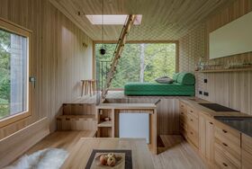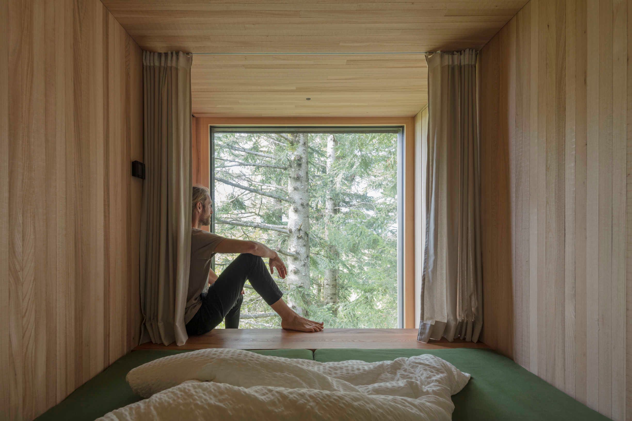 Im Baumhaus ist eine Schlafkoje für 2 Erwachsene Personen und eine französische Liege (120 x 200 cm). Außdem eine Dusche, WC, und eine komplett eingerichtete Küche.