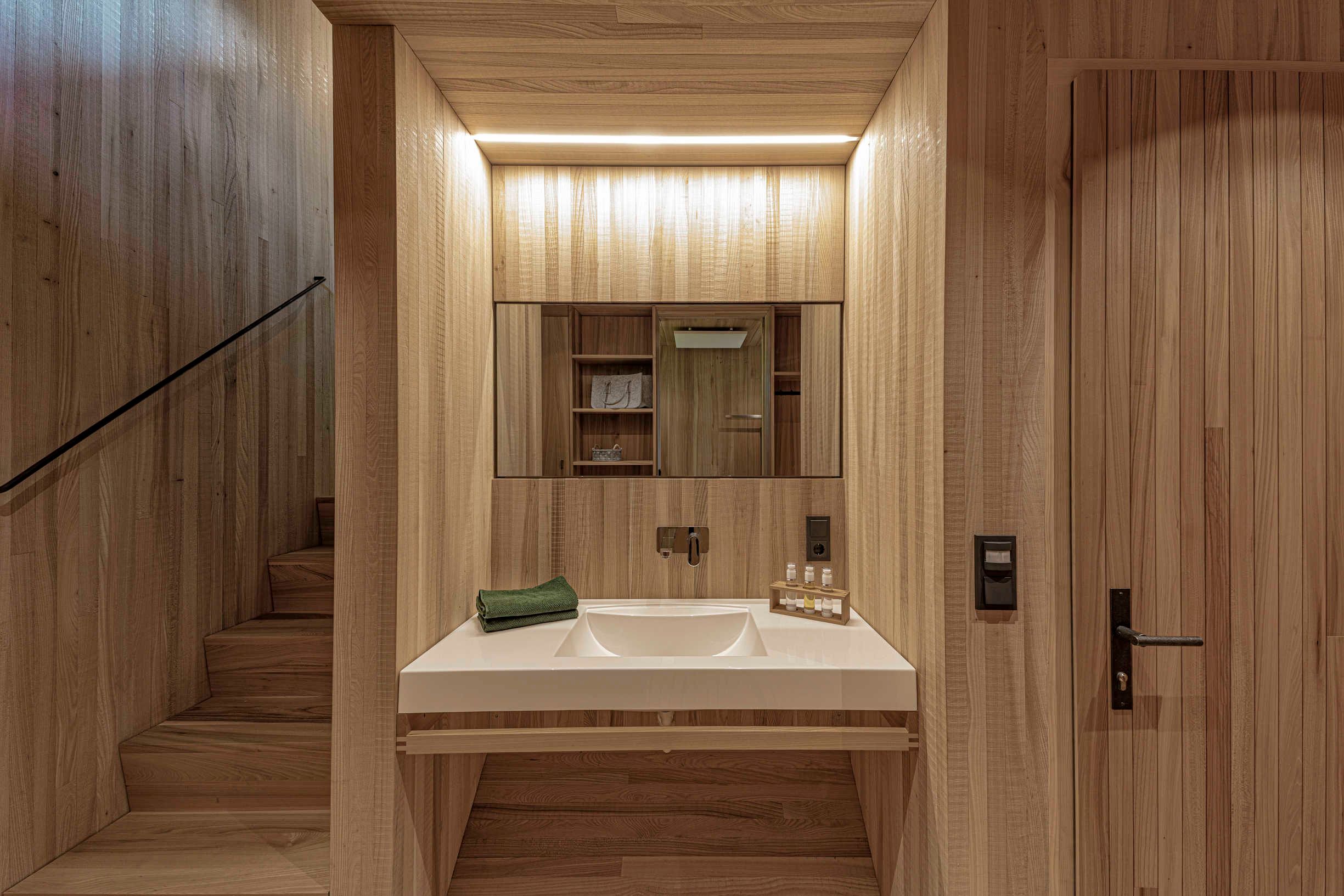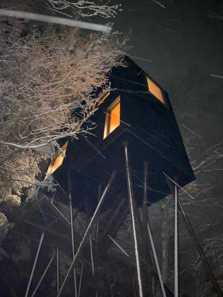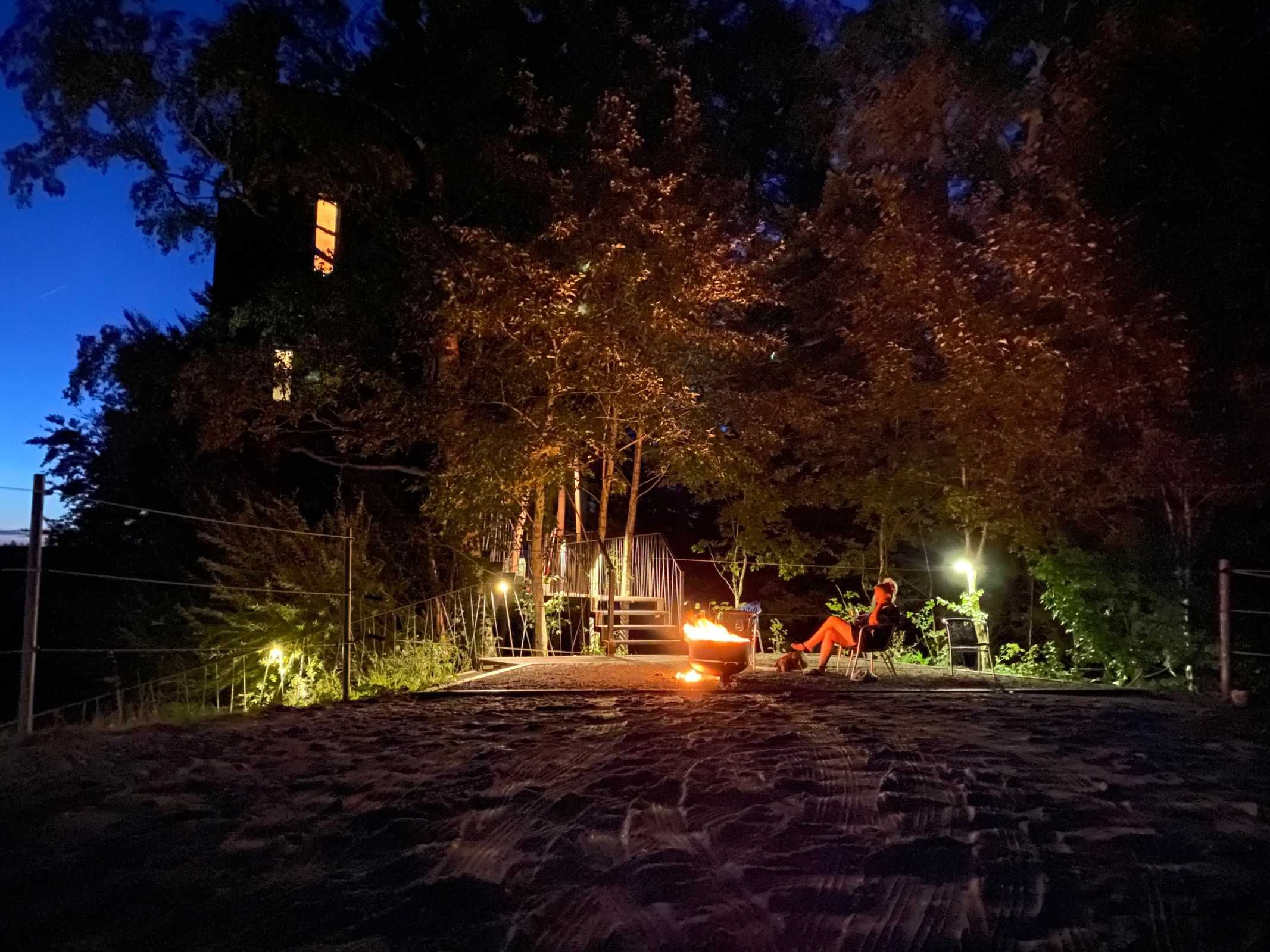 Zum Baumhaus gehört eine Terrasse, sowie ein Außenbereich mit Sitzgelegenheit und Grill. Das Haus ist ausgestattet mit einer Holzdusche und WC, Schlafzimmer, Küche mit Induktionsherd und Geschirrspüler, sowie einem Wohn- und Relaxbereich.
