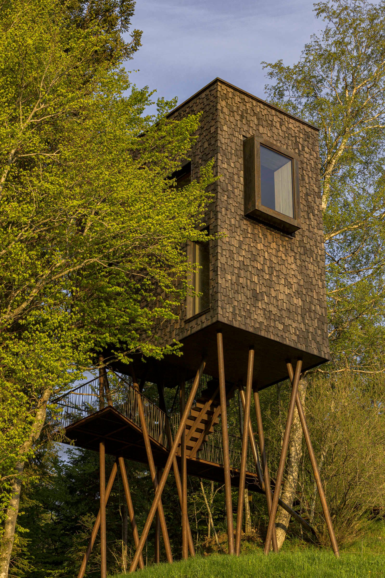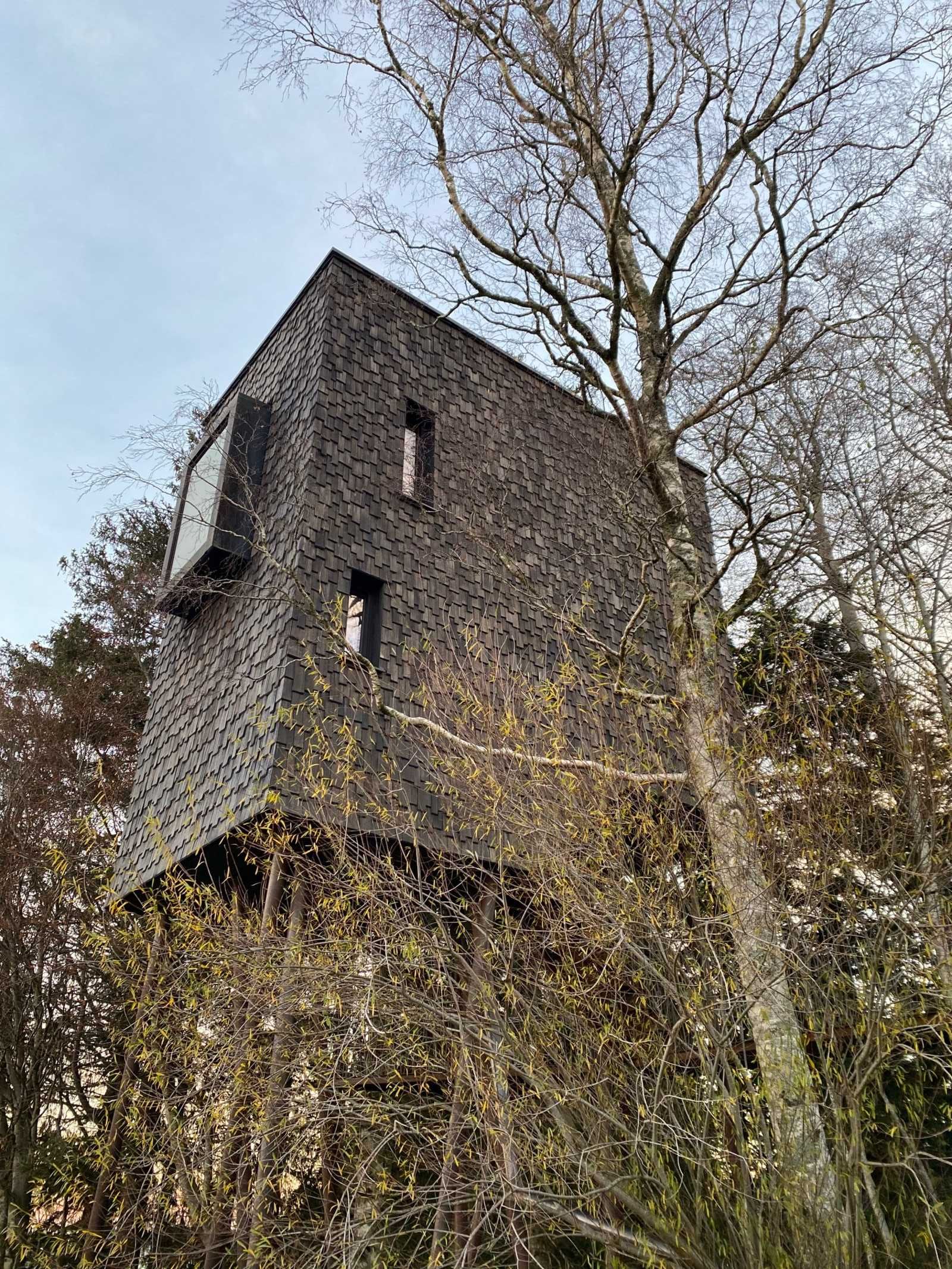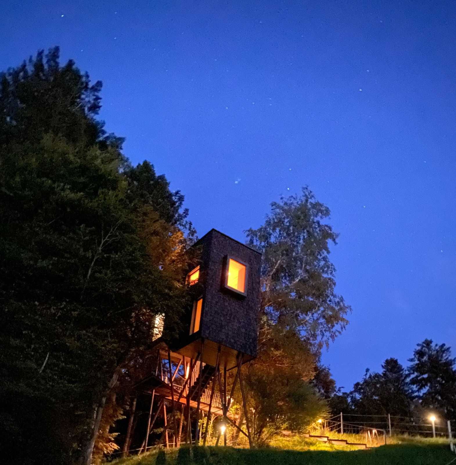 Unser Baumhaus wurde 2020 fertiggestellt. Es ist ein Holzbau auf Stahlsäulen mit einer Gesamthöhe von ca. 13 m. Außen hat das Häuschen eine Schindelfassade und innen ist es komplett aus heimischem Ulmenholz ausgebaut. Die Architektur wird Sie begeistern - ebenso die Ruhe und Aussicht.