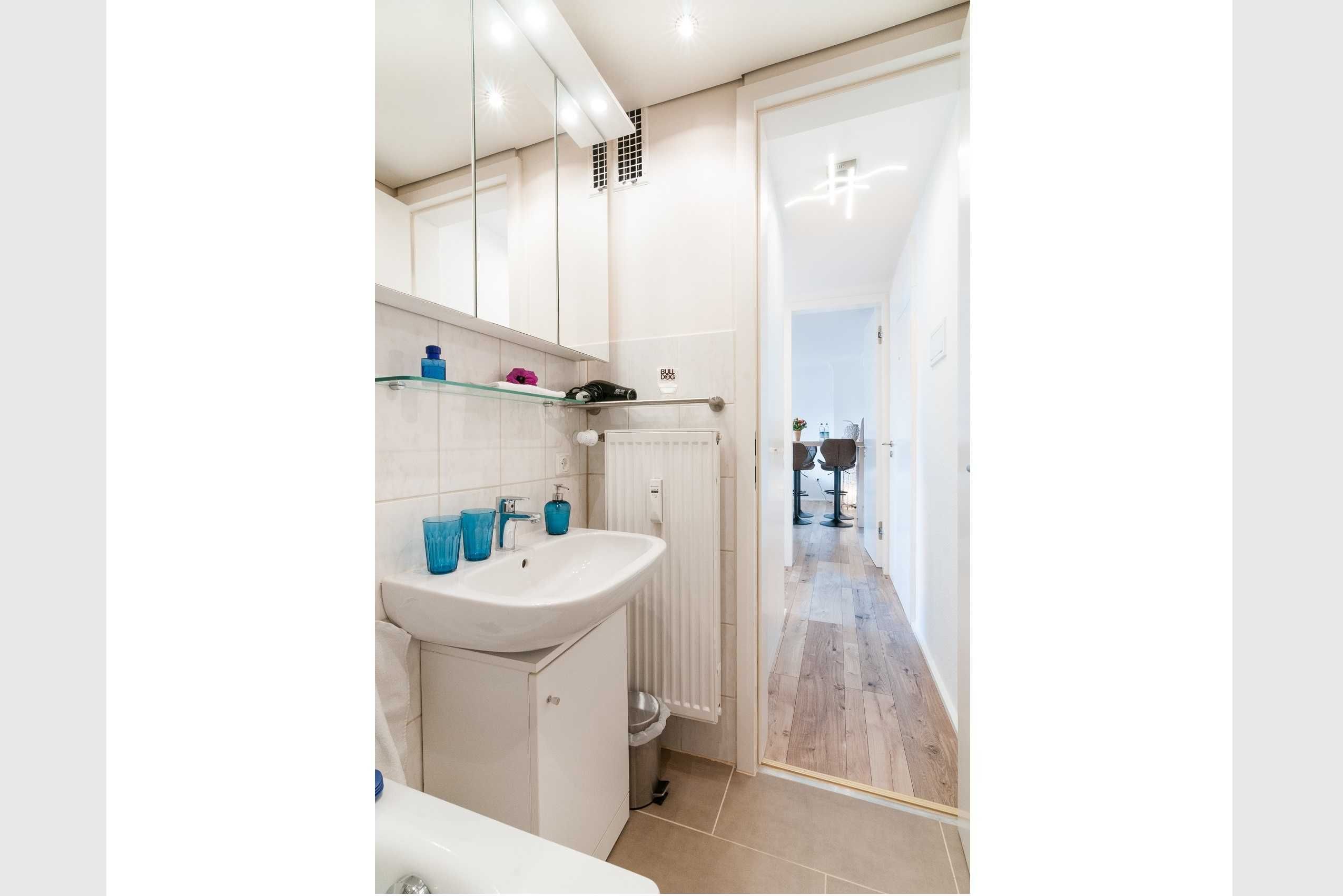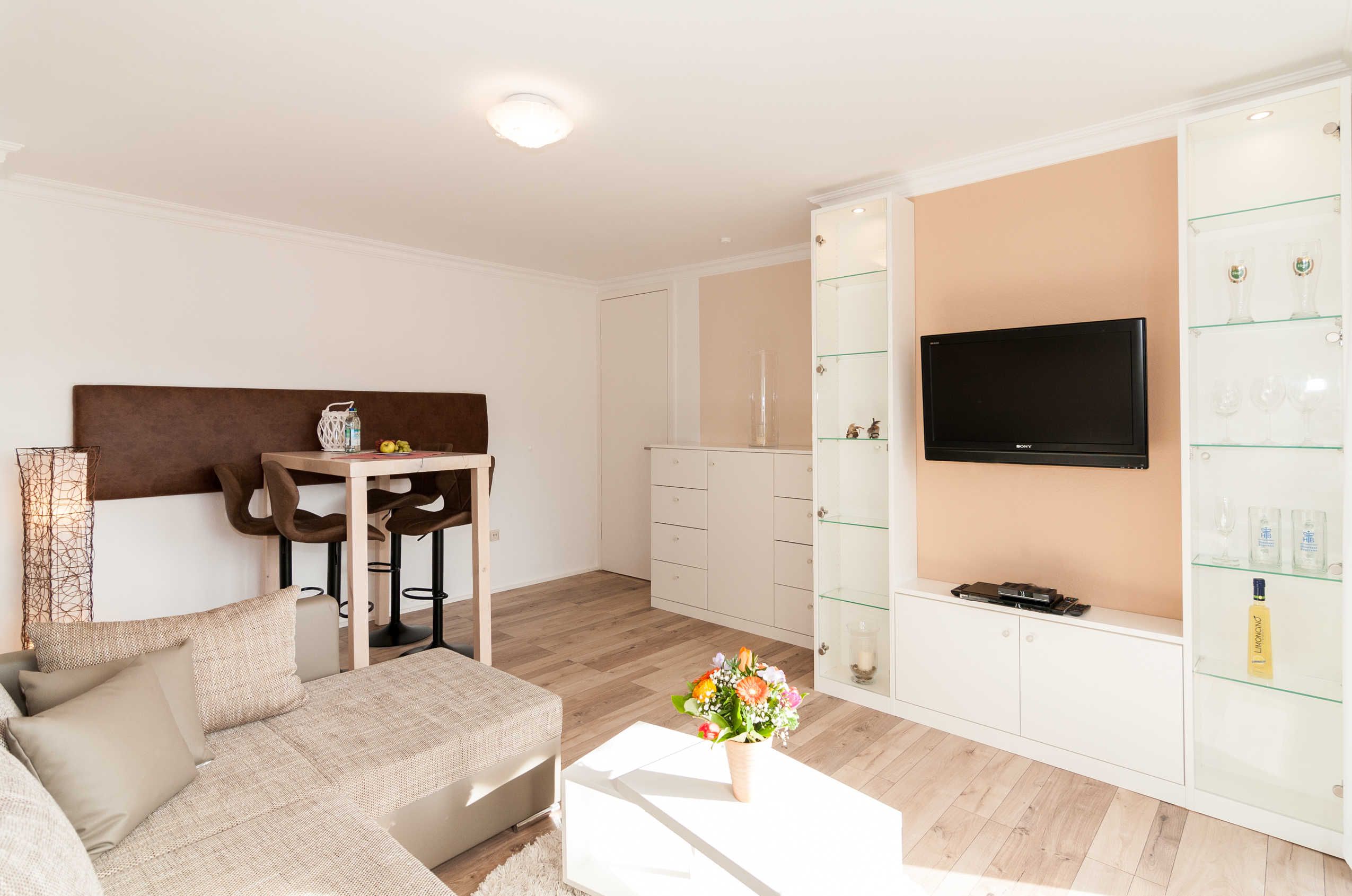 Die Wohnung verfügt über ein Wohnzimmer mit Schlafcouch, Flachbild-TV mit Satellitenanschluß und Internetzugang über W-Lan. Der Essbereich im Bistrostil mit Hochtisch und 4 verstellbaren Hochstühlen bietet Ihnen auch während des Frühstücks einen wunderbaren Ausblick. Das Schlafzimmer ist mit einem hochwertigen Vollholzbett mit USB-Ladevorrichtung und indirekter Beleuchtung ausgestattet. Der geräumige Kleiderschrank verfügt über einen Ganzkörperspiegel. Die kleine separate Küche ist neu, ein wahres Raumwunder und komplett ausgestattet. Das Badezimmer ist mit einer Wannendusche, Glastrennwand, WC und Waschgelegenheit ausgestattet. Der große Spiegelschrank bietet Ihnen ausreichend Platz für Ihre Utensilien.