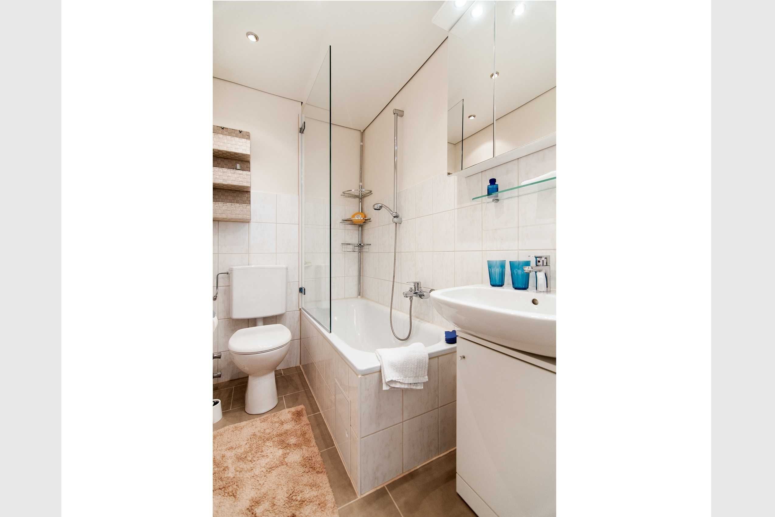 • Badezimmer mit Badewanne und Duschtrennwand, Waschbecken, Spiegelschrank, WC und Haartrockner