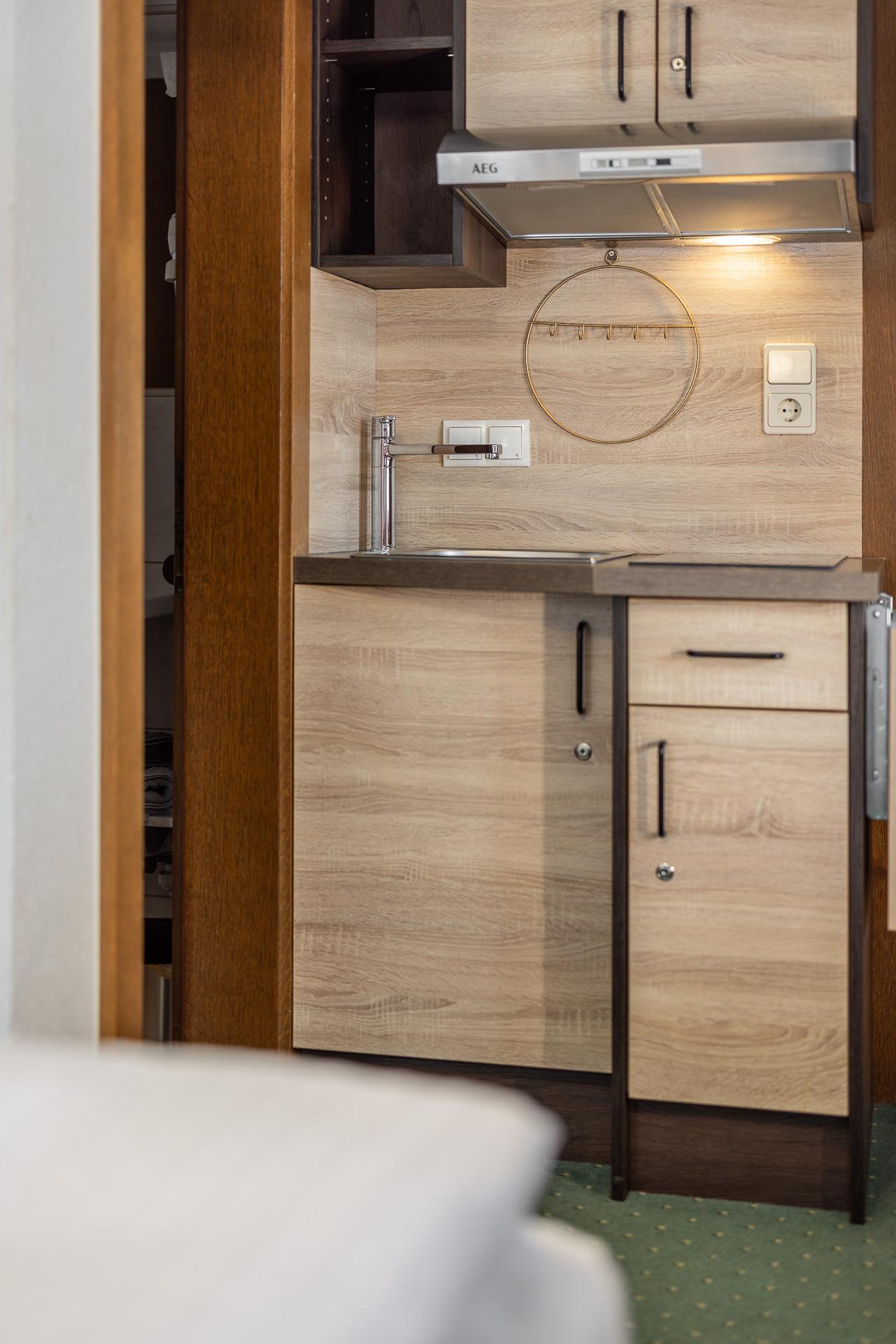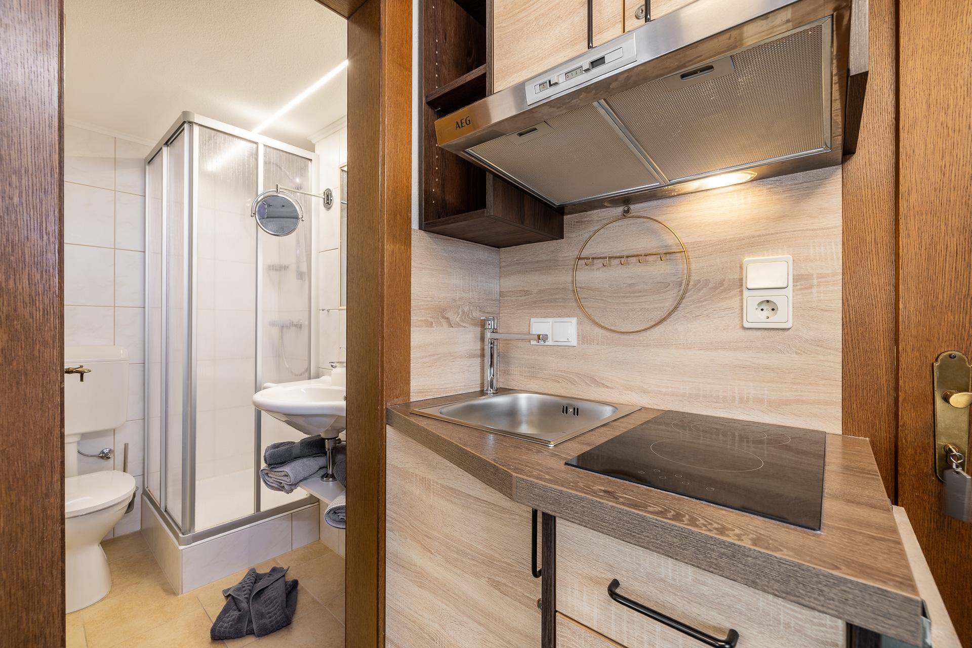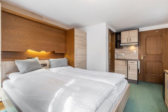 Modernes Studio, gemütliche Kocheck ausgestattet mit Spülmaschine, Mikrowelle (kein Backofen), Toaster, Kaffeemaschine, Wasserkocher uvm. Küchenutensilien, Wohn/Schlafzimmer, Dusche und WC,Flat-TV, Radio, Safe, freies W-Lan und Balkon. Größe: ca. 15 m².