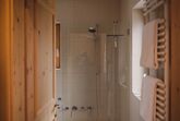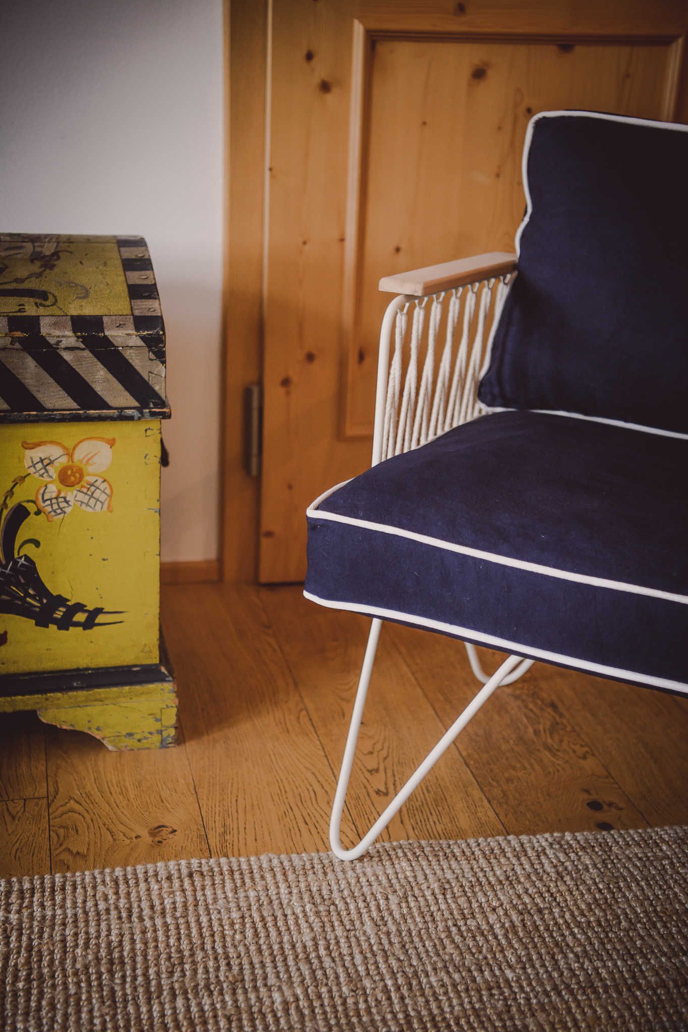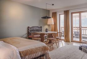 Neben einem Doppelbett (1,80m x 2m) ist der Raum mit einem Esstisch, 2 Stühlen, einem Kleider- und Wäscheschrank und 2 Sesseln möbliert. Das Bad ist mit einer Badewanne ausgestattet.